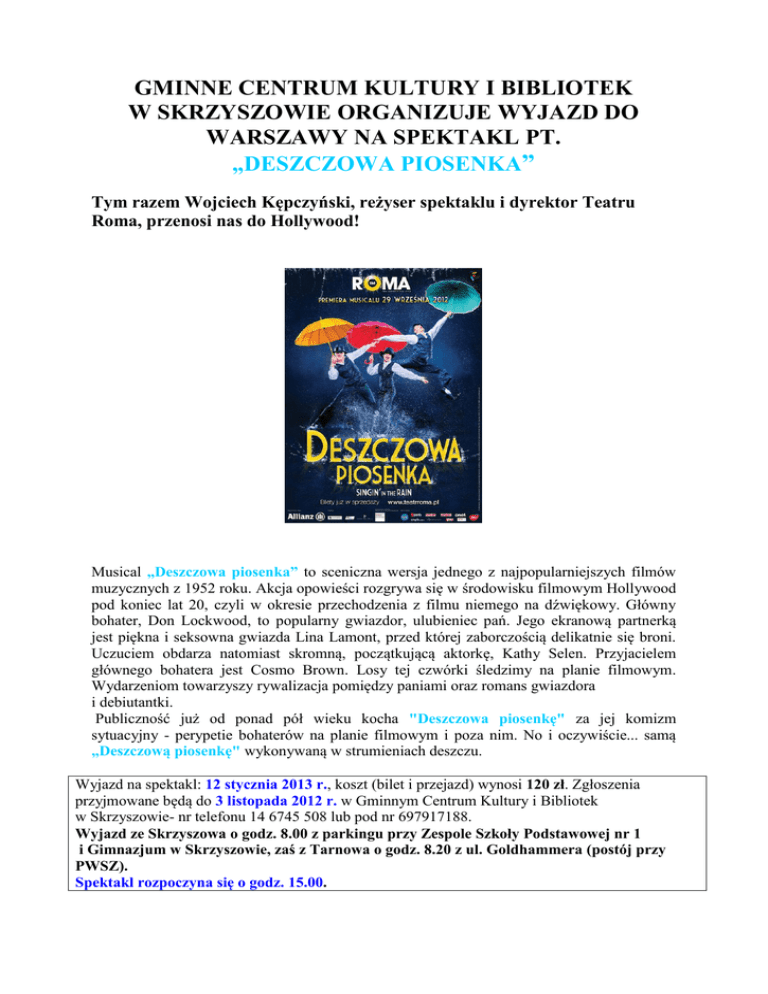 GMINNE CENTRUM KULTURY I BIBLIOTEK W SKRZYSZOWIE ORGANIZUJE WYJAZD DO WARSZAWY NA SPEKTAKL PT. „DESZCZOWA PIOSENKA” Tym razem Wojciech Kępczyński, reżyser spektaklu i dyrektor Teatru Roma, przenosi nas do Hollywood! Musical „Deszczowa piosenka” to sceniczna wersja jednego z najpopularniejszych filmów muzycznych z 1952 roku. Akcja opowieści rozgrywa się w środowisku filmowym Hollywood pod koniec lat 20, czyli w okresie przechodzenia z filmu niemego na dźwiękowy. Główny bohater, Don Lockwood, to popularny gwiazdor, ulubieniec pań. Jego ekranową partnerką jest piękna i seksowna gwiazda Lina Lamont, przed której zaborczością delikatnie się broni. Uczuciem obdarza natomiast skromną, początkującą aktorkę, Kathy Selen. Przyjacielem głównego bohatera jest Cosmo Brown. Losy tej czwórki śledzimy na planie filmowym. Wydarzeniom towarzyszy rywalizacja pomiędzy paniami oraz romans gwiazdora i debiutantki. Publiczność już od ponad pół wieku kocha "Deszczowa piosenkę" za jej komizm sytuacyjny - perypetie bohaterów na planie filmowym i poza nim. No i oczywiście... samą „Deszczową piosenkę" wykonywaną w strumieniach deszczu. Wyjazd na spektakl: 12 stycznia 2013 r., koszt (bilet i przejazd) wynosi 120 zł. Zgłoszenia przyjmowane będą do 3 listopada 2012 r. w Gminnym Centrum Kultury i Bibliotek w Skrzyszowie- nr telefonu 14 6745 508 lub pod nr 697917188. Wyjazd ze Skrzyszowa o godz. 8.00 z parkingu przy Zespole Szkoły Podstawowej nr 1 i Gimnazjum w Skrzyszowie, zaś z Tarnowa o godz. 8.20 z ul. Goldhammera (postój przy PWSZ). Spektakl rozpoczyna się o godz. 15.00.
