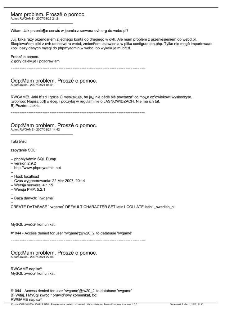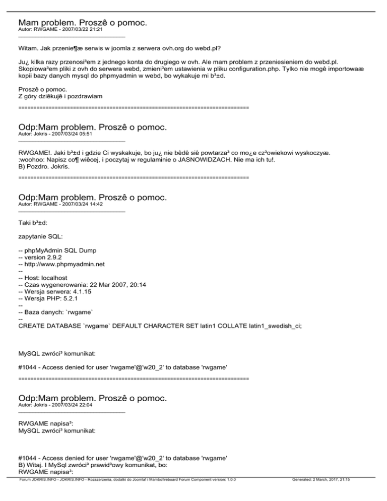 Mam problem. Proszê o pomoc. Autor: RWGAME - 2007/03/22 21:21 _____________________________________ Witam. Jak przenie¶æ serwis w joomla z serwera ovh.org do webd.pl? Ju¿ kilka razy przenosi³em z jednego konta do drugiego w ovh. Ale mam problem z przeniesieniem do webd.pl. Skopiowa³em pliki z ovh do serwera webd, zmieni³em ustawienia w pliku configuration.php. Tylko nie mogê importowaæ kopii bazy danych mysql do phpmyadmin w webd, bo wykakuje mi b³±d. Proszê o pomoc. Z góry dziêkujê i pozdrawiam ============================================================================ Odp:Mam problem. Proszê o pomoc. Autor: Jokris - 2007/03/24 05:51 _____________________________________ RWGAME!. Jaki b³±d i gdzie Ci wyskakuje, bo ju¿ nie bêdê siê powtarza³ co mo¿e cz³owiekowi wyskoczyæ. :woohoo: Napisz co¶ wiêcej, i poczytaj w regulaminie o JASNOWIDZACH. Nie ma ich tu!. B) Pozdro. Jokris. ============================================================================ Odp:Mam problem. Proszê o pomoc. Autor: RWGAME - 2007/03/24 14:42 _____________________________________ Taki b³±d: zapytanie SQL: -- phpMyAdmin SQL Dump -- version 2.9.2 -- http://www.phpmyadmin.net --- Host: localhost -- Czas wygenerowania: 22 Mar 2007, 20:14 -- Wersja serwera: 4.1.15 -- Wersja PHP: 5.2.1 --- Baza danych: `rwgame` -CREATE DATABASE `rwgame` DEFAULT CHARACTER SET latin1 COLLATE latin1_swedish_ci; MySQL zwróci³ komunikat: #1044 - Access denied for user 'rwgame'@'w20_2' to database 'rwgame' ============================================================================ Odp:Mam problem. Proszê o pomoc. Autor: Jokris - 2007/03/24 22:04 _____________________________________ RWGAME napisa³: MySQL zwróci³ komunikat: #1044 - Access denied for user 'rwgame'@'w20_2' to database 'rwgame' B) Witaj. I MySql zwróci³ prawid³owy komunikat, bo: RWGAME napisa³: Forum JOKRIS.INFO - JOKRIS.INFO - Rozszerzenia, dodatki do Joomla! i Mambofireboard Forum Component version: 1.0.0 Generated: 2 March, 2017, 21:15 CREATE DATABASE `rwgame` DEFAULT CHARACTER SET latin1 COLLATE latin1_swedish_ci; ...chcesz utworzyæ bazê danych na ju¿ utworzonej bazie. Przecie¿ j± chyba masz, prawda?. Usuñ tê linijkê z pliku z baz± danych. Przecie¿ sposób eksportu i importu baz danych by³ ju¿ opisywany na tym Forum. I ja nie pamiêtam, aby na 60 FREE by³ taki wpis w pliku eksportu SQL. B) Podejrzewam, ¿e zrobi³e¶ zrzut do pliku tekstowego ".txt", zamiast do pliku w formacie SQL ".sgl". Powiniene¶ zaznaczyæ pole "Zapisz jako plik", i wówczas przegl±darka automatycznie pobierze Ci zrzut bazy SQL na dysk. Bêdzie to np. plik o nazwie "rwgame.sql". Jest te¿ drugi sposób na uzyskanie pliku SQL, ale to tylko w przypadku, je¶li by¶ nie zaznaczy³ wcze¶niej pola "Zapisz jako plik". Po wykonaniu "Eksportu" bazy w panelu phpMyAdminia skopiuj tre¶æ bazy do np. Notatnika SP, i zapisz j± na dysku jako plik SQL. Notatnik SP automatycznie utworzy Ci prawid³owe rozszerzenia pliku. Pisa³e¶ ¿e ju¿ kilka razy przenosi³e¶ bazê z serwera na serwer, i jak Ci siê to udawa³o?. Chyba mia³e¶ farta. :laugh: Podczas importowania pliku do nowej bazy w polu "Import", zlokalizuj wyeksportowany plik "rwgame.sql" i tu ju¿ metod± prób i b³êdów ustaw opcjê "Zestaw znaków dla pliku:" na wstêpnie domy¶lne, czyli jak tam masz w rozwijalnym polu wyboru (na 60 FREE jest utf-8). Po udanej operacji wystartuj stronê, i zobacz, czy masz polskie znaki. Je¶li nie masz, tylko same ? - "pytajniki", wówczas usuñ wszystkie tabele z bazy danych, czyli wyczy¶æ j±, i spróbuj wykonaæ ponowny "import", ale ju¿ z innym zestawem znaków w polu "Zestaw znaków dla pliku:", np. "latin 1", bo to jest najczê¶ciej stosowany zestaw znaków w bazach danych. Te operacje mo¿esz wykonywaæ spokojnie, bo przecie¿ to jest nowa strona, i nic nie stracisz, kasuj±c bazê danych. Oczywi¶cie, przy za³o¿eniu, ¿e masz prawid³owo skopiowane pliki ze starej strony na now±. "Trening czyni mistrza", jak mawiali staro¿ytni Rosjanie! :woohoo: :woohoo: :woohoo: B) Je¶li bym siê myli³ w powy¿szych poradach, a pewnie siê nie mylê, to komunikat: #1044 - Access denied for user: 'username@localhost' to database 'database' ...informuje nas te¿ i o tym, ¿e podali¶my z³e has³o, login lub nazwê bazy danych. Je¶li zmieni³e¶ wcze¶niej has³o do Twojej bazy danych, np. w jakimi¶ Panelu Kontrolnym typu C-panel lub Menager ( chyba co¶ takiego tam maja? ) i rozpocz±³e¶ operacjê "Importu" bazy SQL, to móg³ zaistnieæ przypadek, ¿e operacja zmiany has³a nie dosz³a jeszcze do skutku, a Ty logowa³e¶ siê z "rozpêdu" do nowej bazy ze starym has³em. Sprawd¼ i tê mo¿liwo¶æ. To jest te¿ porada dla wszystkich innych, którzy przenosz± strony. :cheer: To tyle, co mogê Ci doradziæ. Opisz, co zdzia³a³e¶. Pozdro. Jokris. ============================================================================ Forum JOKRIS.INFO - JOKRIS.INFO - Rozszerzenia, dodatki do Joomla! i Mambofireboard Forum Component version: 1.0.0 Generated: 2 March, 2017, 21:15