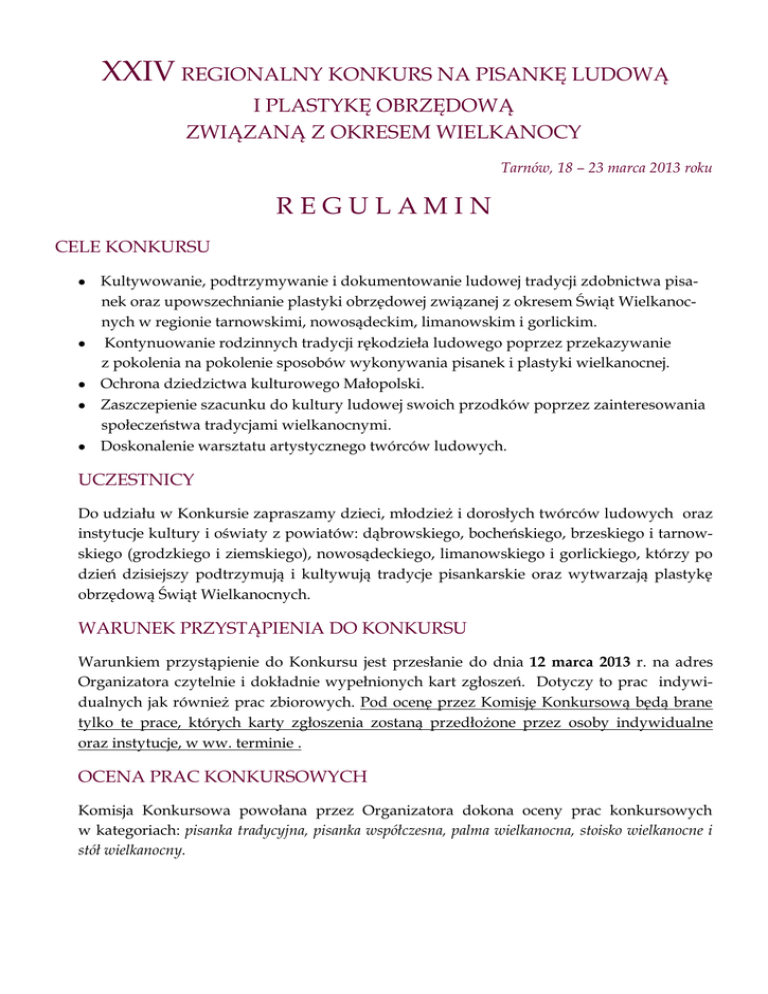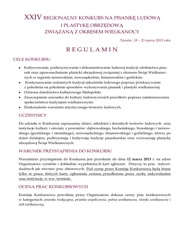 XXIV REGIONALNY KONKURS NA PISANKĘ LUDOWĄ I PLASTYKĘ OBRZĘDOWĄ ZWIĄZANĄ Z OKRESEM WIELKANOCY Tarnów, 18 – 23 marca 2013 roku REGULAMIN CELE KONKURSU Kultywowanie, podtrzymywanie i dokumentowanie ludowej tradycji zdobnictwa pisanek oraz upowszechnianie plastyki obrzędowej związanej z okresem Świąt Wielkanocnych w regionie tarnowskimi, nowosądeckim, limanowskim i gorlickim. Kontynuowanie rodzinnych tradycji rękodzieła ludowego poprzez przekazywanie z pokolenia na pokolenie sposobów wykonywania pisanek i plastyki wielkanocnej. Ochrona dziedzictwa kulturowego Małopolski. Zaszczepienie szacunku do kultury ludowej swoich przodków poprzez zainteresowania społeczeństwa tradycjami wielkanocnymi. Doskonalenie warsztatu artystycznego twórców ludowych. UCZESTNICY Do udziału w Konkursie zapraszamy dzieci, młodzież i dorosłych twórców ludowych oraz instytucje kultury i oświaty z powiatów: dąbrowskiego, bocheńskiego, brzeskiego i tarnowskiego (grodzkiego i ziemskiego), nowosądeckiego, limanowskiego i gorlickiego, którzy po dzień dzisiejszy podtrzymują i kultywują tradycje pisankarskie oraz wytwarzają plastykę obrzędową Świąt Wielkanocnych. WARUNEK PRZYSTĄPIENIA DO KONKURSU Warunkiem przystąpienie do Konkursu jest przesłanie do dnia 12 marca 2013 r. na adres Organizatora czytelnie i dokładnie wypełnionych kart zgłoszeń. Dotyczy to prac indywidualnych jak również prac zbiorowych. Pod ocenę przez Komisję Konkursową będą brane tylko te prace, których karty zgłoszenia zostaną przedłożone przez osoby indywidualne oraz instytucje, w ww. terminie . OCENA PRAC KONKURSOWYCH Komisja Konkursowa powołana przez Organizatora dokona oceny prac konkursowych w kategoriach: pisanka tradycyjna, pisanka współczesna, palma wielkanocna, stoisko wielkanocne i stół wielkanocny. PISANKA TRADYCYJNA: wykonana techniką rytowniczą (drapane), wykonana techniką batikową (pisane woskiem), wykonane innymi technikami ( trawione w kwasie, oklejane tradycyjnymi materiałami), barwiona w naturalnych wywarach (kraszanka) (np. łupiny z cebuli, orzecha włoskiego, kory dębu, olchy, młodej jabłoni, pędów z młodego żyta, kwiatu nagietka, malwy, listków barwinka, soku z buraka itp. …), Przy ocenie prac w tej kategorii pod uwagę wzięte będą takie elementy jak: ♦ zachowanie tradycyjnych technik, motywów i kolorystyki, ♦ precyzja i dokładność wykonania, ♦ walory artystyczne. PISANKA WSPÓŁCZESNA wykonana różnorodnymi technikami zdobniczymi z wyłączeniem użycia tworzyw sztucznych i gotowych materiałów (kalkomania, naklejki, mazaki, cekiny, guziki, modelina, plastelina, bazie itp. ...) Przy ocenie prac w tej kategorii pod uwagę wzięte będą takie elementy jak: ♦ sposób zdobienia oraz użyte materiały, ♦ precyzja i dokładność wykonania, ♦ walory artystyczne. UWAGA! MINIMALNA ILOŚĆ PISANEK DO OCENY – 5 SZT. PALMA WIELKANOCNA wykonana z tradycyjnych materiałów i techniką charakterystyczną dla danego regionu. Wyklucza się użycie materiałów współczesnych (barwione trawy, sztuczne kwiaty, wstążki z tworzywa sztucznego, druty, taśmy samoprzylepne itp. …) Przy ocenie prac w tej kategorii pod uwagę wzięte będą takie elementy jak: ♦ sposób wykonania i zdobienia charakterystycznego dla danego regionu oraz użyte materiały, ♦ precyzja i dokładność wykonania, ♦ walory artystyczne. STOISKO WIELKANOCNE ma nawiązywać do rodzimych tradycji rękodzieła ludowego i obrzędowości wielkanocnej charakterystycznej dla danego regionu. Przy ocenie prac w tej kategorii pod uwagę wzięte będą takie elementy jak: ♦ różnorodność przygotowanych prac, ♦ walory artystyczne i sposób ich prezentacji (kompozycja, zdobnictwo z użyciem tradycyjnych materiałów) STÓŁ WIELKANOCNY musi być przygotowany w sposób tradycyjny i zawierać wszystkie elementy związane z obrzędowością wielkanocną charakterystyczną dla danego regionu. Przy ocenie prac w tej kategorii pod uwagę wzięte będą takie elementy jak: ♦ ilość i rodzaj wystawionych potraw wielkanocnych, ♦ sposób ich wykonania, ♦ walory artystyczne i ich prezentacja (kompozycja, zdobnictwo z użyciem tradycyjnych materiałów) Interpretacja postanowień niniejszego regulaminu należy wyłącznie do Organizatora. Werdykt Komisji jest ostateczny i niepodważalny. NAGRODY Najlepszym i najwartościowszym pracom konkursowym w poszczególnych kategoriach zostaną przyznane nagrody rzeczowe (dzieci, młodzież) oraz nagrody pieniężne (dorośli), których wysokość uzależniona będzie od pozyskanych środków finansowych. Każda osoba indywidualna oraz instytucja, która zgłosi swój udział w Konkursie otrzyma pamiątkowy dyplom uczestnictwa, pod warunkiem przesłania dokładnie i czytelnie wypełnionej karty zgłoszenia, która stanowi nieodłączną część niniejszego regulaminu. Przyznane LAUREATOM nagrody finansowe zostaną przekazane przez Organizatora na konta bankowe osób indywidualnych i instytucji uczestniczących w Konkursie. POSTANOWIENIA KOŃCOWE 1. Karty zgłoszenia wypełnione dokładnie i czytelnie należy nadsyłać w nieprzekraczalnym terminie do dnia 12 marca 2013 r. na adres: Małopolskie Centrum Kultury SOKÓŁ – Biuro Organizacyjne w Tarnowie, Rynek 16, 33-100 Tarnów, e-mail: [email protected], tel./fax. (14) 626 07 61. 2. Koszty dojazdu uczestników na Konkurs pokrywa instytucja delegująca lub każda osoba we własnym zakresie. 3. Instytucja zgłaszająca uczestników do udziału w Konkursie ma obowiązek ubezpieczyć te osoby na czas przejazdu i pobytu. 4. Prace konkursowe należy dostarczyć w dniu 18 marca 2013 roku, w godz. 9.00 – 15.00 do Muzeum Etnograficznego w Tarnowie, ul. Krakowska 10. 5. Bliższe informacje uzyskać można: W sprawach programowo-organizacyjnych i regulaminowych w Małopolskim Centrum Kultury SOKOŁ - Biuro Organizacyjne w Tarnowie – Beata ROMPAŁA – koordynator projektu, tel./fax. (14) 626 07 