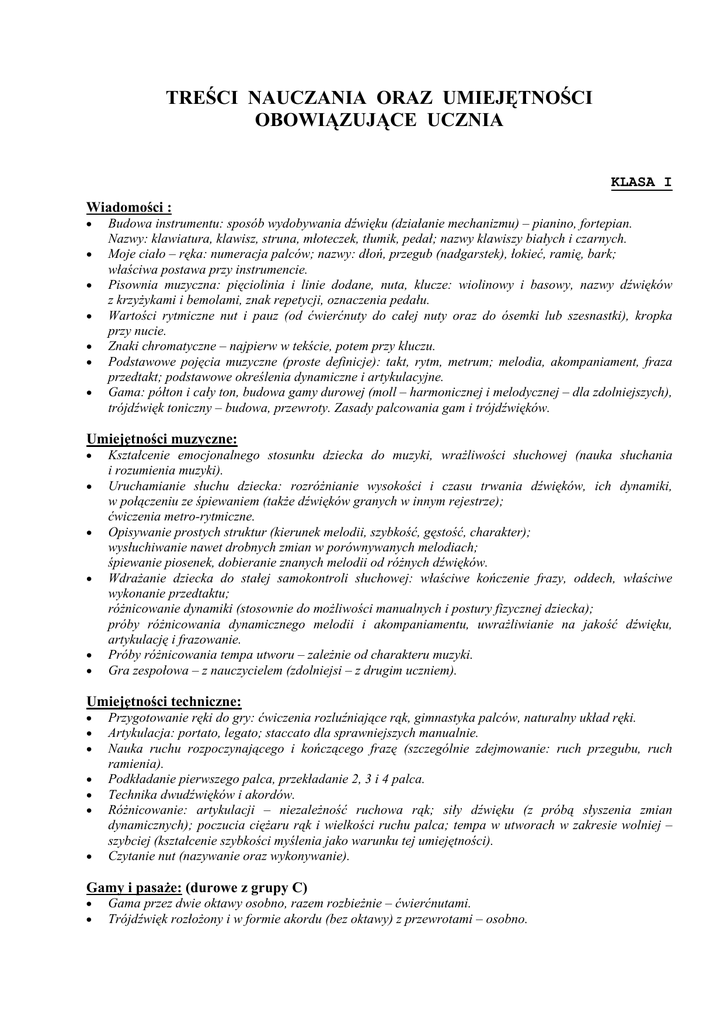 TREŚCI NAUCZANIA ORAZ UMIEJĘTNOŚCI OBOWIĄZUJĄCE UCZNIA KLASA I Wiadomości : • • • • • • • Budowa instrumentu: sposób wydobywania dźwięku (działanie mechanizmu) – pianino, fortepian. Nazwy: klawiatura, klawisz, struna, młoteczek, tłumik, pedał; nazwy klawiszy białych i czarnych. Moje ciało – ręka: numeracja palców; nazwy: dłoń, przegub (nadgarstek), łokieć, ramię, bark; właściwa postawa przy instrumencie. Pisownia muzyczna: pięciolinia i linie dodane, nuta, klucze: wiolinowy i basowy, nazwy dźwięków z krzyżykami i bemolami, znak repetycji, oznaczenia pedału. Wartości rytmiczne nut i pauz (od ćwierćnuty do całej nuty oraz do ósemki lub szesnastki), kropka przy nucie. Znaki chromatyczne – najpierw w tekście, potem przy kluczu. Podstawowe pojęcia muzyczne (proste definicje): takt, rytm, metrum; melodia, akompaniament, fraza przedtakt; podstawowe określenia dynamiczne i artykulacyjne. Gama: półton i cały ton, budowa gamy durowej (moll – harmonicznej i melodycznej – dla zdolniejszych), trójdźwięk toniczny – budowa, przewroty. Zasady palcowania gam i trójdźwięków. Umiejętności muzyczne: • • • • • • Kształcenie emocjonalnego stosunku dziecka do muzyki, wrażliwości słuchowej (nauka słuchania i rozumienia muzyki). Uruchamianie słuchu dziecka: rozróżnianie wysokości i czasu trwania dźwięków, ich dynamiki, w połączeniu ze śpiewaniem (także dźwięków granych w innym rejestrze); ćwiczenia metro-rytmiczne. Opisywanie prostych struktur (kierunek melodii, szybkość, gęstość, charakter); wysłuchiwanie nawet drobnych zmian w porównywanych melodiach; śpiewanie piosenek, dobieranie znanych melodii od różnych dźwięków. Wdrażanie dziecka do stałej samokontroli słuchowej: właściwe kończenie frazy, oddech, właściwe wykonanie przedtaktu; różnicowanie dynamiki (stosownie do możliwości manualnych i postury fizycznej dziecka); próby różnicowania dynamicznego melodii i akompaniamentu, uwrażliwianie na jakość dźwięku, artykulację i frazowanie. Próby różnicowania tempa utworu – zależnie od charakteru muzyki. Gra zespołowa – z nauczycielem (zdolniejsi – z drugim uczniem). Umiejętności techniczne: • • • • • • • Przygotowanie ręki do gry: ćwiczenia rozluźniające rąk, gimnastyka palców, naturalny układ ręki. Artykulacja: portato, legato; staccato dla sprawniejszych manualnie. Nauka ruchu rozpoczynającego i kończącego frazę (szczególnie zdejmowanie: ruch przegubu, ruch ramienia). Podkładanie pierwszego palca, przekładanie 2, 3 i 4 palca. Technika dwudźwięków i akordów. Różnicowanie: artykulacji – niezależność ruchowa rąk; siły dźwięku (z próbą słyszenia zmian dynamicznych); poczucia ciężaru rąk i wielkości ruchu palca; tempa w utworach w zakresie wolniej – szybciej (kształcenie szybkości myślenia jako warunku tej umiejętności). Czytanie nut (nazywanie oraz wykonywanie). Gamy i pasaże: (durowe z grupy C) • • Gama przez dwie oktawy osobno, razem rozbieżnie – ćwierćnutami. Trójdźwięk rozłożony i w formie akordu (bez oktawy) z przewrotami – osobno. KLASA II Wiadomości: • • • • • Budowa gamy molowej harmonicznej i melodycznej. Zasady palcowania gam i trójdźwięków (pasaży). Budowa gamy chromatycznej, schemat palcowania. Triola, fermata, repetycja; skróty pisowni muzycznej (volty). Oznaczenia wykonawcze w tekście (artykulacja, tempo, dynamika). Budowa prostych form muzycznych, np.: a-b-a, a-b, a-a¹. Poznawanie tytułów utworów i nazwisk kompozytorów, szczególnie polskich. Umiejętności muzyczne: • • • • • • • • • Kształcenie pamięci logicznej – dążenie do świadomego zapamiętywania utworów. Permanentne kształcenie wrażliwości słuchowej i kontroli dźwięku. Frazowanie (rozpoczynanie i kończenie frazy, kulminacja, zdanie muzyczne). Właściwe proporcje melodii i akompaniamentu. Krótkie fragmenty melodii w lewej ręce. Poszerzanie skali dynamicznej (p, mf, f), krótkie odcinki crescendo i diminuendo. Proste użycie pedału w połączeniu ze świadomym słyszeniem efektu jego stosowania. Interpretacja utworów programowych. Gra zespołowa z drugim uczniem. Umiejętności techniczne: • • • • • • • • Stałe kontrolowanie i korygowanie przez nauczyciela aparatu gry: dbałość o prawidłową pozycję i pracę palców, zwłaszcza pierwszego i piątego (piąty oparty na stawie śródręczno-palcowym). Technika palcowa: doskonalenie artykulacji portato i legato, staccato "palcowe" i "z nadgarstka". Proste różnicowanie artykulacji w obu rękach. Dwudźwięki do septymy; proste łączenia dwudźwięków legato. Poszerzanie umiejętności ruchowych w zakresie operowania dynamiką (także crescendo i diminuendo). Podkreślanie dynamiczne jednego z głosów w utworach 2-głosowych; odczucie ciężaru niezależnie w każdej ręce. Zwiększenie różnicy pomiędzy tempem wolniejszym i szybszym. Samodzielne czytanie prostego tekstu (nut i znaków). Gamy i pasaże: (durowe i mollowe z grupy C) • • • • • • Gamy przez dwie oktawy równolegle i rozbieżnie, tempo wolne, ósemkami. Gama chromatyczna osobno przez jedną oktawę. Trójdźwięki jako akordy (równoczesność) oburącz, z przewrotami. Ćwiczenia rozluźniająco - rozciągające oparte na trójdźwiękach. Trójdźwięki rozłożone do oktawy – osobno lub razem ćwierćnutami. Pasaże z przewrotami, osobno przez dwie oktawy, ćwierćnutami. KLASA III Wiadomości : • • • • • • • Zasady palcowania gam z grupy F (F, f, H, h). Wiedza muzyczna w powiązaniu z materiałem nauczania (na bazie opracowywanych utworów). Znajomość podstawowego słownictwa używanego w muzyce i posługiwanie się nim. Polirytmia – następstwo ósemek, triol, szesnastek oraz” dwójki na trójki”. Melodia i akompaniament jako elementy homofonii, dwugłosowość jako element polifonii. Ped
