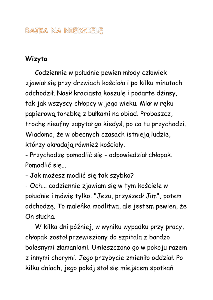 Wizyta Codziennie w południe pewien młody człowiek zjawiał się przy drzwiach kościoła i po kilku minutach odchodził. Nosił kraciastą koszulę i podarte dżinsy, tak jak wszyscy chłopcy w jego wieku. Miał w ręku papierową torebkę z bułkami na obiad. Proboszcz, trochę nieufny zapytał go kiedyś, po co tu przychodzi. Wiadomo, że w obecnych czasach istnieją ludzie, którzy okradają również kościoły. - Przychodzę pomodlić się - odpowiedział chłopak. Pomodlić się... - Jak możesz modlić się tak szybko? - Och... codziennie zjawiam się w tym kościele w południe i mówię tylko: "Jezu, przyszedł Jim", potem odchodzę. To maleńka modlitwa, ale jestem pewien, że On słucha. W kilka dni później, w wyniku wypadku przy pracy, chłopak został przewieziony do szpitala z bardzo bolesnymi złamaniami. Umieszczono go w pokoju razem z innymi chorymi. Jego przybycie zmieniło oddział. Po kilku dniach, jego pokój stał się miejscem spotkań pacjentów z tego samego korytarza. Młodzi i starzy spotykali się przy jego łóżku, a on miał uśmiech i słowo otuchy dla każdego. Przyszedł odwiedzić go również proboszcz i w towarzystwie pielęgniarki stanął przy łóżku chłopaka. Powiedziano mi, że jesteś cały pokiereszowany, ale że pomimo to wszystkim dodajesz otuchy. Jak to robisz?. To dzięki Komuś, Kto przychodzi odwiedzić mnie w południe. Pielęgniarka przerwała mu: Tu nikt nie przychodzi w południe... O, tak! Przychodzi tu codziennie i stając w drzwiach mówi: "Jim, to Ja, Jezus"- i odchodzi. Autor: Bruno Ferrero