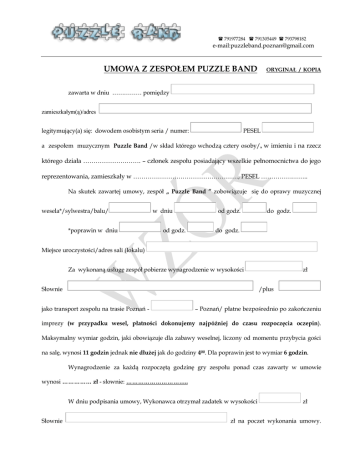 791977284 791305449 793798182 e-mail:[email protected] UMOWA Z ZESPOŁEM PUZZLE BAND ORYGINAŁ / KOPIA zawarta w dniu …………… pomiędzy zamieszkałym(ą)/adres legitymujący(a) się: dowodem osobistym seria / numer: PESEL a zespołem muzycznym Puzzle Band /w skład którego wchodzą cztery osoby/, w imieniu i na rzecz którego działa ………………………. – członek zespołu posiadający wszelkie pełnomocnictwa do jego reprezentowania, zamieszkały w ……………………………………………, PESEL ………………….. Na skutek zawartej umowy, zespół „ Puzzle Band ” zobowiązuje się do oprawy muzycznej wesela*/sylwestra/balu/ *poprawin w dniu w dniu od godz. od godz. do godz. do godz. Miejsce uroczystości/adres sali (lokalu) Za wykonaną usługę zespół pobierze wynagrodzenie w wysokości Słownie zł /plus jako transport zespołu na trasie Poznań - – Poznań/ płatne bezpośrednio po zakończeniu imprezy (w przypadku wesel, płatności dokonujemy najpóźniej do czasu rozpoczęcia oczepin). Maksymalny wymiar godzin, jaki obowiązuje dla zabawy weselnej, liczony od momentu przybycia gości na salę, wynosi 11 godzin jednak nie dłużej jak do godziny 400. Dla poprawin jest to wymiar 6 godzin. Wynagrodzenie za każdą rozpoczętą godzinę gry zespołu ponad czas zawarty w umowie wynosi …………… zł - słownie: ………………………….. W dniu podpisania umowy, Wykonawca otrzymał zadatek w wysokości Słownie zł zł na poczet wykonania umowy. 791977284 791305449 793798182 email:[email protected] Zespół muzyczny Puzzle Band dokonuje rozstawienia sprzętu tak, aby jakość muzyczna była optymalna dla danej sali. Zatem zespół sam decyduje o tym, w jaki sposób rozstawić się, działając w dobrej wierze oraz w porozumieniu z właścicielem sali. Jeżeli zatem właściciel sali nie będzie rozumiał potrzeb zespołu, sprawę zgłaszamy do Wynajmującego zespół celem wyjaśnienia. Organizator zobowiązany jest do zapewnienia należytej ochrony zespołu, instrumentów oraz sprzętu nagłośnieniowego - także gdy jest on pozostawiony na sali do dnia następnego ( w przypadku poprawin). Za straty wynikłe z uszkodzenia sprzętu muzycznego przez uczestników zabawy lub osoby postronne odpowiada finansowo osoba wynajmująca zespół. Za zapewnienie zasilania energią elektryczną w czasie imprezy odpowiedzialny jest wynajmujący. Zespół nie odlicza żadnej kwoty z należnego wynagrodzenia wynikającego z niniejszej umowy w razie całkowitego braku lub chwilowej awarii zasilania elektrycznego. W czasie trwania imprezy, Organizator zapewnia członkom zespołu posiłek, taki jak wszystkim biesiadnikom. Ustalone w umowie wynagrodzenie dla zespołu nie podlega dalszym negocjacjom. Pozostała kwota do rozliczenia wynosi zł – słownie: plus koszty transportu. W przypadku zerwania umowy przez którąkolwiek ze Stron, Strona zrywająca zobowiązana jest do zapłaty kary umownej w wysokości 50% wynagrodzenia (określonego w umowie) w momencie zerwania w/w umowy. 791977284 791305449 793798182 email:[email protected] *Wyrażam / nie wyrażam * zgodę(y) na publikowanie materiałów z imprezy na stronie internetowej zespołu: www.puzzleband-poznan.com.pl Obowiązek zapłacenia tantiem ZAIKS spoczywa na Organizatorze imprezy. W sprawach nieuregulowanych umową, zastosowanie mają przepisy Kodeksu Cywilnego. Umowa została spisana w dwóch jednobrzmiących egzemplarzach, po jednym dla każdej ze Stron. …………………………….. …………………………. data i podpis zamawiającego podpis wykonawcy * niepotrzebne skreślić