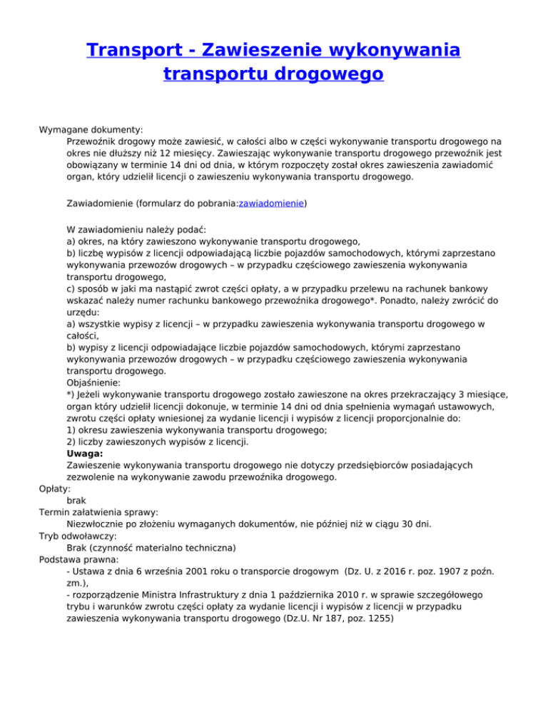 Transport - Zawieszenie wykonywania transportu drogowego Wymagane dokumenty: Przewoźnik drogowy może zawiesić, w całości albo w części wykonywanie transportu drogowego na okres nie dłuższy niż 12 miesięcy. Zawieszając wykonywanie transportu drogowego przewoźnik jest obowiązany w terminie 14 dni od dnia, w którym rozpoczęty został okres zawieszenia zawiadomić organ, który udzielił licencji o zawieszeniu wykonywania transportu drogowego. Zawiadomienie (formularz do pobrania:zawiadomienie) W zawiadomieniu należy podać: a) okres, na który zawieszono wykonywanie transportu drogowego, b) liczbę wypisów z licencji odpowiadającą liczbie pojazdów samochodowych, którymi zaprzestano wykonywania przewozów drogowych – w przypadku częściowego zawieszenia wykonywania transportu drogowego, c) sposób w jaki ma nastąpić zwrot części opłaty, a w przypadku przelewu na rachunek bankowy wskazać należy numer rachunku bankowego przewoźnika drogowego*. Ponadto, należy zwrócić do urzędu: a) wszystkie wypisy z licencji – w przypadku zawieszenia wykonywania transportu drogowego w całości, b) wypisy z licencji odpowiadające liczbie pojazdów samochodowych, którymi zaprzestano wykonywania przewozów drogowych – w przypadku częściowego zawieszenia wykonywania transportu drogowego. Objaśnienie: *) Jeżeli wykonywanie transportu drogowego zostało zawieszone na okres przekraczający 3 miesiące, organ który udzielił licencji dokonuje, w terminie 14 dni od dnia spełnienia wymagań ustawowych, zwrotu części opłaty wniesionej za wydanie licencji i wypisów z licencji proporcjonalnie do: 1) okresu zawieszenia wykonywania transportu drogowego; 2) liczby zawieszonych wypisów z licencji. Uwaga: Zawieszenie wykonywania transportu drogowego nie dotyczy przedsiębiorców posiadających zezwolenie na wykonywanie zawodu przewoźnika drogowego. Opłaty: brak Termin załatwienia sprawy: Niezwłocznie po złożeniu wymaganych dokumentów, nie później niż w ciągu 30 dni. Tryb odwoławczy: Brak (czynność materialno techniczna) Podstawa prawna: - Ustawa z dnia 6 września 2001 roku o transporcie drogowym (Dz. U. z 2016 r. poz. 1907 z poźn. zm.), - rozporządzenie Ministra Infrastruktury z dnia 1 października 2010 r. w sprawie szczegółowego trybu i warunków zwrotu części opłaty za wydanie licencji i wypisów z licencji w przypadku zawieszenia wykonywania transportu drogowego (Dz.U. Nr 187, poz. 1255) Wykonanie zadania: Jednostka odpowiedzialna Stanowisko pracy do spraw transportu drogowego Pracownicy odpowiedzialni ● ● Marek Szyrwiński - Stanowisko pracy do spraw transportu drogowego Olsztyn, Plac Bema 5 pokój 15 telefon: 521 05 16 Joanna Martul - Stanowisko pracy do spraw transportu drogowego Olsztyn, Plac Bema 5 pokój 15 telefon: 521 05 16 Drukuj