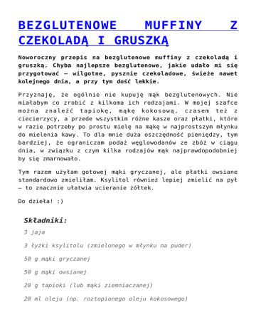 BEZGLUTENOWE MUFFINY CZEKOLADĄ I GRUSZKĄ Z Noworoczny przepis na bezglutenowe muffiny z czekoladą i gruszką. Chyba najlepsze bezglutenowe, jakie udało mi się przygotować – wilgotne, pysznie czekoladowe, świeże nawet kolejnego dnia, a przy tym dość lekkie. Przyznaję, że ogólnie nie kupuję mąk bezglutenowych. Nie miałabym co zrobić z kilkoma ich rodzajami. W mojej szafce można znaleźć tapiokę, mąkę kokosową, czasem też z ciecierzycy, a przede wszystkim różne kasze oraz płatki, które w razie potrzeby po prostu mielę na mąkę w najprostszym młynku do mielenia kawy. To dla mnie duża oszczędność pieniędzy, tym bardziej, że ograniczam podaż węglowodanów ze zbóż w ciągu dnia, w związku z czym kilka rodzajów mąk najprawdopodobniej by się zmarnowało. Tym razem użyłam gotowej mąki gryczanej, ale płatki owsiane standardowo zmieliłam. Ksylitol również lepiej zmielić na pył – to znacznie ułatwia ucieranie żółtek. Do dzieła! :) Składniki: 3 jaja 3 łyżki ksylitolu (zmielonego w młynku na puder) 50 g mąki gryczanej 50 g mąki owsianej 20 g tapioki (lub mąki ziemniaczanej) 20 ml oleju (np. roztopionego oleju kokosowego) 1/4 – 1/3 szklanki wody średnio gazowanej lub lekko gazowanej 1 czubata łyżka kakao 1/2 łyżeczki mielonego cynamonu 1/2 gruszki pokrojonej w kostkę 3-4 paski gorzkiej czekolady >70% pokrojonej w drobne kawałki Przygotowanie Jaja myjemy i oddzielamy żółtka od białek. Białka ubijamy na sztywną pianę, natomiast żółtka ucieramy mikserem z ksylitolem. Do żółtek dodajemy olej i ubijamy masę ponownie mikserem. Następnie dodajemy mąki i znów miksujemy. Ciasto stanie się gęste. Wlewamy wodę i znów miksujemy. Ciasto się lekko spieni na początku, ale to tylko chwilowy efekt. Miksujemy dalej, po czym dodajemy kakao oraz cynamon. Łączymy wszystkie składniki. Ciasto z każdym ruchem miksera będzie gęstnieć. Następnie należy łyżką wmieszać w masę ubite białka, pokrojoną gruszkę oraz czekoladę. Jeśli masę trudno połączyć łyżką, można użyć przez chwilę miksera włączonego na niskie obroty. Przekładamy gotowe ciasto do foremek na muffiny. Pieczemy w 180 st.C przez 25 minut. Babeczki można podać z masą orzechową lub śmietanką kokosową. Co kto lubi :) Z przepisu można przygotować 12 standardowej wielkości muffinów. Najlepiej, aby ciasto miało konsystencję ciasta naleśnikowego, czyli takiego, aby można było je niemal przelać do foremek (ja swoje wlewałam, co było najwygodniejsze). Wtedy babeczki będą „lekkie”, a ich ciasto nie będzie bardzo zbite i gęste po upieczeniu, jak to często bywa w przypadku bezglutenowych wypieków. Smacznego! :)