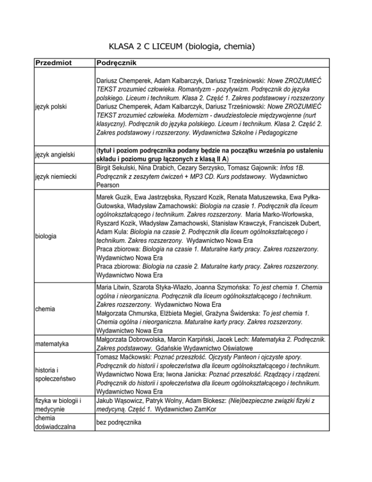 KLASA 2 C LICEUM (biologia, chemia) Przedmiot Podręcznik język polski Dariusz Chemperek, Adam Kalbarczyk, Dariusz Trześniowski: Nowe ZROZUMIEĆ TEKST zrozumieć człowieka. Romantyzm - pozytywizm. Podręcznik do języka polskiego. Liceum i technikum. Klasa 2. Część 1. Zakres podstawowy i rozszerzony Dariusz Chemperek, Adam Kalbarczyk, Dariusz Trześniowski: Nowe ZROZUMIEĆ TEKST zrozumieć człowieka. Modernizm - dwudziestolecie międzywojenne (nurt klasyczny). Podręcznik do języka polskiego. Liceum i technikum. Klasa 2. Część 2. Zakres podstawowy i rozszerzony. Wydawnictwa Szkolne i Pedagogiczne język angielski język niemiecki biologia chemia matematyka historia i społeczeństwo fizyka w biologii i medycynie chemia doświadczalna (tytuł i poziom podręcznika podany będzie na początku września po ustaleniu składu i poziomu grup łączonych z klasą II A) Birgit Sekulski, Nina Drabich, Cezary Serzysko, Tomasz Gajownik: Infos 1B. Podręcznik z zeszytem ćwiczeń + MP3 CD. Kurs podstawowy. Wydawnictwo Pearson Marek Guzik, Ewa Jastrzębska, Ryszard Kozik, Renata Matuszewska, Ewa PyłkaGutowska, Władysław Zamachowski: Biologia na czasie 1. Podręcznik dla liceum ogólnokształcącego i technikum. Zakres rozszerzony. Maria Marko-Worłowska, Ryszard Kozik, Władysław Zamachowski, Stanisław Krawczyk, Franciszek Dubert, Adam Kula: Biologia na czasie 2. Podręcznik dla liceum ogólnokształcącego i technikum. Zakres rozszerzony. Wydawnictwo Nowa Era Praca zbiorowa: Biologia na czasie 1. Maturalne karty pracy. Zakres rozszerzony. Wydawnictwo Nowa Era Praca zbiorowa: Biologia na czasie 2. Maturalne karty pracy. Zakres rozszerzony. Wydawnictwo Nowa Era Maria Litwin, Szarota Styka-Wlazło, Joanna Szymońska: To jest chemia 1. Chemia ogólna i nieorganiczna. Podręcznik dla liceum ogólnokształcącego i technikum. Zakres rozszerzony. Wydawnictwo Nowa Era Małgorzata Chmurska, Elżbieta Megiel, Grażyna Świderska: To jest chemia 1. Chemia ogólna i nieorganiczna. Maturalne karty pracy. Zakres rozszerzony. Wydawnictwo Nowa Era Małgorzata Dobrowolska, Marcin Karpiński, Jacek Lech: Matematyka 2. Podręcznik. Zakres podstawowy. Gdańskie Wydawnictwo Oświatowe Tomasz Maćkowski: Poznać przeszłość. Ojczysty Panteon i ojczyste spory. Podręcznik do historii i społeczeństwa dla liceum ogólnokształcącego i technikum. Wydawnictwo Nowa Era; Iwona Janicka: Poznać przeszłość. Rządzący i rządzeni. Podręcznik do historii i społeczeństwa dla liceum ogólnokształcącego i technikum. Wydawnictwo Nowa Era Jakub Wąsowicz, Patryk Wolny, Adam Blokesz: (Nie)bezpieczne związki fizyki z medycyną. Część 1. Wydawnictwo ZamKor bez podręcznika religia Jan Szpet, Danuta Jackowiak: Moje miejsce w świecie. Wydawnictwo Święty Wojciech
