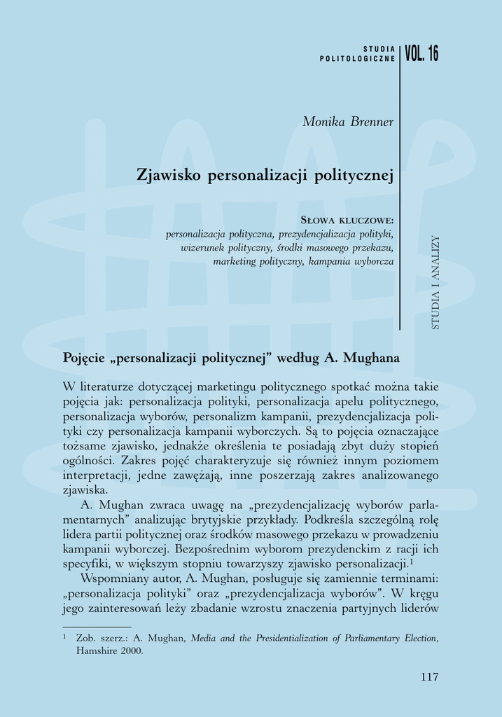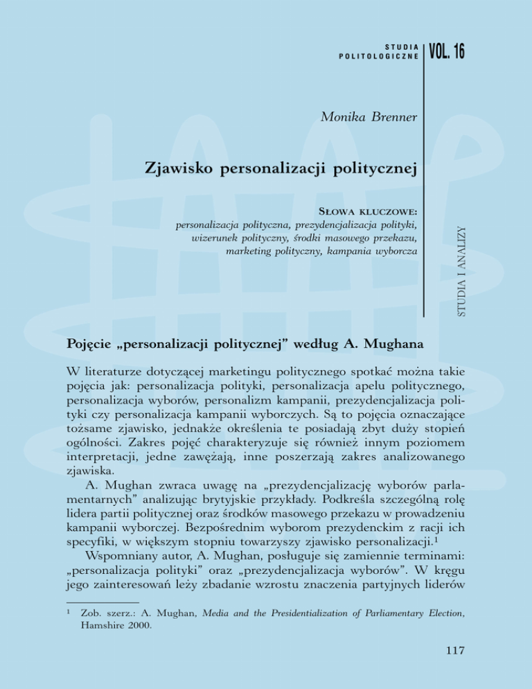 STUDIA POLITOLOGICZNE VOL. 16 Monika Brenner SŁOWA KLUCZOWE: personalizacja polityczna, prezydencjalizacja polityki, wizerunek polityczny, środki masowego przekazu, marketing polityczny, kampania wyborcza STUDIA I ANALIZY Zjawisko personalizacji politycznej Pojęcie „personalizacji politycznej” według A. Mughana W literaturze dotyczącej marketingu politycznego spotkać można takie pojęcia jak: personalizacja polityki, personalizacja apelu politycznego, personalizacja wyborów, personalizm kampanii, prezydencjalizacja polityki czy personalizacja kampanii wyborczych. Są to pojęcia oznaczające tożsame zjawisko, jednakże określenia te posiadają zbyt duży stopień ogólności. Zakres pojęć charakteryzuje się również innym poziomem interpretacji, jedne zawężają, inne poszerzają zakres analizowanego zjawiska. A. Mughan zwraca uwagę na „prezydencjalizację wyborów parlamentarnych” analizując brytyjskie przykłady. Podkreśla szczególną rolę lidera partii politycznej oraz środków masowego przekazu w prowadzeniu kampanii wyborczej. Bezpośrednim wyborom prezydenckim z racji ich specyfiki, w większym stopniu towarzyszy zjawisko personalizacji.1 Wspomniany autor, A. Mughan, posługuje się zamiennie terminami: „personalizacja polityki” oraz „prezydencjalizacja wyborów”. W kręgu jego zainteresowań leży zbadanie wzrostu znaczenia partyjnych liderów 1 Zob. szerz.: A. Mughan, Media and the Presidentialization of Parliamentary Election, Hamshire 2000. 117 MONIKA BRENNER w brytyjskim systemie parlamentarnym. Z tego względu używa częściej sformułowania „prezydencjalizacja” będącego bardziej trafnym przy analizie wyborów parlamentarnych. Konstruuje także, ogólny model zjawiska personalizacji w demokracji. Według niego, „prezydencjalizm” zakłada niezależny wpływ (impact) liderów partyjnych w pojedynczym głosowaniu, podczas gdy personalizacja zakłada, że ten wpływ staje się silniejszy”.2 Prezydencjalizacja jest pojęciem trafniejszym w przypadku analizy brytyjskiego systemu politycznego. Zadaniem liderów, kandydatów jest przyciągnięcie zwolenników, zniechęcenie przeciwników do głosowania, wzmocnienie identyfikacji z osobą lidera bądź organizacją czy ideą jaką reprezentuje. Jego celem jest także ukształtowanie pozytywnego wizerunku w umysłach głosujących. Personalizacja odnosi się do dwóch wymiarów: prezentacji i wpływu (siły uderzenia). Pierwszy wymiar odnosi się do przywódcy jako głównego podmiotu kreowanej idei czy reprezentowanej partii (lider staje się publicznym wizerunkiem). Personalizacja prezentacji to sposób, w jaki współcześnie prowadzi się kampanie, zarówno parlamentarne, jak i prezydenckie. Wskazanie przyczyny tego zjawiska, jaką niewątpliwie jest wpływanie na głosujących poprzez środki masowego przekazu, głównie telewizję. Drugi wymiar dotyczy wpływu, jaki ma przywódca na decyzje elektoratu. Wpływ ten nie zależy tylko od roli mediów, ale także od instytucjonalnej struktury politycznej, pozycji przywódcy. Niektóre systemy parlamentarne są bardziej podatne na prezydencjalizację, niż inne. Autor podaje za przykład Włochy oraz Japonię, gdzie systemowo starano się powstrzymać ewentualne wyłonienie silnego przywódcy. Jednakże słabość dominujących partii wraz z częstym odwoływaniem się w kampaniach do telewizji, doprowadziła w latach 90. XX wieku do narodzin „politycznych osobowości”, które zdobywały głosy dla swoich ugrupowań. We Włoszech punktem zwrotnym był rok 1994, kiedy magnat prasowy S. Berlusconi3, który pod etykietką partii w zasadzie nie istniejącej organizacyjnie, wykorzystał sieć mediów, aby „sprzedać” siebie i swoje ugrupowanie i zostać premierem, nie piastując wcześniej żadnego obieralnego urzędu. W Japonii, rozpad dominującej4 Partii Liberalno-Demokratycznej w 1993 roku i rozwój telewizji jako środka prezentującego polityczne 2 3 4 Tamże, s. 11. S. Berlusconi zawdzięcza zawrotną karierę polityczną środkom masowego przekazu, których był właścicielem, w szczególności włoskiej telewizji. Pod tym pojęciem mam na myśli siłę i pozycję partii na scenie politycznej. 118 STUDIA I ANALIZY / SP Vol. 16 Zjawisko personalizacji politycznej kwestie, dał szanse rozwojowi nowej generacji liderów – dobrze „wypadających w mediach polityków”, zdobycia poparcia poza tradycyjną strukturą partyjną. Przykładem może być Morihiro Hosokawa, który sformował rząd koalicji reform w 2000 roku.5 A. Mughan podkreśla także, iż zjawisko personalizacji polityki nie jest łatwe do udowodnienia, ponieważ samo pojęcie nie jest proste i jednoznaczne. Samo rozróżnienie pomiędzy jego prezentacją a wpływem jest pierwszym wskaźnikiem jego złożoności. Rodzi się bowiem pytanie: czy pozytywna bądź negatywna ocena przywódcy są równie ważne dla głosowania i czy obie podążają tą samą drogą. Ze względu na tę złożoność nie można potwierdzić ani zaprzeczyć zjawisku personalizacji na podstawie pojedynczych przykładów. Aby ustalić, że personalizacja ma miejsce, należy korzystać z różnych źródeł i rozszerzyć zakres czasowy obejmujący analizę. Ustalić, na ile personalizacja ma rzeczywiste znaczenie, od jakich czynników zależy, jak: tryb wyboru przywódcy (np. prezydenta), czas trwania kadencji, specyfika systemu medialnego, reklama polityczna, wpływają na stopień personalizacji.6 Wielu autorów rozpatruje rolę lidera (kandydata) w kampanii wyborczej, zarówno w kontekście wyborów parlamentarnych, jak i prezydenckich. Niektórzy z badaczy podkreślają, że w europejskich systemach parlamentarno-gabinetowych istniejący wzorzec rządów partii osłabia oddziaływanie cech kandydatów na indywidualną decyzję wyborczą, a większą rolę w tym zakresie odgrywają partyjne platformy. Jednocześnie jednak zauważa się nasilenie procesu „personalizacji” wyborów.7 W