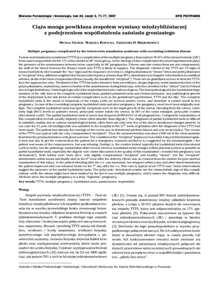 Kliniczna Perinatologia i Ginekologia, tom 43, zeszyt 3, 71-77, 2007 OPIS PRZYPADKU Ciąża mnoga powikłana zespołem wymiany międzybliźniaczej z podejrzeniem współistnienia zaśniadu groniastego M ICHAŁ SZUBER, M ARIOLA ROPACKA, G RZEGORZ H. BRĘBOROWICZ Multiple pregnancy complicated by the twin-to-twin transfusion syndrome with co-existing trofoblast disease Twin-to-twin transfusion syndrome (TTTS) is a complication of the multiple pregnancy that exists in 10-15% of the monochorionic (MC) twins and is responsible for the 17% of the deaths in MC twins group. In the etiology of this complication the most important role plays the presence of the anastomoses between twins, especially in MC pregnancies. If those vascular connections are not compensated, the shift of the blood between the fetuses exists and TTTS is likely to happen. The diagnostic criteria of the TTTS are US signs of monochorionicity (for example the “tau” sign) and the sequence of events i.e. oligohydramnion in “donor” fetus and polihydramnion in “recipient” fetus, different weights of the fetuses (discrepancy of more than 20%), disturbances in Doppler velocimetries in umbilical arteries, death of the more compromised fetus (usually the insufficient “recipient”). There are no guidelines on how to treat the TTTS, thus the approaches vary. Treatment of the TTTS includes intensive fetal surveillance, drugs (digoxin), serial amnioreduction of the polyhydramnion, septostomy, laser occlusion of the anastomoses during fetoscopy, selective abortion of the “donor” (not in Poland due to legal limitations). Pathological growth of the trophoblast includes various degrees. The least pathological is the hydatidoid degeneration of the villi, then is the complete hydatidoid mola, partial hydatidoid mola and choriocarcinoma. Any pathological growth of the trophoblast is the risk factor of certain complication such as the gestational hypertension, TTTS and the like. The complete hydatidoid mola is the result of dispermia of the empty (with no nucleus inside) ovum, and therefore it cannot result in live pregnancy. In case of the co-existing complete hydatidoid mola and alive pregnancy, the pregnancy must have been originally multiple. The complete hydatidoid mola has specific symptoms such as the rapid growth of the uterus, bleeding from the uterus, extremely high βhCG levels in patient’s serum, polycystic tumor inside the uterus, in 50% of the cases enlarged, polycystic ovaries (thecaluteal cysts). The partial hydatidoid mola is much less frequent (0.005-0.01% of all pregnancies). Cytogenetic examination of this complication reveals usually triploidy (more often diandric than digynic). The diagnosis of partial hydatidoid mola is difficult to establish, mainly due to various morphological forms, often there are only very few of the above mentioned changes present. In our case the 31 year old multigravida was admitted to the hospital in the 27th week of gestation after the diagnosis of the TTTS had been made. The patient had already the cerclage of the cervix due to threatened preterm labour and was on tocolytics. The course of the TTTS was typical with the very compromised “recipient”. Thus the amnioreduction was done (1500 ml of the clear amniotic fluid from the polyhydramnios) with good outcome. The condition of the “recipient” improved, but within 4 days it deteriorated again. It took one day to get the consent from the patient for a emergency cesarean section (c.s.) suggested by the neonatologists – the patient was aware of the consequences, but was refusing. During c.s. the ovaries looked typically for hydatidoid mola (thecaluteal cysts in both), but the pathology examination didn’t reveal obvious hydatidoid mola changes within placenta (which is possible in partial hydatidoid mola, especially the digynic one; under discussion is the quality of this examination – it stated this pregnancy was dichorionic!). Both babies were born alive, with slightly compromised “recipient” and healthy “donor”, but the “recipient” deteriorated within hours and finally died in the 6th hour after the delivery (there was no consent from the mother for post mortem examination of this baby). In the patient bleeding after the c.s. was increased, but stopped within a day and after blood transfusion the patient improved and was released home on the 7th day after the c.s. This case is typical acute TTTS case. Some observations suggest the presence of the partial hydatidoid mola. The polycystic, thecaluteal ovaries are the characteristic sign of this complications, while the others might have been masked by the fact it was multiple pregnancy, which makes the diagnosis very difficult. All those show the multiple pregnancy is a truly “high-risk” pregnancy. TTTS, multiple pregnancy, hydatidoid mola, anastomoses, trophoblast Key words: Wstęp Zespół wymiany międzybliźniaczej (TTTS – Twin-toTwin transfusion syndrome) zwany inaczej zespołem transfuzji międzypłodowej lub zespołem podkradania rozwija się w wyniku przewlekłego braku równowagi hemodynamicznej między układami krążenia bliźniąt w ciążach jednokosmówkowych. U podstaw etiologii tego zespołu leży obecność i funkcjonowanie połączeń naczyniowych, tzw. anastomoz. Rozwój i przebieg TTTS zależy od charakteru, wielkości i liczby anastomoz, wielkości łożyska, symetrycznego lub asymetrycznego korzystania z powierzchni wymiany, rozwoju łożyska, stężenia białek krwi płodu oraz występowania wielowodzia, które może prowadzić do ucisku łożyska. Częstość występowania bliźniąt jednozygotycznych (JZ) szacuje się na 3,5 na 1000 ogółu ciąż, zaś prawie 70% z nich to bliźnięta jednokosmówkowe (JK) [1]. Uważa się, iż ponad 98% łożysk jednokosmówkowych posiada anastomozy między układami krążenia płodów, z czego u 10-15% płodów dojdzie do rozwinięcia się zespołu TTTS, który jest odpowiedzialny za 17