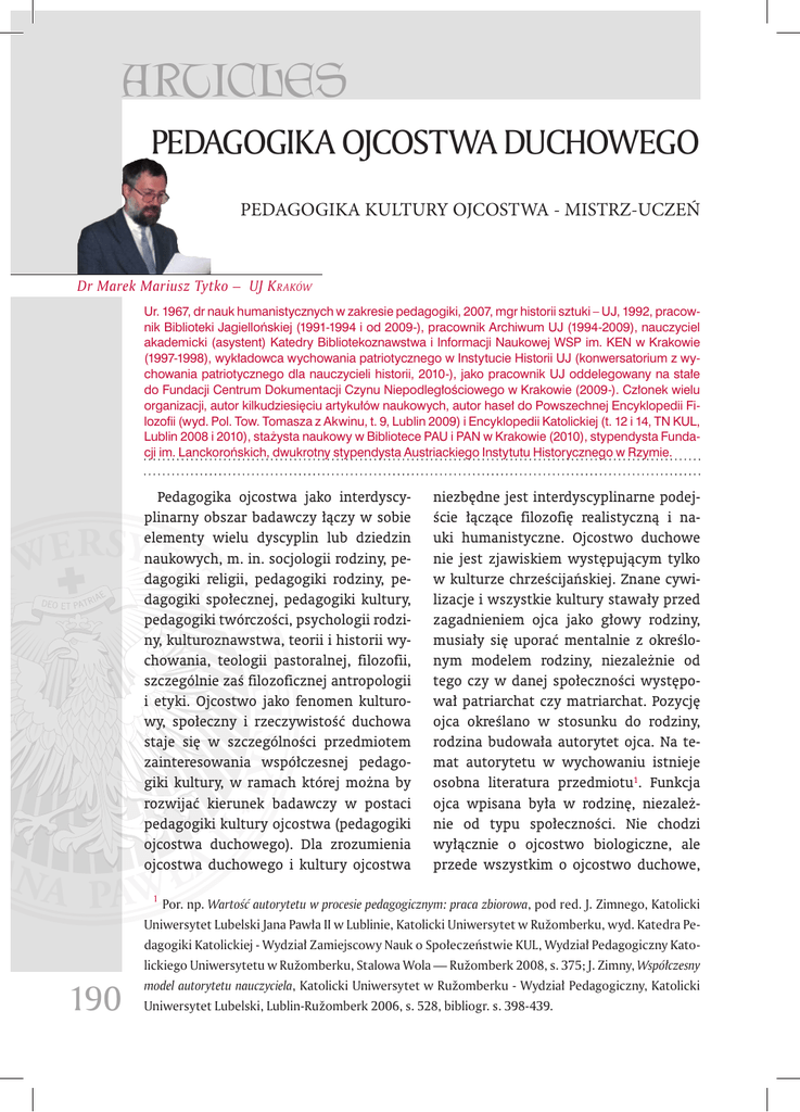ARTICLES PEDAGOGIKA OJCOSTWA DUCHOWEGO PEDAGOGIKA KULTURY OJCOSTWA - MISTRZ-UCZEŃ Dr Marek Mariusz Tytko – UJ K raków Ur. 1967, dr nauk humanistycznych w zakresie pedagogiki, 2007, mgr historii sztuki – UJ, 1992, pracownik Biblioteki Jagiellońskiej (1991-1994 i od 2009-), pracownik Archiwum UJ (1994-2009), nauczyciel akademicki (asystent) Katedry Bibliotekoznawstwa i Informacji Naukowej WSP im. KEN w Krakowie (1997-1998), wykładowca wychowania patriotycznego w Instytucie Historii UJ (konwersatorium z wychowania patriotycznego dla nauczycieli historii, 2010-), jako pracownik UJ oddelegowany na stałe do Fundacji Centrum Dokumentacji Czynu Niepodległościowego w Krakowie (2009-). Członek wielu organizacji, autor kilkudziesięciu artykułów naukowych, autor haseł do Powszechnej Encyklopedii Filozofii (wyd. Pol. Tow. Tomasza z Akwinu, t. 9, Lublin 2009) i Encyklopedii Katolickiej (t. 12 i 14, TN KUL, Lublin 2008 i 2010), stażysta naukowy w Bibliotece PAU i PAN w Krakowie (2010), stypendysta Fundacji im. Lanckorońskich, dwukrotny stypendysta Austriackiego Instytutu Historycznego w Rzymie. Pedagogika ojcostwa jako interdyscyplinarny obszar badawczy łączy w sobie elementy wielu dyscyplin lub dziedzin naukowych, m. in. socjologii rodziny, pedagogiki religii, pedagogiki rodziny, pedagogiki społecznej, pedagogiki kultury, pedagogiki twórczości, psychologii rodziny, kulturoznawstwa, teorii i historii wychowania, teologii pastoralnej, filozofii, szczególnie zaś filozoficznej antropologii i etyki. Ojcostwo jako fenomen kulturowy, społeczny i rzeczywistość duchowa staje się w szczególności przedmiotem zainteresowania współczesnej pedagogiki kultury, w ramach której można by rozwijać kierunek badawczy w postaci pedagogiki kultury ojcostwa (pedagogiki ojcostwa duchowego). Dla zrozumienia ojcostwa duchowego i kultury ojcostwa 1 niezbędne jest interdyscyplinarne podejście łączące filozofię realistyczną i nauki humanistyczne. Ojcostwo duchowe nie jest zjawiskiem występującym tylko w kulturze chrześcijańskiej. Znane cywilizacje i wszystkie kultury stawały przed zagadnieniem ojca jako głowy rodziny, musiały się uporać mentalnie z określonym modelem rodziny, niezależnie od tego czy w danej społeczności występował patriarchat czy matriarchat. Pozycję ojca określano w stosunku do rodziny, rodzina budowała autorytet ojca. Na temat autorytetu w wychowaniu istnieje osobna literatura przedmiotu1. Funkcja ojca wpisana była w rodzinę, niezależnie od typu społeczności. Nie chodzi wyłącznie o ojcostwo biologiczne, ale przede wszystkim o ojcostwo duchowe, Por. np. Wartość autorytetu w procesie pedagogicznym: praca zbiorowa, pod red. J. Zimnego, Katolicki Uniwersytet Lubelski Jana Pawła II w Lublinie, Katolicki Uniwersytet w Ružomberku, wyd. Katedra Pedagogiki Katolickiej - Wydział Zamiejscowy Nauk o Społeczeństwie KUL, Wydział Pedagogiczny Katolickiego Uniwersytetu w Ružomberku, Stalowa Wola — Ružomberk 2008, s. 375; J. Zimny, Współczesny 190 model autorytetu nauczyciela, Katolicki Uniwersytet w Ružomberku - Wydział Pedagogiczny, Katolicki Uniwersytet Lubelski, Lublin-Ružomberk 2006, s. 528, bibliogr. s. 398-439. ARTYKUŁY społeczne, związane z procesem socjalizacji w grupie społecznej. Możemy dostrzec m. in. następujące wymiary ojcostwa duchowego: 1) ojcostwo rodziny (głowa rodziny, w relacji do wspólnoty żony i dzieci), 2) ojcostwo rodu, klanu, plemienia (głowa rodu, przywódca klanu, wódz plemienia w relacji do wspólnoty członków rodu, klanu, plemienia), 3) ojcostwo narodu (duchowe ojcostwoprzywództwo narodu, w relacji do członków wspólnoty narodu, danej wspólnoty narodowej), 4) ojcostwo państwa (np. dawniej pozycja króla-suwerena, obecnie przywództwo państwowe, bycie faktycznie ‘mężem stanu’, w relacji do obywateli danego państwa, niezależnie od ich narodowości), 5) ojcostwo religijne (duchowe ojcostwo w relacji do członków danej wspólnoty religijnej, np. prorocy, apostołowie, święci, papieże, biskupi, duchowni o szczególnym, rzeczywistym autorytecie moralnym i społecznym), 6) ojcostwo kulturowe (ojcostwo rozumiane jako szczególny, rzeczywisty autorytet o wielkich zasługach dla społeczności w danej kulturze lub w danej dziedzinie kultury rozumianej dystrybutywnie, np. Jan Kochanowski jako ‘ojciec literatury polskiej’), 7) ojcostwo wychowawcze, formacyjne, edukacyjne (duchowe ojcostwo w szkole, we wszelkich placówkach oświatowych, swoiste „ojcowanie” wychowankom, zastępcza, „ojcowska” opieka nad dziećmi i młodzieżą, bycie rzeczywistym autorytetem wychowawczym dla danej wspólnoty, także bycie rzeczywistym autorytetem jako animator świecki w danej grupie, gdzie realizowane są cele wychowawcze)2. Można dyskutować na temat pełnego zakresu faktycznego ojcostwa, o pełne 2 znaczenie terminu ‘ojcostwo’, można także rozmaicie dzielić ojcostwo na poszczególne jego rodzaje, wymieniając takie, czy inne jego aspekty realne. Zapewne problematyka ojcostwa pozostanie otwarta dla nowych odkryć, dla dalszych badań, które pogłębią i doprecyzują poszczególne obszary owego fenomenu kulturowego i społecznego, wszak ojcostwo duchowe nie jest we wszystkich swoich aspektach równomiernie badane. W niniejszym artykule chciałbym się skupić na problematyce relacji mistrza i ucznia, w szczególności na osobie mistrza, który jest duchowym ojcem uczniów (ucznia) nie tyle w sensie autorytetu funkcjonalnego, jakim jest spełnianie funkcji nauczyciela, opiekuna, wychowawcy, tutora, promotora itp., ale na rzeczywistym autorytecie ojca duchowego z wyboru. W uczelniach wyższych istnieje (powinna istnieć) możliwość rzeczywistego wyboru swojego mistrza, tj. wyboru promotora pracy licencjackiej, magisterskiej, doktorskiej przez dobrowolne zapisanie się w sposób rzeczywiście wolny na odpowiednie seminarium dyplomowe, magisterskie, doktoranckie. Jeśli nastąpił w pełni woln
