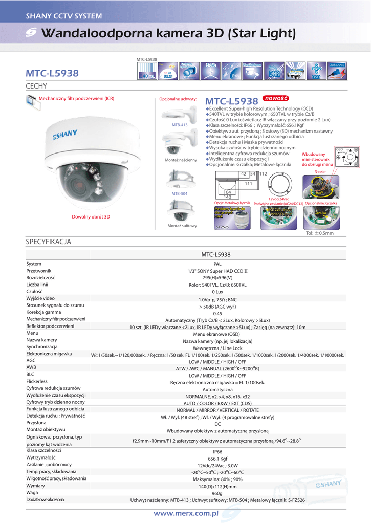 SHANY CCTV SYSTEM Wandaloodporna kamera 3D (Star Light) MTC-L5938 Zmienna ogniskowa 10m MTC-L5938 540 TVL 10 szt. IR LED 3-osie Wandaloodporna Auto. DNR IP 66 f2.9~10mm ZASILANIE Super HADII Sense up OSD 12V d c/24V ac CECHY Mechaniczny filtr podczerwieni (ICR) Opcjonalne uchwyty: MTB-413 MTC-L5938 nowość Excellent Super-high Resolution Technology (CCD) 540TVL w trybie kolorowym ; 650TVL w trybie Cz/B Czułość 0 Lux (oświetlacz IR włączany przy poziomie 2 Lux) Klasa szczelności: IP66 ; Wytrzymałość: 656.1Kgf Obiektyw z aut. przysłoną ; 3 osiowy (3D) mechanizm nastawny Menu ekranowe ; Funkcja lustrzanego odbicia Detekcja ruchu i Maska prywatności Wysoka czułość w trybie dzienno nocnym OSD Inteligentna cyfrowa redukcja szumów Wbudowany Wydłużenie czasu ekspozycji mini-sterownik do obsługi menu Opcjonalnie: Grzałka; Metalowe łączniki UP ENTER 3-osie 42 54 112 111 104 140 MTB-504 Opcja: Metalowy łącznik Metalowy łącznik do elastycznych rurek Dowolny obrót 3D Montaż sufitowy RIGHT LEFT Montaż naścienny 360o 90o 360o 12Vdc/24Vac Podwójne zasilanie (AC24/DC12) Opcjonalnie: Grzałka DC12Vdc Input Video Output Grzałka S-FZS26 Tol: ±0.5mm SPECYFIKACJA MTC-L5938 System PAL Przetwornik 1/3" SONY Super HAD CCD II Rozdzielczość 795(H)x596(V) Liczba linii Kolor: 540TVL, Cz/B: 650TVL Czułość 0 Lux Wyjście video 1.0Vp-p, 75Ω ; BNC Stosunek sygnału do szumu > 50dB (AGC wył.) Korekcja gamma 0.45 Mechaniczny filtr podczerwieni Automatyczny (Tryb Cz/B < 2Lux, Kolorowy >5Lux) Reflektor podczerwieni 10 szt. (IR LEDy włączane <2Lux, IR LEDy wyłączane >5Lux) ; Zasięg (na zewnątz): 10m Menu Menu ekranowe (OSD) Nazwa kamery Nazwa kamery (np. jej lokalizacja) Synchronizacja Wewnętrzna / Line Lock Elektroniczna migawka Wł.:1/50sek.~1/120,000sek. / Ręczna: 1/50 sek. FL 1/100sek. 1/250sek. 1/500sek. 1/1000sek. 1/2000sek. 1/4000sek. 1/10000sek. AGC LOW / MIDDLE / HIGH / OFF o o AWB ATW / AWC / MANUAL (2600 K~9200 K) BLC LOW / MIDDLE / HIGH / OFF Flickerless Ręczna elektroniczna migawka = FL 1/100sek. Cyfrowa redukcja szumów Automatyczna Wydłużenie czasu ekspozycji NORMALNE, x2, x4, x8, x16, x32 Cyfrowy tryb dzienno nocny AUTO / COLOR / B&W / EXT (CDS) Funkcja lustrzanego odbicia NORMAL / MIRROR / VERTICAL / ROTATE Detekcja ruchu ; Prywatność Wł. / Wył. (48 stref ) ; Wł. / Wył. (4 programowalne strefy) Przysłona DC Montaż obiektywu Wbudowany obiektyw z automatyczną przysłoną Ogniskowa, przysłona, typ f2.9mm~10mm/F1.2 asferyczny obiektyw z automatyczna przysłoną /94.6o~28.8o poziomy kąt widzenia Klasa szczelności IP66 Wytrzymałość 656.1 Kgf Zasilanie ; pobór mocy 12Vdc/24Vac ; 3.0W o o o o Temp. pracy, składowania -20 C~50 C ; -20 C~60 C Wilgotność pracy, składowania Maksymalna: 80% ; 90% Wymiary 140(D)x112(H)mm Waga 960g Dodatkowe akcesoria Uchwyt naścienny: MTB-413 ; Uchwyt sufitowy: MTB-504 ; Metalowy łącznik: S-FZS26 www.merx.com.pl DOWN SHANY CCTV SYSTEM Kamera wandaloodporna Wandaloodporna konstrukcja Specjalnie zaprojektowana konstrukcja obudow y mogąca wytrzymać test uderzeniowy o sile 656.1Kgf, co wystarcza aby uchronić kamerę przed zniszczeniem przez wandali. Odporność na wodę K lasa szczelności t ych k amer to IP66. Oznacza to, że kamery te mogą bez problemu być instalowane na zewnątrz.Instalacjadodatkowychobudów zewnętrznych nie jest wymagana. IP 66 Tested by SGS Podwójne zasilanie i wyjście video System podwójnego zasilania charakter yzuje się dodatkowym wejściem zasilania oraz dodatkowym wyjściem video wewnątrz kamery. Jest to przydatne dla instalatorów, którz y mogą podłącz yć monitor bezpośrednio do kamery. Tested by SGS Grzałka (opcjonalnie) Grzałka jest w stanie uchronić soczewkę obiektywu przed efektem zaparowania (kondensacja). Zjawisko to może występować przy zmianach temperatur. Grzałka włącza się i w yłącza automat ycznie zależnie od potr zeby. Zalecana dla instalacji zewnętrznych. DC12Vdc Input Video Output Łatwa instalacja Unikalny osiowy mechanizm (3D) sprawia że kamera może być zainstalowana na każdej płszczyźnie poziomej i pionowej. Bez użycia dodatkowych uchwytów. Heater Cyfrowa redukcja szumów DNR (automatyczna redukcja szumów) zapewnia czysty i ostry obraz nawet w warunkach niskiego oświetlenia. Redukcja szumów wpływa również na zmniejszenie zużycia dysku twardego w rejestratorach cyfrowych. Wydłużenie czasu ekspozycji Funkcja (sense up) umożliwia uz ysk anie wysokiej jakości obrazu o żywych barwach dzięki automatycznemu wykrywaniu zmian poziomu światła w warunk ach nisk iego oświetlenia. 3-Axis 360o 90o 360o Dodatkowe akcesoria Dostępne są dwa opcjonalne uchwyty: MTB-504 przeznaczony do montażu sufitowego i MTB-413 przeznaczony do montażu naściennego oraz metalowe łącznik: S-FZS26 używany do podłączania do kamery elestycznej rurki chroniącej przewody. MTB-504 Uchwyt sufitowy DNR MTB-413 Uchwyt naścienny (z torem kablowym) www.merx.com.pl S-FZS26 Metalowe łączniki Sense Up