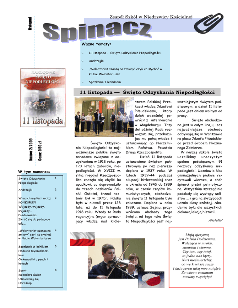 listopad Zespół Szkół w Niedrzwicy Kościelnej Ważne tematy: 11 listopada - Święto Odzyskania Niepodległości. Andrzejki. „Wolontariat szansą na zmiany” czyli co słychać w Klubie Wolontariusza Spotkanie z leśnikiem. Cena: 0,50 zł Numer 2/2009 11 listopada — Święto Odzyskania Niepodległości W tym numerze: Święto Odzyskanie 1 Niepodległości Andrzejki 2 W moich myślach wciąż 3 KONKURSY! Wyjazdy, wyjazdy, wyjazdy... Pozdrowienia Zwróć się do pedagoga gdy... „Wolontariat szansą na zmiany” czyli co słychać w Klubie Wolontariusza 4 Spotkanie z leśnikiem 5 Hodowla Myszoskoczków Ciekawostki o psach i kotach Sport Kalendarz Świąt Uśmiechnij się Horoskop 6 Święto Odzyskania Niepodległości to najważniejsze polskie święto narodowe związane z odzyskaniem w 1918 roku, po 123 latach zaborów, niepodległości. W XVIII w. silna niegdyś Rzeczpospolita zaczęła się chylić ku upadkowi, co doprowadziło do trzech rozbiorów Polski. Ostatni, trzeci rozbiór był w 1975r. Polska była w niewoli przez 123 lata, aż do 11 listopada 1918 roku. Wtedy to Rada regencyjna (organ sprawujący władzę nad Króle- stwem Polskim) Przekazał władzę Józefowi Piłsudskiemu, który dzień wcześniej powrócił z internowania w Magdeburgu. Trzy dni później Rada rozwiązała się, przekazując mu pełną władze i ustanawiając go Naczelnikiem Państwa. Powstała Druga Rzeczpospolita. Dzień 11 listopada ustanowiono świętem państwowym po raz pierwszy dopiero w 1937 roku. W latach 1939-44 podczas okupacji hitlerowskiej oraz w okresie od 1945 do 1989 roku, w czasie rządów komunistycznych, obchodzenie święta 11 listopada było zakazane. Dopiero w roku 1989, ustawą Sejmu, przywrócono obchody tego święta, od tego roku Święto Niepodległości jest naj- ważniejszym świętem państwowym, a dzień 11 listopada jest dniem wolnym od pracy. Święto obchodzone jest w całym kraju, lecz najważniejsze obchody odbywają się w Warszawie na placu Józefa Piłsudskiego przed Grobem Nieznanego Żołnierza. W naszej szkole święto uczciliśmy uroczystym apelem poświęconym 91 rocznicy odzyskania niepodległości. Uczniowie klas gimnazjalnych pięknie recytowali wiersze, a chór śpiewał pieśni patriotyczne. Wszystkim szczególnie podobały się występy solistów … i gra na skrzypcach ucznia klasy szóstej. Akademia była dla wszystkich ciekawą lekcją historii. /Natalia/ Moją ojczyzną jest Polska Podziemna, Walcząca w mroku, samotna i ciemna. Czy tam, czy tutaj, to jedno nas łączy, Nurt nieśmiertelny, co we krwi się sączy I każe sercu taką moc natężyć, Że wbrew rozumom musimy zwyciężyć Spinacz Str. 2 Dzień św. Andrzeja - ANDRZEJKI Numer 2/2009 Święto Andrzeja Apostoła przypada 30 listopada. Jest on patronem Szkocji, Grecji i Rosji. Według katolickiej tradycji prowadził działalność na terenach nad Morzem Czarnym. Jego dzień ma miejsce na przełomie starego i nowego roku liturgicznego. W Kościołach prawosławnych oraz w katolickich Kościołach wschodnich jest on ob- darzany wielką czcią, jako jeden z głównych świętych. Stąd wzięły się Andrzejki, które przypadają na wigilię dnia św. Andrzeja. W obecnych czasach to przede wszystkim dobra zabawa i kolejna okazja do spotkania się ze znajomymi, ale kiedyś wróżby andrzejkowe były traktowane znacznie poważniej. Z okazji Andrzejek Samorząd Uczniowski organizuje dyskotekę, która odbędzie się 26.11.2009 r. w naszej szkole. Oprócz dobrej zabawy oczywiście przewidziane są andrzejkowe wróżby. Zamiast opłaty za bilet prosimy przynieść jakąś maskotkę lub słodycze, które zostaną przekazane na akcję: „Pomóż dzieciom przetrwać zimę”. 1 2 3 4 5 6 8 9 10 11 7 Pogańskie korzenie Jest to święto religijne, jednak obchodzone jest w pogański sposób. Poza kręgiem kultury chrześcijańskiej istnieją inne hipotezy sięgające dalej. Jedna z nich kojarzy Andrzejki z greckimi, antycznymi wierzeniami ludowymi - Andrzej (gr. Andress) pochodzi od greckich słów aner - mąż, andros mężczyzna. Inna hipoteza szuka źródeł wróżb andrzejkowych w celtyckim i germańskim kultem boga Freyra, który był bogiem płodności i urodzaju, światła słonecznego i deszczu, podobnie jak św. Andrzej. Wierzono, że jego wstawiennictwo tego szczególnego dnia, w wigilię jego święta, pozwoli na moment wejrzeć w przyszłość. Historia Andrzejek Poziomo 3. wróżysz sobie, bo chcesz ją poznać 5. zaczyna się wkrótce po Andrzejkach 6. sposób przepowiadania przyszłości 8. lejemy go przez ucho klucza 9. najlepsza pora na andrzejkową zabawę 11. miesiąc, w którym obchodzi się Andrzejki Pionowo 1. wróżą sobie panny i ... 2. inaczej wróżba 4. rychło chce go wziąć panna 7. święto wróżb 10. w popularnej wróżbie ustawiamy je kolejno w kierunku drzwi Święto było znane w Europie już w XII w. Do Polski dotarło nie później niż w XVI w., co potwierdzają pisane źródła. Tradycja wróżb andrzejkowych cieszyła się dużą popularnością zarówno w naszym kraju, jak i za granicą. W niektórych szkołach (tak jak w naszej) nadal kultywowana jest tradycja andrzejkowa. Po lekcjach organizowane są dyskoteki, na których, korzysta się ze starych wróżb. Wróżb takich, jak lanie wosku przez klucz, przestawianie rządek butów w kierunku progu czy przekłuwanie papierowe serca szpilkami. /Ania/ Str. 3 W moich myślach wciąż KONKURSY! Jak to było w poprzednich latach, tak i w tym roku, dla uczniów szkół podstawowych i gimnazjów Lubelskie Kuratorium Oświaty zorganizowało różnego rodzaju konkursy i olimpiady. Każdy mógł znaleźć coś dla siebie. A były to konkursy takie, jak: polonistyczny, historyczny, geograficzny, biologiczny, matematyczny, fizyczny. Wszystkie konkursowe eliminacje odbywały się o godzinie 1000. To był czas wielkich zmagań i główkowania nad zadaniami. Na pewno nie było łatwo. /Ania/ Zwróć się do pedagoga sz