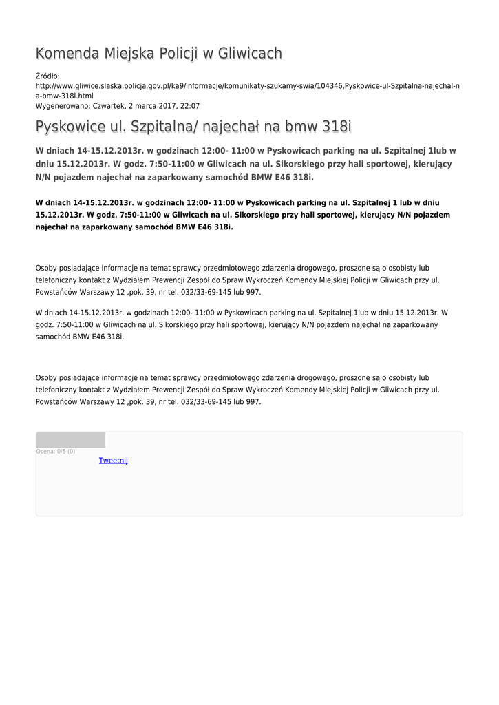 Komenda Miejska Policji w Gliwicach Źródło: http://www.gliwice.slaska.policja.gov.pl/ka9/informacje/komunikaty-szukamy-swia/104346,Pyskowice-ul-Szpitalna-najechal-n a-bmw-318i.html Wygenerowano: Czwartek, 2 marca 2017, 22:07 Pyskowice ul. Szpitalna/ najechał na bmw 318i W dniach 14-15.12.2013r. w godzinach 12:00- 11:00 w Pyskowicach parking na ul. Szpitalnej 1lub w dniu 15.12.2013r. W godz. 7:50-11:00 w Gliwicach na ul. Sikorskiego przy hali sportowej, kierujący N/N pojazdem najechał na zaparkowany samochód BMW E46 318i. W dniach 14-15.12.2013r. w godzinach 12:00- 11:00 w Pyskowicach parking na ul. Szpitalnej 1 lub w dniu 15.12.2013r. W godz. 7:50-11:00 w Gliwicach na ul. Sikorskiego przy hali sportowej, kierujący N/N pojazdem najechał na zaparkowany samochód BMW E46 318i. Osoby posiadające informacje na temat sprawcy przedmiotowego zdarzenia drogowego, proszone są o osobisty lub telefoniczny kontakt z Wydziałem Prewencji Zespół do Spraw Wykroczeń Komendy Miejskiej Policji w Gliwicach przy ul. Powstańców Warszawy 12 ,pok. 39, nr tel. 032/33-69-145 lub 997. W dniach 14-15.12.2013r. w godzinach 12:00- 11:00 w Pyskowicach parking na ul. Szpitalnej 1lub w dniu 15.12.2013r. W godz. 7:50-11:00 w Gliwicach na ul. Sikorskiego przy hali sportowej, kierujący N/N pojazdem najechał na zaparkowany samochód BMW E46 318i. Osoby posiadające informacje na temat sprawcy przedmiotowego zdarzenia drogowego, proszone są o osobisty lub telefoniczny kontakt z Wydziałem Prewencji Zespół do Spraw Wykroczeń Komendy Miejskiej Policji w Gliwicach przy ul. Powstańców Warszawy 12 ,pok. 39, nr tel. 032/33-69-145 lub 997. Ocena: 0/5 (0) Tweetnij