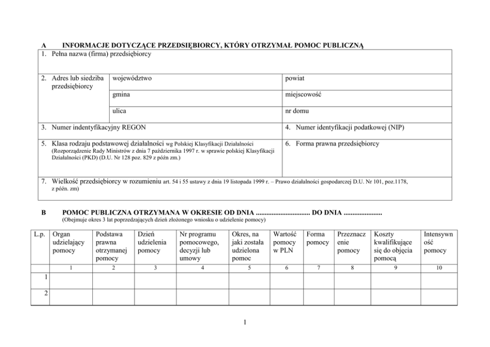 A INFORMACJE DOTYCZĄCE PRZEDSIĘBIORCY, KTÓRY OTRZYMAŁ POMOC PUBLICZNĄ 1. Pełna nazwa (firma) przedsiębiorcy 2. Adres lub siedziba przedsiębiorcy województwo powiat gmina miejscowość ulica nr domu 3. Numer indentyfikacyjny REGON 4. Numer identyfikacji podatkowej (NIP) 5. Klasa rodzaju podstawowej działalności wg Polskiej Klasyfikacji Działalności 6. Forma prawna przedsiębiorcy (Rozporządzenie Rady Ministrów z dnia 7 października 1997 r. w sprawie polskiej Klasyfikacji Działalności (PKD) (D.U. Nr 128 poz. 829 z późn zm.) 7. Wielkość przedsiębiorcy w rozumieniu art. 54 i 55 ustawy z dnia 19 listopada 1999 r. – Prawo działalności gospodarczej D.U. Nr 101, poz.1178, z późn. zm) B POMOC PUBLICZNA OTRZYMANA W OKRESIE OD DNIA ............................... DO DNIA ...................... (Obejmuje okres 3 lat poprzedzających dzień złożonego wniosku o udzielenie pomocy) L.p. Organ udzielający pomocy 1 Podstawa prawna otrzymanej pomocy 2 Dzień udzielenia pomocy 3 Nr programu pomocowego, decyzji lub umowy Okres, na jaki została udzielona pomoc 4 5 1 2 1 Wartość pomocy w PLN 6 Forma pomocy Przeznacz enie pomocy 7 8 Koszty kwalifikujące się do objęcia pomocą 9 Intensywn ość pomocy 10 3 C Dane osoby upoważnionej do udzielania informacji ......................................... (imię i nazwisko) ............................................... (stanowisko służbowe) ........................ (data i podpis) Dane osoby upoważnionej do kontaktów z organem udzielającym pomocy w sprawie informacji zawartych w formularzu ......................................... (imię i nazwisko) ............................................... telefon ........................ (stanowisko służbowe) fax ............................ e-mail ............................ Uwaga: Zgodnie z art. 47 ust. 2 ustawy z dnia 27 lipca 2002 r. o warunkach dopuszczalności i nadzorowaniu pomocy publicznej dla przedsiębiorców (D.U. Nr 141, poz. 1177) w przypadku przekazania informacji, o których mowa w art. 44 ust. 1 tej ustawy, niezgodnych ze stanem faktycznym organ nadzorujący może, w drodze decyzji, nałożyć na przedsiębiorcę karę pieniężną w wysokości do 1% wartości udzielonej pomocy. 2