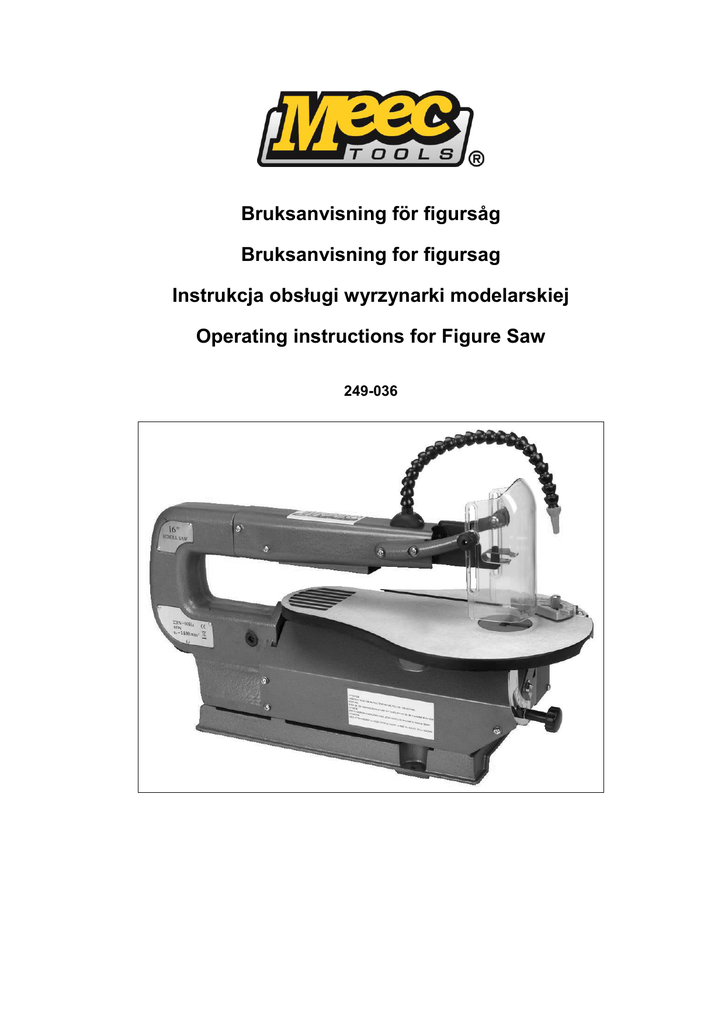 Bruksanvisning för figursåg Bruksanvisning for figursag Instrukcja obsługi wyrzynarki modelarskiej Operating instructions for Figure Saw 249-036 SE – Bruksanvisning i original Rätten till ändringar förbehålles. Vid eventuella problem, kontakta vår serviceavdelning på telefon 0200-88 55 88. www.jula.se NO – Bruksanvisning (Oversettelse av original bruksanvisning) Med forbehold om endringer. Ved eventuelle problemer kan du kontakte vår serviceavdeling på telefon 67 90 01 34. www.jula.no PL – Instrukcja obsługi (Tłumaczenie oryginalnej instrukcji) Z zastrzeżeniem prawa do zmian. W razie ewentualnych problemów skontaktuj się telefonicznie z naszym działem obsługi klienta pod numerem: 22 338 88 88. www.jula.pl EN – Operating instructions (Translation of the original instructions) Jula reserves the right to make changes. In the event of problems, please contact our service department. www.jula.com Tillverkare/ Produsent/ Producenci/ Manufacturer Jula AB, Box 363, 532 24 SKARA Importör/ Importør/ Importer/ Importer Jula Norge AS, Solheimsveien 6–8, 1471 LØRENSKOG Distributör/ Distributør/ Dystrybutor/ Distributor Jula Poland Sp. z o.o., ul. Malborska 49, 03-286 Warszawa, Polska Date of production: 2016-10-20 © Jula AB SVENSKA 5 ELEKTRISK SÄKERHET ......................................................................................................................... 6 Nätanslutning ....................................................................................................................................... 6 Byte av nätanslutningsledningen ......................................................................................................... 6 Byte av kablar eller kontakter .............................................................................................................. 6 Användning av förlängningssladdar ..................................................................................................... 6 SPECIELLA SÄKERHETSÅTGÄRDER ................................................................................................... 6 FÖRPACKNINGEN INNEHÅLLER .......................................................................................................... 7 MONTERING AV SKYDDSHUVEN ......................................................................................................... 7 MONTERING AV TVÄRGEJDEN ............................................................................................................ 8 SPÅNBLÅS .............................................................................................................................................. 8 Installation ............................................................................................................................................ 8 LUTNING AV BORDET ............................................................................................................................ 9 ADAPTRAR FÖR UNIVERSALSÅGBLAD .............................................................................................. 9 INSTALLATION AV SÅGBLADET ......................................................................................................... 10 DEMONTERING AV SÅGBLADET ........................................................................................................ 10 RENGÖRING ......................................................................................................................................... 11 SMÖRJNING .......................................................................................................................................... 11 STÖRNINGAR ....................................................................................................................................... 11 MILJÖ ..................................................................................................................................................... 11 GARANTI ............................................................................................................................................... 11 NORSK 12 ELEKTRISK SIKKERHET ...................................................................................................................... 13 Nettilkobling ....................................................................................................................................... 13 Bytte av nettilkoblingsledningen ........................................................................................................ 13 Bytte av kabler eller kontakter ........................................................................................................... 13 Bruk av skjøteledninger ..................................................................................................................... 13 SPESIELLE SIKKERHETSTILTAK ........................................................................................................ 13 PAKNINGEN INNEHOLDER ................................................................................................................. 14 MONTERING AV BESKYTTELSESDEKSELET ................................................................................... 15 MONTERING AV TVERRSLEIDEN ....................................................................................................... 15 SPONBLÅSER ....................................................................................................................................... 16 Installasjon ......................................................................................................................................... 16 HELLING AV BORDET .......................................................................................................................... 16 ADAPTERE FOR UNIVERSALSAGBLAD ............................................................................................. 17 