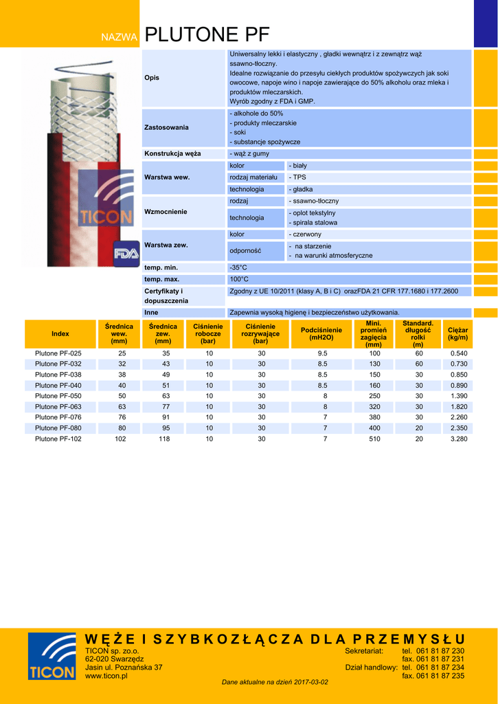 NAZWA PLUTONE PF Opis Uniwersalny lekki i elastyczny , gładki wewnątrz i z zewnątrz wąż ssawno-tłoczny. Idealne rozwiązanie do przesyłu ciekłych produktów spożywczych jak soki owocowe, napoje wino i napoje zawierające do 50% alkoholu oraz mleka i produktów mleczarskich. Wyrób zgodny z FDA i GMP. Zastosowania - alkohole do 50% - produkty mleczarskie - soki - substancje spożywcze Konstrukcja węża - wąż z gumy Warstwa wew. Wzmocnienie Warstwa zew. kolor - biały rodzaj materiału - TPS technologia - gładka rodzaj - ssawno-tłoczny technologia - oplot tekstylny - spirala stalowa kolor - czerwony odporność - na starzenie - na warunki atmosferyczne temp. min. -35°C temp. max. 100°C Certyfikaty i dopuszczenia Zgodny z UE 10/2011 (klasy A, B i C) orazFDA 21 CFR 177.1680 i 177.2600 Inne Zapewnia wysoką higienę i bezpieczeństwo użytkowania. Plutone PF-025 25 35 10 30 9.5 Mini. Mini. promień promień zagięcia zagięcia (mm) (mm) 100 Plutone PF-032 32 43 10 30 8.5 130 60 0.730 Plutone PF-038 38 49 10 30 8.5 150 30 0.850 Plutone PF-040 40 51 10 30 8.5 160 30 0.890 Plutone PF-050 50 63 10 30 8 250 30 1.390 Plutone PF-063 63 77 10 30 8 320 30 1.820 Plutone PF-076 76 91 10 30 7 380 30 2.260 Plutone PF-080 80 95 10 30 7 400 20 2.350 Plutone PF-102 102 118 10 30 7 510 20 3.280 Index Index Średnica wew. (mm) Średnica zew. (mm) Ciśnienie robocze (bar) Ciśnienie rozrywające (bar) Podciśnienie Podciśnienie (mH2O) (mH2O) Standard. Standard. długość długość rolki rolki (m) (m) 60 Ciężar Ciężar (kg/m) (kg/m) 0.540 WĘŻE I SZYBKOZŁĄCZA DLA PRZEMYSŁU TICON sp. zo.o. 62-020 Swarzędz Jasin ul. Poznańska 37 www.ticon.pl Sekretariat: Dane aktualne na dzień 2017-03-02 tel. 061 81 87 230 fax. 061 81 87 231 Dział handlowy: tel. 061 81 87 234 fax. 061 81 87 235