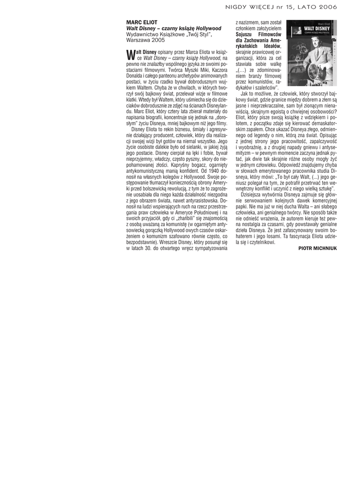 NIGDY WIĘCEJ nr 15, LATO 2006 MARC ELIOT Walt Disney – czarny książę Hollywood Wydawnictwo Książkowe „Twój Styl”, Warszawa 2005 alt Disney opisany przez Marca Eliota w książW ce Walt Disney – czarny książę Hollywood, na pewno nie znalazłby wspólnego języka ze swoimi po- staciami filmowymi. Twórca Myszki Miki, Kaczora Donalda i całego panteonu archetypów animowanych postaci, w życiu rzadko bywał dobrodusznym wujkiem Waltem. Chyba że w chwilach, w których tworzył swój bajkowy świat, przelewał wizje w filmowe klatki. Wtedy był Waltem, który uśmiecha się do dzieciaków dobrodusznie ze zdjęć na ścianach Disneylandu. Marc Eliot, który cztery lata zbierał materiały do napisania biografii, koncentruje się jednak na „dorosłym” życiu Disneya, mniej bajkowym niż jego filmy. Disney Eliota to rekin biznesu, śmiały i agresywnie działający producent, człowiek, który dla realizacji swojej wizji był gotów na niemal wszystko. Jego życie osobiste dalekie było od sielanki, w jakiej żyją jego postacie. Disney cierpiał na lęki i fobie, bywał nieprzyjemny, władczy, często pyszny, skory do niepohamowanej złości. Kapryśny bogacz, ogarnięty antykomunistyczną manią konfident. Od 1940 donosił na własnych kolegów z Hollywood. Swoje postępowanie tłumaczył koniecznością obrony Ameryki przed bolszewicką rewolucją, z tym że to zagrożenie uosabiała dla niego każda działalność niezgodna z jego obrazem świata, nawet antyrasistowska. Donosił na ludzi wspierających ruch na rzecz przestrzegania praw człowieka w Ameryce Południowej i na swoich przyjaciół, gdy ci „zhańbili” się znajomością z osobą uważaną za komunistę (w ogarniętym antysowiecką gorączką Hollywood owych czasów oskarżeniem o komunizm szafowano równie często, co bezpodstawnie). Wreszcie Disney, który posunął się w latach 30. do otwartego wręcz sympatyzowania z nazizmem, sam został członkiem założycielem Sojuszu Filmowców dla Zachowania Amerykańskich Ideałów, skrajnie prawicowej organizacji, która za cel stawiała sobie walkę „(…) ze zdominowaniem branży filmowej przez komunistów, radykałów i szaleńców”. Jak to możliwe, że człowiek, który stworzył bajkowy świat, gdzie granice między dobrem a złem są jasne i nieprzekraczalne, sam był zionącym nienawiścią, skrajnym egoistą o chwiejnej osobowości? Eliot, który pisze swoją książkę z wdziękiem i polotem, z początku zdaje się kierować demaskatorskim zapałem. Chce ukazać Disneya złego, odmiennego od legendy o nim, którą zna świat. Opisując z jednej strony jego pracowitość, zapalczywość i wyobraźnię, a z drugiej napady gniewu i antysemityzm – w pewnym momencie zaczyna jednak pytać, jak dwie tak skrajnie różne osoby mogły żyć w jednym człowieku. Odpowiedź znajdujemy chyba w słowach emerytowanego pracownika studia Disneya, który mówi: „To był cały Walt, (...) jego geniusz polegał na tym, że potrafił przetrwać ten wewnętrzny konflikt i uczynić z niego wielką sztukę”. Dzisiejsza wytwórnia Disneya zajmuje się głównie serwowaniem kolejnych dawek komercyjnej papki. Nie ma już w niej ducha Walta – ani słabego człowieka, ani genialnego twórcy. Nie sposób także nie odnieść wrażenia, że autorem kieruje też pewna nostalgia za czasami, gdy powstawały genialne dzieła Disneya. Że jest zafascynowany swoim bohaterem i jego losami. Ta fascynacja Eliota udziela się i czytelnikowi. PIOTR MICHNIUK