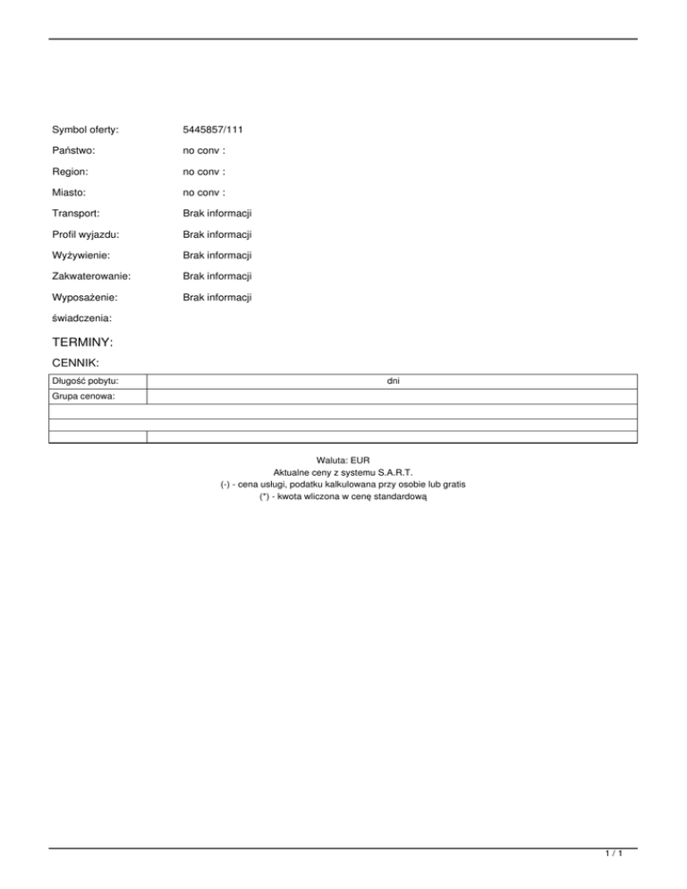 Symbol oferty: 5445857/111 Państwo: no conv : Region: no conv : Miasto: no conv : Transport: Brak informacji Profil wyjazdu: Brak informacji Wyżywienie: Brak informacji Zakwaterowanie: Brak informacji Wyposażenie: Brak informacji świadczenia: TERMINY: CENNIK: Długość pobytu: dni Grupa cenowa: Waluta: EUR Aktualne ceny z systemu S.A.R.T. (-) - cena usługi, podatku kalkulowana przy osobie lub gratis (*) - kwota wliczona w cenę standardową 1/1