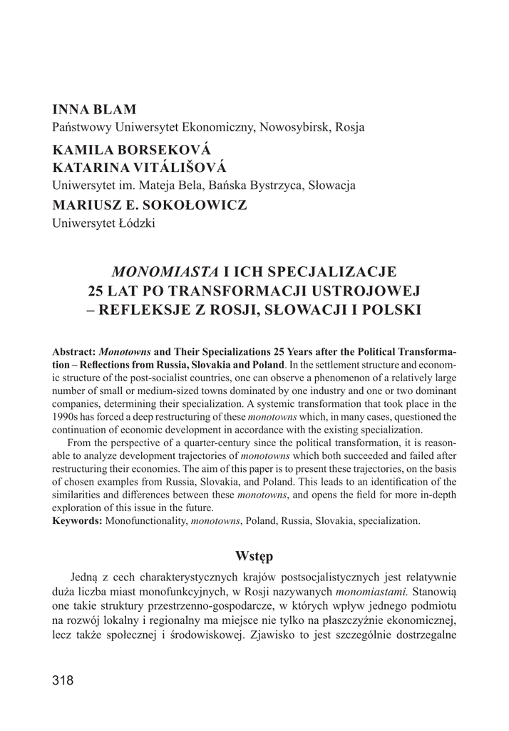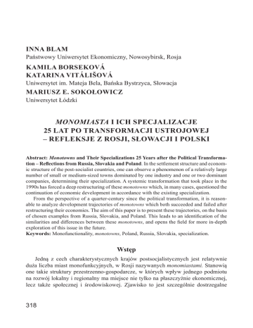 INNA BLAM Państwowy Uniwersytet Ekonomiczny, Nowosybirsk, Rosja KAMILA BORSEKOVÁ KATARINA VITÁLIŠOVÁ Uniwersytet im. Mateja Bela, Bańska Bystrzyca, Słowacja MARIUSZ E. SOKOŁOWICZ Uniwersytet Łódzki MONOMIASTA I ICH SPECJALIZACJE 25 LAT PO TRANSFORMACJI USTROJOWEJ – REFLEKSJE Z ROSJI, SŁOWACJI I POLSKI Abstract: Monotowns and Their Specializations 25 Years after the Political Transformation – Reflections from Russia, Slovakia and Poland. In the settlement structure and economic structure of the post-socialist countries, one can observe a phenomenon of a relatively large number of small or medium-sized towns dominated by one industry and one or two dominant companies, determining their specialization. A systemic transformation that took place in the 1990s has forced a deep restructuring of these monotowns which, in many cases, questioned the continuation of economic development in accordance with the existing specialization. From the perspective of a quarter-century since the political transformation, it is reasonable to analyze development trajectories of monotowns which both succeeded and failed after restructuring their economies. The aim of this paper is to present these trajectories, on the basis of chosen examples from Russia, Slovakia, and Poland. This leads to an identification of the similarities and differences between these monotowns, and opens the field for more in-depth exploration of this issue in the future. Keywords: Monofunctionality, monotowns, Poland, Russia, Slovakia, specialization. Wstęp Jedną z cech charakterystycznych krajów postsocjalistycznych jest relatywnie duża liczba miast monofunkcyjnych, w Rosji nazywanych monomiastami. Stanowią one takie struktury przestrzenno-gospodarcze, w których wpływ jednego podmiotu na rozwój lokalny i regionalny ma miejsce nie tylko na płaszczyźnie ekonomicznej, lecz także społecznej i środowiskowej. Zjawisko to jest szczególnie dostrzegalne 318 w Rosji, jakkolwiek ich rozwój odbywał się w zasadzie w każdym z krajów byłego bloku wschodniego. Umownie za monomiasta1 uznaje się jednostki osadnicze liczące maksymalnie ok. 50 tys. mieszkańców, których baza ekonomiczna oparta jest na jednej lub dwóch kluczowych gałęziach gospodarki [UN HABITAT 2013, s. 17]. Dominacja ta dotyczy również liczby przedsiębiorstw jako kluczowych pracodawców, która często ogranicza się do jednego lub dwóch podmiotów, których działalność istotnie warunkuje specjalizację gospodarczą. W krajach Europy Środkowo-Wschodniej, termin monomiasta, charakterystyczny dla Rosji, nie upowszechnił się. W odniesieniu do tego typu ośrodków używa się częściej terminu miasta monofunkcyjne albo małe miasta zdominowane przez jedną gałąź gospodarki. W tym kontekście, małe i średnie miasta można podzielić na trzy zasadnicze kategorie [Brol et al. 1990; Brol 2010, s. 16]: ●● Miasta stanowiące ośrodki centralne dla regionów rolniczych. ●● Miasta zlokalizowane w bezpośrednim sąsiedztwie lub w ramach aglomeracji miejskich. ●● Miasta o wyspecjalizowanych funkcjach egzogenicznych (monofunkcyjne). W obecnych uwarunkowaniach gospodarczych, to przede wszystkim miasta drugiej kategorii osiągają sukces z punktu widzenia gospodarczego. W przypadku miast stanowiących centra produkcji rolniczej oraz miast monofunkcyjnych, zwykle obserwuje się problemy wynikające z transformacji gospodarczej i tylko w odniesieniu do części z nich można wskazać przykłady sukcesów. W przypadku trzeciej kategorii miast, największe wyzwania rozwojowe dotyczą ośrodków, w których dominującą funkcją gospodarczą okazał się przemysł. Wynika to w dużej mierze z tego, że w tego typu monomiastach, w odróżnieniu od ośrodków rozwijających się przede wszystkim na bazie funkcji handlowych i usługowych2, zarówno rozwój, jak i pogorszenie koniunktury mają charakter dynamiczny i skokowy. Miasta te nie rozwijały się bowiem powoli, zaspokajając potrzeby wewnętrzne i najbliższych okolic, lecz notowały bardzo dynamiczny wzrost liczby mieszkańców i miejsc pracy. Ponadto to raczej potrzeby monomiast przemysłowych oddziałują na sytuację gospodarczą ich regionów a nie odwrotnie. Małe i średnie miasta zdominowane przez jedną gałąź przemysłu pozostają przy tym silnie podatne na fluktuacje rynkowe, co w przypadku istotnych załamań gospodarczych skutkuje stagnacją, kryzysem, masowym bezrobociem oraz nagle pojawiającą się potrzebą poszukiwania nowej bazy ekonomicznej [Szymańska 2009, s. 240]. 1 Choć termin monomiasta jest upowszechniony jedynie w Rosji, na potrzeby porównań z sytuacją tego typu ośrodków między trzema wskazanymi w tytule krajami, będzie w prezentowanym opracowaniu stosowany także do opisu miast polskich i słowackich. 2 Z punktu widzenia specjalizacji gospodarczej można wyróżnić miasta przemysłowe, handlowe, usługowe i miasta o dominującej funkcji administracyjnej [Szymańska 2009, s. 235]. Inna klasyfikacja pozwala natomiast wyróżnić miasta przemysłowe, usługowo-handlowe, pełniące funkcję węzłów transportowych, miasta portowe, turystyczne i akademickie [Domański 2006, s. 24]. 319 O ile w przypadku miast stanowiących wcześniej centra produkcji rolniczej, transformują one swoje funkcje gospodarcze w kierunku gospodarki opartej na turystyce i rekreacji (zwykle na skutek rozwoju dużej liczby małych przedsiębiorstw), o tyle w przypadku miast o wyspecjalizowanych funkcjach egzogenicznych opartych na wybranej gałęzi przemysłu, główny ciężar transformacji spoczywa na dominujących przedsiębiorstwach, które muszą odnaleźć się w nowej rzeczywistości gospodarczej [Heffner, Marszał 2005]. Nie dziwi zatem, że to właśnie monomiasta przemysłowe szczególnie dotkliwie odczuły zarówno transformację ustrojową, jak i szersze przemiany społeczne, gospodarcze i polityczne, jakie nastąpiły w ciągu ostatniego ćwierćwiecza. Do przemian 