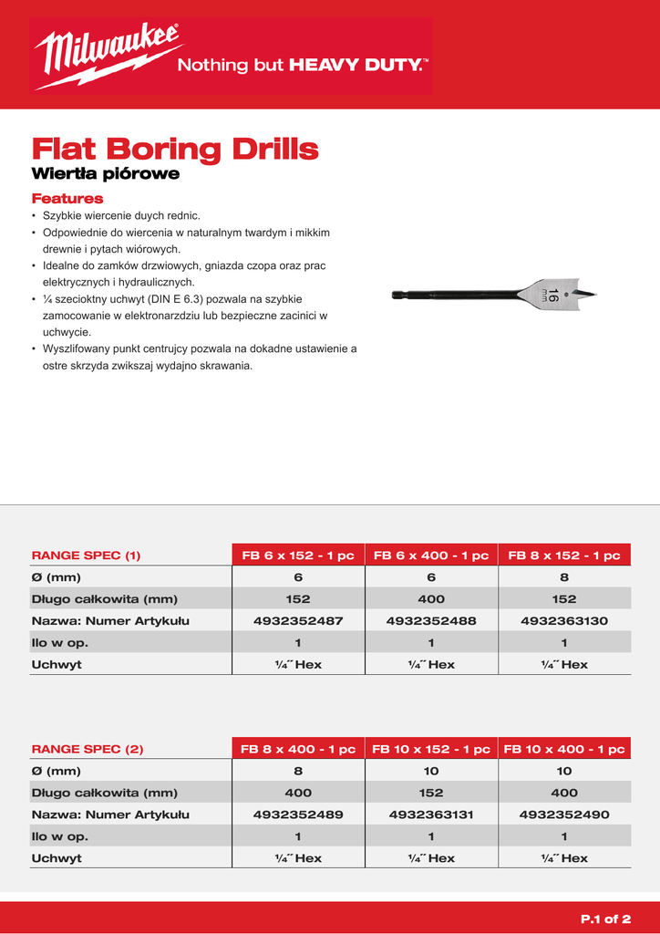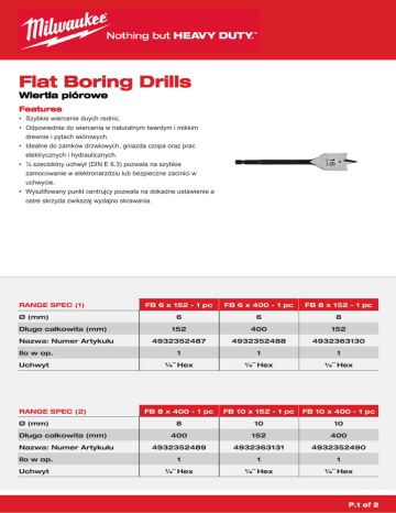 Flat Boring Drills Wiertła piórowe Features • Szybkie wiercenie duych rednic. • Odpowiednie do wiercenia w naturalnym twardym i mikkim drewnie i pytach wiórowych. • Idealne do zamków drzwiowych, gniazda czopa oraz prac elektrycznych i hydraulicznych. • ¼ szecioktny uchwyt (DIN E 6.3) pozwala na szybkie zamocowanie w elektronarzdziu lub bezpieczne zacinici w uchwycie. • Wyszlifowany punkt centrujcy pozwala na dokadne ustawienie a ostre skrzyda zwikszaj wydajno skrawania. RANGE SPEC (1) Ø (mm) Długo całkowita (mm) Nazwa: Numer Artykułu Ilo w op. Uchwyt RANGE SPEC (2) Ø (mm) Długo całkowita (mm) Nazwa: Numer Artykułu Ilo w op. Uchwyt FB 6 x 152 - 1 pc FB 6 x 400 - 1 pc FB 8 x 152 - 1 pc 6 6 8 152 400 152 4932352487 4932352488 4932363130 1 1 1 ¼˝ Hex ¼˝ Hex ¼˝ Hex FB 8 x 400 - 1 pc FB 10 x 152 - 1 pc FB 10 x 400 - 1 pc 8 10 10 400 152 400 4932352489 4932363131 4932352490 1 1 1 ¼˝ Hex ¼˝ Hex ¼˝ Hex P.1 of 2 RANGE SPEC (3) Ø (mm) Długo całkowita (mm) Nazwa: Numer Artykułu Ilo w op. Uchwyt RANGE SPEC (4) Ø (mm) Długo całkowita (mm) Nazwa: Numer Artykułu Ilo w op. Uchwyt RANGE SPEC (5) Ø (mm) Długo całkowita (mm) Nazwa: Numer Artykułu Ilo w op. Uchwyt RANGE SPEC (6) Ø (mm) Długo całkowita (mm) Nazwa: Numer Artykułu Ilo w op. Uchwyt FB 12 x 152 - 1 pc FB 12 x 400 - 1 pc FB 13 x 152 - 1 pc 12 12 13 152 400 152 4932363132 4932352491 4932363133 1 1 1 ¼˝ Hex ¼˝ Hex ¼˝ Hex FB 13 x 400 - 1 pc FB 14 x 152 - 1 pc FB 14 x 400 - 1 pc 13 14 14 400 152 400 4932352492 4932363134 4932352493 1 1 1 ¼˝ Hex ¼˝ Hex ¼˝ Hex FB 16 x 152 - 1 pc FB 16 x 400 - 1 pc FB 18 x 152 - 1 pc 16 16 18 152 400 152 4932363135 4932352494 4932363136 1 1 1 ¼˝ Hex ¼˝ Hex ¼˝ Hex FB 18 x 400 - 1 pc FB 19 x 152 - 1 pc FB 19 x 400 - 1 pc 18 19 19 400 152 400 4932352495 4932363137 4932352496 1 1 1 ¼˝ Hex ¼˝ Hex ¼˝ Hex P.2 of 2 RANGE SPEC (7) FB 20 x 152 - 1 pc FB 20 x 400 - 1 pc FB 22 x 152 - 1 pc Ø (mm) 20 20 22 Długo całkowita (mm) 152 400 152 4932363138 4932352497 4932363139 1 1 1 ¼˝ Hex ¼˝ Hex ¼˝ Hex Nazwa: Numer Artykułu Ilo w op. Uchwyt RANGE SPEC (8) Ø (mm) Długo całkowita (mm) Nazwa: Numer Artykułu Ilo w op. Uchwyt RANGE SPEC (9) Ø (mm) Długo całkowita (mm) Nazwa: Numer Artykułu Ilo w op. Uchwyt RANGE SPEC (10) Ø (mm) Długo całkowita (mm) Nazwa: Numer Artykułu Ilo w op. Uchwyt FB 22 x 400 - 1 pc FB 24 x 152 - 1 pc FB 25 x 152 - 1 pc 22 24 25 400 152 152 4932352498 4932363140 4932363141 1 1 1 ¼˝ Hex ¼˝ Hex ¼˝ Hex FB 25 x 400 - 1 pc FB 26 x 152 - 1 pc FB 28 x 152 - 1 pc 25 26 28 400 152 152 4932352499 4932363142 4932363143 1 1 1 ¼˝ Hex ¼˝ Hex ¼˝ Hex FB 28 x 400 - 1 pc FB 30 x 152 - 1 pc FB 30 x 400 - 1 pc 28 30 30 400 152 400 4932352500 4932363144 4932352501 1 1 1 ¼˝ Hex ¼˝ Hex ¼˝ Hex P.3 of 2 RANGE SPEC (11) FB 32 x 152 - 1 pc FB 32 x 400 - 1 pc FB 36 x 152 - 1 pc Ø (mm) 32 32 36 Długo całkowita (mm) 152 400 152 4932363145 4932352502 4932363146 1 1 1 ¼˝ Hex ¼˝ Hex ¼˝ Hex Nazwa: Numer Artykułu Ilo w op. Uchwyt RANGE SPEC (12) Ø (mm) Długo całkowita (mm) Nazwa: Numer Artykułu Ilo w op. Uchwyt FB 35 x 400 - 1 pc FB 38 x 152 - 1 pc 35 38 400 152 4932352503 4932363147 1 1 ¼˝ Hex ¼˝ Hex P.4 of 2