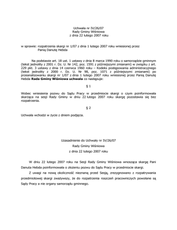 Uchwała nr IV/26/07 Rady Gminy Wiśniowa z dnia 22 lutego 2007 roku w sprawie: rozpatrzenia skargi nr 1/07 z dnia 1 lutego 2007 roku wniesionej przez Panią Danutę Hebda Na podstawie art. 18 ust. 1 ustawy z dnia 8 marca 1990 roku o samorządzie gminnym (tekst jednolity z 2001 r. Dz. U. Nr 142, poz. 1591 z późniejszymi zmianami) w związku z art. 229 pkt. 3 ustawy z dnia 14 czerwca 1960 roku – Kodeks postępowania administracyjnego (tekst jednolity z 2000 r. Dz. U. Nr 98, poz. 1071 z późniejszymi zmianami) po przeanalizowaniu skargi nr 1/07 z dnia 1 lutego 2007 roku wniesionej przez Panią Danutę Hebda Rada Gminy Wiśniowa uchwala co następuje: §1 Wobec wniesienia pozwu do Sądu Pracy w przedmiocie skargi o czym poinformowała skarŜąca na sesji Rady Gminy w dniu 22 lutego 2007 roku skargę pozostawia się bez rozpatrzenia. §2 Uchwała wchodzi w Ŝycie z dniem podjęcia. Uzasadnienie do Uchwały nr IV/26/07 Rady Gminy Wiśniowa z dnia 22 lutego 2007 roku W dniu 22 lutego 2007 roku na Sesji Rady Gminy Wiśniowa wnosząca skargę Pani Danuta Hebda poinformowała o złoŜeniu pozwu do Sądu Pracy w przedmiocie skargi. Z uwagi na nową okoliczność nieznaną przed Sesją, zrezygnowano z rozpatrywania przedmiotowej skargi zwaŜywszy, Ŝe do rozpatrzenia roszczeń pracowniczych powołane są Sądy Pracy a nie organy samorządu gminnego.
