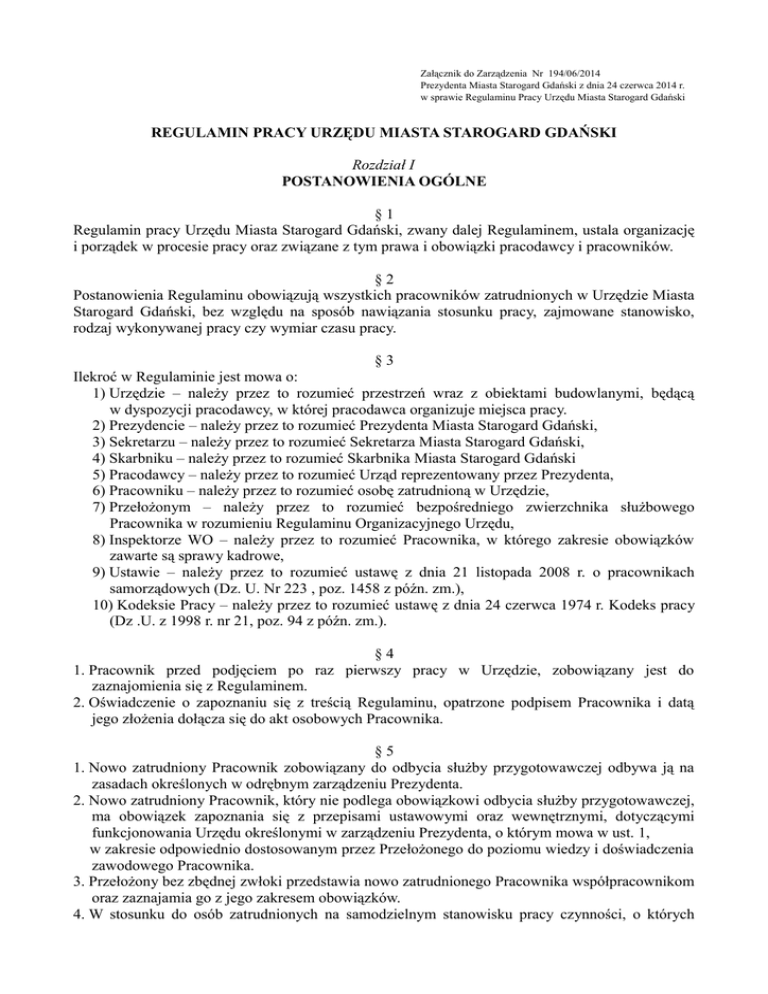 Załącznik do Zarządzenia Nr 194/06/2014 Prezydenta Miasta Starogard Gdański z dnia 24 czerwca 2014 r. w sprawie Regulaminu Pracy Urzędu Miasta Starogard Gdański REGULAMIN PRACY URZĘDU MIASTA STAROGARD GDAŃSKI Rozdział I POSTANOWIENIA OGÓLNE §1 Regulamin pracy Urzędu Miasta Starogard Gdański, zwany dalej Regulaminem, ustala organizację i porządek w procesie pracy oraz związane z tym prawa i obowiązki pracodawcy i pracowników. §2 Postanowienia Regulaminu obowiązują wszystkich pracowników zatrudnionych w Urzędzie Miasta Starogard Gdański, bez względu na sposób nawiązania stosunku pracy, zajmowane stanowisko, rodzaj wykonywanej pracy czy wymiar czasu pracy. §3 Ilekroć w Regulaminie jest mowa o: 1) Urzędzie – należy przez to rozumieć przestrzeń wraz z obiektami budowlanymi, będącą w dyspozycji pracodawcy, w której pracodawca organizuje miejsca pracy. 2) Prezydencie – należy przez to rozumieć Prezydenta Miasta Starogard Gdański, 3) Sekretarzu – należy przez to rozumieć Sekretarza Miasta Starogard Gdański, 4) Skarbniku – należy przez to rozumieć Skarbnika Miasta Starogard Gdański 5) Pracodawcy – należy przez to rozumieć Urząd reprezentowany przez Prezydenta, 6) Pracowniku – należy przez to rozumieć osobę zatrudnioną w Urzędzie, 7) Przełożonym – należy przez to rozumieć bezpośredniego zwierzchnika służbowego Pracownika w rozumieniu Regulaminu Organizacyjnego Urzędu, 8) Inspektorze WO – należy przez to rozumieć Pracownika, w którego zakresie obowiązków zawarte są sprawy kadrowe, 9) Ustawie – należy przez to rozumieć ustawę z dnia 21 listopada 2008 r. o pracownikach samorządowych (Dz. U. Nr 223 , poz. 1458 z późn. zm.), 10) Kodeksie Pracy – należy przez to rozumieć ustawę z dnia 24 czerwca 1974 r. Kodeks pracy (Dz .U. z 1998 r. nr 21, poz. 94 z późn. zm.). §4 1. Pracownik przed podjęciem po raz pierwszy pracy w Urzędzie, zobowiązany jest do zaznajomienia się z Regulaminem. 2. Oświadczenie o zapoznaniu się z treścią Regulaminu, opatrzone podpisem Pracownika i datą jego złożenia dołącza się do akt osobowych Pracownika. §5 1. Nowo zatrudniony Pracownik zobowiązany do odbycia służby przygotowawczej odbywa ją na zasadach określonych w odrębnym zarządzeniu Prezydenta. 2. Nowo zatrudniony Pracownik, który nie podlega obowiązkowi odbycia służby przygotowawczej, ma obowiązek zapoznania się z przepisami ustawowymi oraz wewnętrznymi, dotyczącymi funkcjonowania Urzędu określonymi w zarządzeniu Prezydenta, o którym mowa w ust. 1, w zakresie odpowiednio dostosowanym przez Przełożonego do poziomu wiedzy i doświadczenia zawodowego Pracownika. 3. Przełożony bez zbędnej zwłoki przedstawia nowo zatrudnionego Pracownika współpracownikom oraz zaznajamia go z jego zakresem obowiązków. 4. W stosunku do osób zatrudnionych na samodzielnym stanowisku pracy czynności, o których mowa w ust. 1 i 2 wykonuje Sekretarz. §6 Pracownik obowiązany jest bez wezwania dostarczać wszelkie dokumenty mogące rodzić przyszłe skutki finansowe np. warunkujące otrzymanie dodatku za staż pracy lub nagrody jubileuszowej. Po przedstawieniu dokumentów, prawo do świadczeń przysługuje Pracownikowi począwszy od następnego miesiąca, chyba że przepisy szczególne stanowią inaczej. Inspektor WO jest obowiązany każde doręczone zaświadczenie zaopatrzyć datą wpływu i dołączyć do akt osobowych Pracownika. Rozdział II PRAWA I OBOWIĄZKI PRACODAWCY ORAZ PRACOWNIKA §7 Pracodawca jest zobowiązany w szczególności do: 1) organizowania pracy w sposób zapewniający pełne wykorzystanie czasu pracy, jak również kwalifikacji i uzdolnień Pracownika, 2) zapewnienia bezpiecznych i higienicznych warunków pracy, prowadzenia systematycznego szkolenia Pracowników w zakresie bezpieczeństwa i higieny pracy oraz ochrony przeciwpożarowej, a także kierowania ich na profilaktyczne badania lekarskie, 3) podejmowania działań zapobiegających wypadkom przy pracy i chorobom zawodowym, 4) terminowego wypłacania wynagrodzenia za pracę i innych świadczeń, 5) ułatwiania Pracownikom nabywania i podnoszenia kwalifikacji zawodowych, 6) prowadzenia dokumentacji w sprawach związanych ze stosunkiem pracy – akt osobowych Pracowników, 7) realizowania zasady równego traktowania kobiet i mężczyzn w zakresie nawiązywania i rozwiązywania stosunku pracy, warunków zatrudnienia, awansowania oraz dostępu do szkolenia w celu podnoszenia kwalifikacji zawodowych. Informacja dotycząca równego traktowania w zatrudnieniu stanowi załącznik nr 1 do Regulaminu, 8) niestosowania i niedopuszczania do jakichkolwiek form dyskryminacji w zatrudnieniu, 9) przeciwdziałania mobbingowi na terenie Urzędu, 10) stosowania obiektywnych i sprawiedliwych kryteriów oceny wykonywanej przez Pracownika pracy, 11) zaspakajania - w miarę posiadanych środków - socjalnych i kulturalnych potrzeb Pracowników, 12) niezwłocznego wydania Pracownikowi, w związku z rozwiązaniem lub wygaśnięciem stosunku pracy, świadectwa pracy bez uzależnienia tego od wcześniejszego rozliczenia się Pracownika z Pracodawcą, 13) poszanowania dóbr osobistych i danych osobowych Pracownika, korzystania z nich w sposób i w zakresie dopuszczonym przepisami prawa oraz warunkami umowy pomiędzy Pracodawcą i Pracownikiem, 14) uprzedniego informowania o stosowanych wobec Pracowników formach kontroli pracy, w tym poprzez zapisy niniejszego Regulaminu, obejmujące informacje o celu, sposobie i zakresie ich prowadzenia. §8 1. Pracownik w szczególności zobowiązany jest do: 1) przestrzegania prawa, 2) wykonywania zadań Urzędu sumiennie, sprawnie i bezstronnie, 3) informowania organów, instytucji i osób fizycznych oraz udostępniania dokumentów znajdujących się w posiadaniu Urzędu, jeżeli prawo tego nie zabrania, 4) zachowania tajemnicy w zakresie przez prawo przewidzianym, 5) przestrzegania ustalonego w Urzędzie czasu pracy i porzą