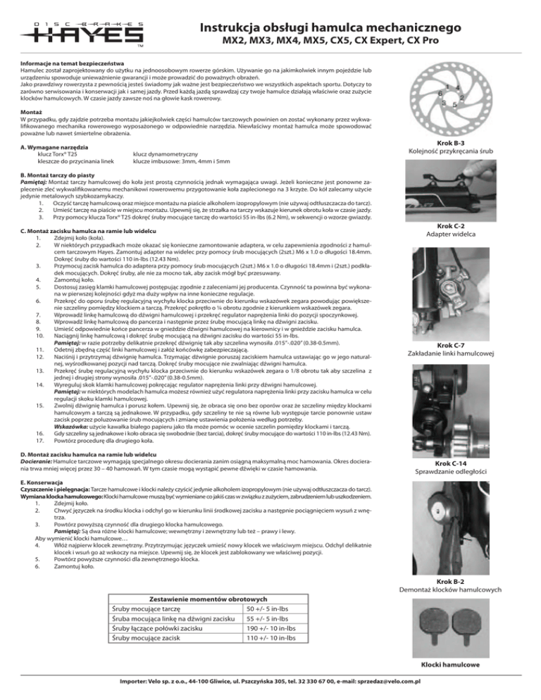 Instrukcja obsługi hamulca mechanicznego MX2, MX3, MX4, MX5, CX5, CX Expert, CX Pro Informacje na temat bezpieczeństwa Hamulec został zaprojektowany do użytku na jednoosobowym rowerze górskim. Używanie go na jakimkolwiek innym pojeździe lub urządzeniu spowoduje unieważnienie gwarancji i może prowadzić do poważnych obrażeń. Jako prawdziwy rowerzysta z pewnością jesteś świadomy jak ważne jest bezpieczeństwo we wszystkich aspektach sportu. Dotyczy to zarówno serwisowania i konserwacji jak i samej jazdy. Przed każdą jazdą sprawdzaj czy twoje hamulce działają właściwie oraz zużycie klocków hamulcowych. W czasie jazdy zawsze noś na głowie kask rowerowy. Montaż W przypadku, gdy zajdzie potrzeba montażu jakiejkolwiek części hamulców tarczowych powinien on zostać wykonany przez wykwalifikowanego mechanika rowerowego wyposażonego w odpowiednie narzędzia. Niewłaściwy montaż hamulca może spowodować poważne lub nawet śmiertelne obrażenia. A. Wymagane narzędzia klucz Torx® T25 kleszcze do przycinania linek klucz dynamometryczny klucze imbusowe: 3mm, 4mm i 5mm Krok B-3 Kolejność przykręcania śrub B. Montaż tarczy do piasty Pamiętaj: Montaż tarczy hamulcowej do koła jest prostą czynnością jednak wymagająca uwagi. Jeżeli konieczne jest ponowne zaplecenie zleć wykwalifikowanemu mechanikowi rowerowemu przygotowanie koła zaplecionego na 3 krzyże. Do kół zalecamy użycie jedynie metalowych szybkozamykaczy. 1. Oczyść tarczę hamulcową oraz miejsce montażu na piaście alkoholem izopropylowym (nie używaj odtłuszczacza do tarcz). 2. Umieść tarczę na piaście w miejscu montażu. Upewnij się, że strzałka na tarczy wskazuje kierunek obrotu koła w czasie jazdy. 3. Przy pomocy klucza Torx® T25 dokręć śruby mocujące tarczę do wartości 55 in-lbs (6.2 Nm), w sekwencji o wzorze gwiazdy. C. Montaż zacisku hamulca na ramie lub widelcu 1. Zdejmij koło (koła). 2. W niektórych przypadkach może okazać się konieczne zamontowanie adaptera, w celu zapewnienia zgodności z hamulcem tarczowym Hayes. Zamontuj adapter na widelec przy pomocy śrub mocujących (2szt.) M6 x 1.0 o długości 18.4mm. Dokręć śruby do wartości 110 in-lbs (12.43 Nm). 3. Przymocuj zacisk hamulca do adaptera przy pomocy śrub mocujących (2szt.) M6 x 1.0 o długości 18.4mm i (2szt.) podkładek mocujących. Dokręć śruby, ale nie za mocno tak, aby zacisk mógł być przesuwany. 4. Zamontuj koło. 5. Dostosuj zasięg klamki hamulcowej postępując zgodnie z zaleceniami jej producenta. Czynność ta powinna być wykonana w pierwszej kolejności gdyż ma duży wpływ na inne konieczne regulacje. 6. Przekręć do oporu śrubę regulacyjną wychyłu klocka przeciwnie do kierunku wskazówek zegara powodując powiększenie szczeliny pomiędzy klockiem a tarczą. Przekręć pokrętło o ¼ obrotu zgodnie z kierunkiem wskazówek zegara. 7. Wprowadź linkę hamulcową do dźwigni hamulcowej i przekręć regulator naprężenia linki do pozycji spoczynkowej. 8. Wprowadź linkę hamulcową do pancerza i następnie przez śrubę mocującą linkę na dźwigni zacisku. 9. Umieść odpowiednie końce pancerza w gnieździe dźwigni hamulcowej na kierownicy i w gnieździe zacisku hamulca. 10. Naciągnij linkę hamulcową i dokręć śrubę mocującą na dźwigni zacisku do wartości 55 in-lbs. Pamiętaj: w razie potrzeby delikatnie przekręć dźwignię tak aby szczelina wynosiła .015”-.020” (0.38-0.5mm). 11. Odetnij zbędną część linki hamulcowej i załóż końcówkę zabezpieczającą. 12. Naciśnij i przytrzymaj dźwignię hamulca. Trzymając dźwignie poruszaj zaciskiem hamulca ustawiając go w jego naturalnej, wyśrodkowanej pozycji nad tarczą. Dokręć śruby mocujące nie zwalniając dźwigni hamulca. 13. Przekręć śrubę regulacyjną wychyłu klocka przeciwnie do kierunku wskazówek zegara o 1/8 obrotu tak aby szczelina z jednej i drugiej strony wynosiła .015”-.020” (0.38-0.5mm). 14. Wyreguluj skok klamki hamulcowej pokręcając regulator naprężenia linki przy dźwigni hamulcowej. Pamiętaj: w niektórych modelach hamulca możesz również użyć regulatora naprężenia linki przy zacisku hamulca w celu regulacji skoku klamki hamulcowej. 15. Zwolnij dźwignię hamulca i porusz kołem. Upewnij się, że obraca się ono bez oporów oraz że szczeliny między klockami hamulcowym a tarczą są jednakowe. W przypadku, gdy szczeliny te nie są równe lub występuje tarcie ponownie ustaw zacisk poprzez poluzowanie śrub mocujących i zmianę ustawienia położenia według potrzeby. Wskazówka: użycie kawałka białego papieru jako tła może pomóc w ocenie szczelin pomiędzy klockami i tarczą. 16. Gdy szczeliny są jednakowe i koło obraca się swobodnie (bez tarcia), dokręć śruby mocujące do wartości 110 in-lbs (12.43 Nm). 17. Powtórz procedurę dla drugiego koła. D. Montaż zacisku hamulca na ramie lub widelcu Docieranie: Hamulce tarczowe wymagają specjalnego okresu docierania zanim osiągną maksymalną moc hamowania. Okres docierania trwa mniej więcej przez 30 – 40 hamowań. W tym czasie mogą wystąpić pewne dźwięki w czasie hamowania. Krok C-2 Adapter widelca Krok C-7 Zakładanie linki hamulcowej Krok C-14 Sprawdzanie odległości E. Konserwacja Czyszczenie i pielęgnacja: Tarcze hamulcowe i klocki należy czyścić jedynie alkoholem izopropylowym (nie używaj odtłuszczacza do tarcz). Wymiana klocka hamulcowego: Klocki hamulcowe muszą być wymieniane co jakiś czas w związku z zużyciem, zabrudzeniem lub uszkodzeniem. 1. Zdejmij koło. 2. Chwyć języczek na środku klocka i odchyl go w kierunku linii środkowej zacisku a następnie pociągnięciem wysuń z wnętrza. 3. Powtórz powyższą czynność dla drugiego klocka hamulcowego. Pamiętaj: Są dwa różne klocki hamulcowe; wewnętrzny i zewnętrzny lub też – prawy i lewy. Aby wymienić klocki hamulcowe… 4. Włóż najpierw klocek zewnętrzny. Przytrzymując języczek umieś