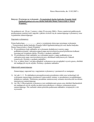 Rawa Mazowiecka, dn. 15.02.2007 r. Dotyczy: Przetargu na wykonanie ,,Termoizolacji dachu budynku Zespołu Szkół Ogólnokształcących oraz dachu budynku Domu Nauczyciela w Starej Wojskiej’’ Na podstawie art. 38 ust. 2 ustawy z dnia 29 stycznia 2004 r. Prawo zamówień publicznych przekazujemy poniżej treść zapytań z jakimi zwrócili się do zamawiającego wykonawcy oraz wyjaśnienia zamawiającego: Zapytanie wykonawcy Firma budowlana ........................ prosi o wyjaśnienie dotyczące przetargu wykonanie ,, Termoizolacji dachu budynku Zespołu Szkół Ogólnokształcących oraz dachu budynku Domu Nauczyciela w Starej Wojskiej’’. 1) W przedmiarze brak nakładów na wykonanie dodatkowej warstwy papy podkładowej/paski/ zabezpieczającej papą nawierzchniową przed przebiciem kołkami mocującymi ocieplenie dachu. Prosimy o podanie nakładów 2) W przedmiarze brak nakładów na wykonanie pasów z papy podkładowej na zabezpieczenie papy nawierzchniowej przy obróbkach nadrynnowych i hakach rynnowych. Prosimy o podanie nakładów. 3) Czy, w jakiej ilości i na jaką odległość wykonawca ma uwzględnić wywóz gruzu, obróbek nie nadających się do użytku. Prosimy o podanie nakładów Odpowiedź zamawiającego Zamawiający zapoznał się z zapytaniem wykonawcy i postanowił co następuje: 1) Ad. pkt 1 i 2. Po dokładnym przeanalizowaniu przedmiaru robót oraz technologii ich wykonania zamawiający postanowił wprowadzić zmiany w przedmiarze uwzględniające dodatkowe nakłady. Zmieniony przedmiar zamieszczony zostanie niezwłocznie na stronie internetowej zamawiającego 2) Ad. Pkt 3 Obowiązkiem wykonawcy jest zeskładowanie gruzu oraz obróbek blacharskich nie nadających się do użytku na placu przyszkolnym w miejscu wskazanym przez zamawiającego. Nie zachodzi zatem potrzeba podawania nakładów związanych z ich wywozem. Zapytanie wykonawcy Prosze o podanie w załączniku przedmiar robot podstawy wyceny.To co Urząd przyjał w tej rubryce jest pogwałceniem przepisów PZP,prawa budowlanego.W obydwu ustawach wyraznie jest napisane w jaki sposob przygotowuje sie przedmiot zamowienia.Wartosc zamowienia roboty budowlane ustala sie na podstawie kosztorysu inwestorskiego opracowanego nie wczesniej jak na 3 miesiace przed rozpoczeciem realizacji inwestycji na podstawie programu funkcjonalno-uzytkowego,anie na podstawie widzi mi sie urzednika.Nie wspomnę juz o innych brakach jakie ma przygotowany przez Was przetarg.Na grę w ciemno może pozwolić sobie prywatny inwestor,ktory nie ma obowiazku ogłaszania przetargu a jeżeli już ogłasza ma prawo do swobodnego wyboru oferenta.Urza jest instytucja publiczna i z mocy prawa jest zobowiazany czy chce czy nie do przestrzegania przepisow. Prosze zatem o usunięcie bubla i poprawne przygotowanie przedmiaru. Odpowiedź zamawiającego 1) Przedmiar robót powinien zawierać zestawienie przewidywanych do wykonania robót podstawowych w kolejności technologicznej ich wykonania wraz z ich szczegółowym opisem lub wskazaniem podstaw ustalających szczegółowy opis np. katalogi nakładów rzeczowych (KNR). Zamawiający zatem nie ma obowiązku powoływać się w przedmiarze na KNR-y, a zwłaszcza nie ma obowiązku ich stosowania jako podstawy wyceny. Opisy robót zawarte w przedmiarze wydają nam się wystarczająco obszerne i czytelne, zwłaszcza w powiązaniu z lekturą specyfikacji technicznej, 2) wartość zamówienia na roboty budowlane ustala się na podstawie kosztorysu inwestorskiego nie wcześniej niż na 6 miesięcy przed dniem wszczęcia postępowania (art. 35 ust. 1 Pzp), a nie na 3 miesiące jak Pani podaje, 3) przedmiot zamówienia opisuje się w przypadku robót budowlanych za pomocą dokumentacji projektowej oraz specyfikacji technicznej(art. 31 ust.1 Pzp), a nie za pomocą programu funkcjonalno-użytkowego, gdyż nie jest przedmiotem zamówienia zaprojektowanie i wykonanie robót budowlanych, 4) Pozostałe zarzuty odczytaliśmy i odpowiadamy jednym zdaniem: uprzejmie prosimy o uważniejsze wczytanie się w Prawo zamówień publicznych i ustosunkowywanie się do specyfikacji w sposób merytoryczny i kompetentny. Zapytanie wykonawcy Zapytanie Sznowny Panie , czy istnieje możliwość zmiany cen w przypadku gdy zostanie wygrana oferta przy cenach materiałów obowiązujących na dzień podpisania umowy, a ceny materiałów wzrosną popczas realizacji zadania. proszę o odpowiedż. Odpowiedź zamawiającego Zgodnie z § 3 pkt 4 projektu umowy, który jest załącznikiem nr 4 do specyfikacji istotnych warunków zamówienia na wykonanie ,, Termoizolacji dachu budynku Zespołu Szkół Ogólnokształcących oraz dachu budynku Domu Nauczyciela w Starej Wojskiej’’ nie przewiduje się waloryzacji wartości robót oraz waloryzacji cen jednostkowych. Nie ma więc możliwości zmiany ceny za wykonane roboty z tytułu wzrostu cen materiałów w trakcie realizacji zadania.