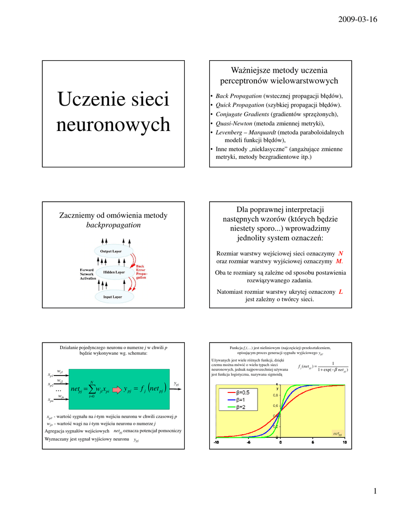 2009-03-16 Ważniejsze metody uczenia perceptronów wielowarstwowych Uczenie sieci neuronowych • • • • • Back Propagation (wstecznej propagacji błędów), Quick Propagation (szybkiej propagacji błędów). Conjugate Gradients (gradientów sprzężonych), Quasi-Newton (metoda zmiennej metryki), Levenberg – Marquardt (metoda paraboloidalnych modeli funkcji błędów), • Inne metody „nieklasyczne” (angażujące zmienne metryki, metody bezgradientowe itp.) Dla poprawnej interpretacji następnych wzorów (których będzie niestety sporo...) wprowadzimy jednolity system oznaczeń: Zaczniemy od omówienia metody backpropagation Rozmiar warstwy wejściowej sieci oznaczymy N oraz rozmiar warstwy wyjściowej oznaczymy M. Oba te rozmiary są zależne od sposobu postawienia rozwiązywanego zadania. Natomiast rozmiar warstwy ukrytej oznaczony L jest zależny o twórcy sieci. Działanie pojedynczego neuronu o numerze j w chwili p będzie wykonywane wg. schematu: xp1 xp2 xpn Funkcja fi (…) jest nieliniowym (najczęściej) przekształceniem, opisującym proces generacji sygnału wyjściowego ypj. Używanych jest wiele różnych funkcji, dzięki czemu można mówić o wielu typach sieci neuronowych, jednak najpowszechniej używana jest funkcja logistyczna, nazywana sigmoidą wj1 wj2 ... wjn N netpj = ∑wji xpi ( y pj = f j net pj ) f j ( net pj ) = 1 1 + exp( − β net pj ) ypj i=0 xpi, - wartość sygnału na i-tym wejściu neuronu w chwili czasowej p wji, - wartość wagi na i-tym wejściu neuronu o numerze j Agregacja sygnałów wejściowych netpj oznacza potencjał pomocniczy Wyznaczany jest sygnał wyjściowy neuronu ypj 1 2009-03-16 Struktura sieci neuronowej x1 x1 x2 x2 x3 ... x ... xi i xN h 1 y wo 1j y2h w1hi w ... y ... y h ji net h j h xN wLi o 1 h j h L o kj w o wMj y y2o ... net ... o k y o k yMo Przykład uczenia sieci zadania rozpoznawania twarzy Ewa W trakcie działania sieci neuronowej wyróżnić można następujące etapy: •wprowadzenie na wejście sieci p - tego wektora wejściowego (xp), Opis działania rozważanych algorytmów uczenia sieci przedstawiony zostanie w oparciu o ciąg uczący o postaci: <x1, d1>, <x2, d2>, ..., <xp, dp>, ..., <xU, dU> gdzie wartości wejściowe xp ∈ RN, zaś oczekiwane (zakładane) wartości wyjściowe dp ∈ RM określone są dla każdego p = 1, ..., U. Liczebność zbioru uczącego U zależy od tego, ile wiedzy posiadamy a’priori o prawidłowym (wzorcowym) rozwiązaniu tego zadania. Oznaczenie p używane będzie stale jako numer aktualnie rozważanego kroku procesu uczenia. Oczywiście p = 1, ..., U •obliczenie wartości wyjściowej ypjh dla każdego neuronu warstwy ukrytej: ( y hpj = f jh net hpj •obliczenie dla każdego neuronu warstwy wyjściowej wartości netpko: L o o h pk kj pj j =0 net •obliczenie dla każdego neuronu warstwy ukrytej wartości netpjh zgodnie ze wzorem: N net hpj = ∑ w hji x pi ) = ∑w y •obliczenie wartości wyjściowej ypko dla każdego neuronu warstwy wyjściowej: ( y opk = f ko net opk ) i =0 2 2009-03-16 Po wykonaniu wszystkich czynności wchodzących w skład wszystkich tych etapów sieć ustala swój sygnał wyjściowy ypko. W prawidłowo działającej sieci wektor wartości wyjściowych yp powinien być identyczny lub bardzo zbliżony do wektora wartości oczekiwanych dp. Sygnał ten może być prawidłowy lub nie, ale w tym właśnie celu mamy proces uczenia, żeby rzeczywiste działanie sieci dopasować do działania pożądanego pożądanego. Aby do tego doprowadzić stosuje się opisane dalej algorytmy uczenia. Klasyczna metoda wstecznej propagacji błędów Algorytm wstecznej propagacji błędów polega na szukaniu kierunku spadku E i na takim zmienianiu wartości wag w1, w2, żeby zmniejszać wartość funkcji błędu w kierunku jej najszybszego spadku Celem procesu uczenia jest taki dobór wag, który zapewni minimalizację wartości błędu E będącego sumą błędów Ep obliczonych dla każdego elementu ciągu uczącego. Kierunek najszybszego spadku błędu Odpowiadająca mu wartość błędu E Przemieszczenie po powierzchni błędu Błąd Ep dla p-tego elementu ciągu uczącego wyraża formuła: Ep = 1 M d pk − y opk ∑ 2 k =1 ( ) 2 Stary (gorszy) wektor wag Po prezentacji p-tego elementu ciągu uczącego modyfikacja wektora wag odbywa się w tej metodzie zgodnie ze wzorem: ( w ( p +1) = w ( p ) − η ∇E p w ( p ) ) gdzie: Migracja w przestrzeni wag Modyfikacja wag przebiega zgodnie z wzorami: wkjo ( p + 1) = wkjo ( p) − η ∂E p ∂wkjo w hji ( p + 1) = w hji ( p ) − η ∂E p ∂whji w(p) - wektor wszystkich wag sieci w p - tym kroku działania algorytmu, ∇ Ep(w(p)) - gradient funkcji Ep w punkcie w(p), η - współczynnik uczenia będący stałą z przedziału (0, 1). Nowy (lepszy) wektor wag W trakcie działania algorytmu modyfikowane być muszą zarówno neuronów warstwy wyjściowej jak i wagi neuronów warstwy ukrytej, co stanowi główne źródło trudności. 3 2009-03-16 ∂E p ∂wkjo W celu obliczenia wartości W ostatnim wzorze pojawia się pochodna nieliniowej funkcji przejścia neuronu względem jej argumentu: o ∂ f (net pk ) ∂E p najpierw oblicza się pochodną ∂y opk ∂E p ∂ = o o ∂y pk ∂y pk 1 M ∑ d pk − y opk 2 k =1 ( 2 ) = −(d pk − y opk W praktyce wyznaczenie wartości ∂ net opk tej pochodnej nie jest jednak trudne, ponieważ funkcje przejścia dobiera się w taki sposób, aby miały wygodne (z punktu widzenia tych rozważań) formuły wyrażające ich pochodne. ) Dla uproszczenia notacji na chwilę zastąpmy wyrażenie jakimś pojedynczym symbolem, na przykład s . następnie o pk o pk ∂E p ∂E ∂y = op o ∂net pk ∂y pk ∂net ( = − d pk − y opk (net ) ) ∂ ∂fnet o pk o pk Dla często stosowanej w sieciach neuronowych funkcji przejścia w kształcie sigmoidy mamy następującą formułę: y:=1/(1+exp(-0.5*x)) 1.1 1 y = f (s) = 1 + e−s 0.9 0.7 0.3 0.1 -5 0 5 10 Znajdując pochodną tej funkcji mamy: 