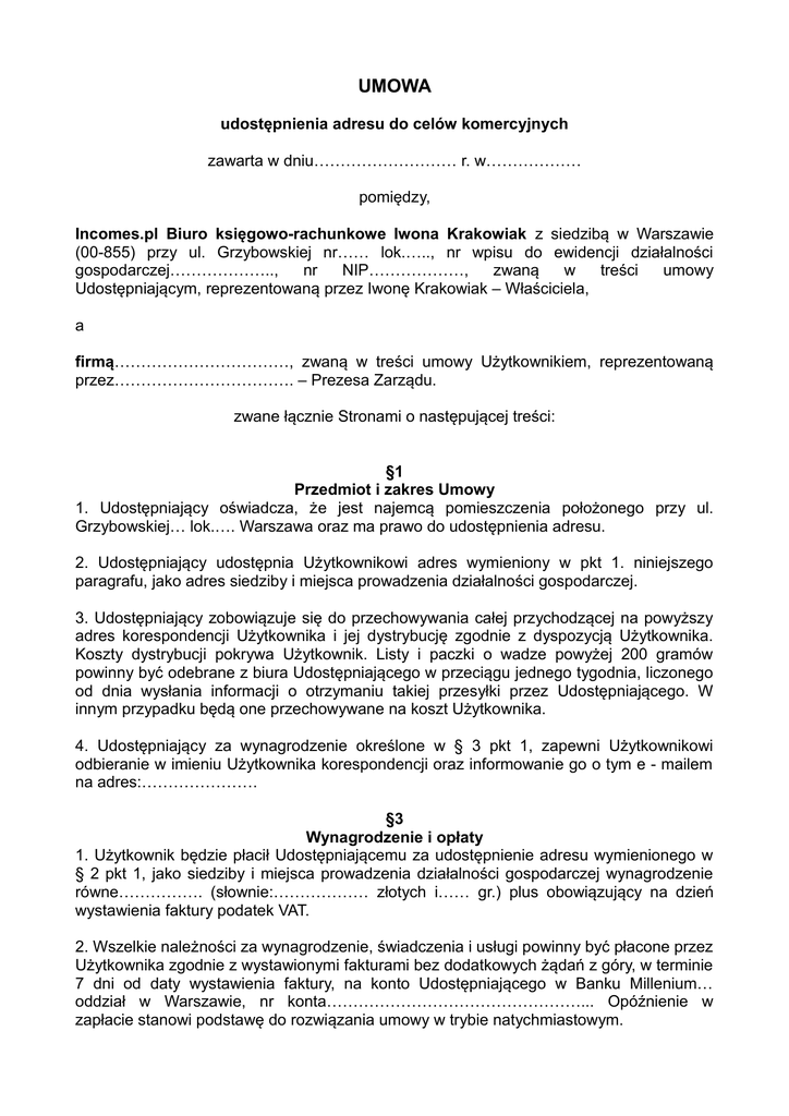 UMOWA udostępnienia adresu do celów komercyjnych zawarta w dniu……………………… r. w……………… pomiędzy, Incomes.pl Biuro księgowo-rachunkowe Iwona Krakowiak z siedzibą w Warszawie (00-855) przy ul. Grzybowskiej nr…… lok.….., nr wpisu do ewidencji działalności gospodarczej……………….., nr NIP………………, zwaną w treści umowy Udostępniającym, reprezentowaną przez Iwonę Krakowiak – Właściciela, a firmą……………………………, zwaną w treści umowy Użytkownikiem, reprezentowaną przez……………………………. – Prezesa Zarządu. zwane łącznie Stronami o następującej treści: §1 Przedmiot i zakres Umowy 1. Udostępniający oświadcza, że jest najemcą pomieszczenia położonego przy ul. Grzybowskiej… lok.…. Warszawa oraz ma prawo do udostępnienia adresu. 2. Udostępniający udostępnia Użytkownikowi adres wymieniony w pkt 1. niniejszego paragrafu, jako adres siedziby i miejsca prowadzenia działalności gospodarczej. 3. Udostępniający zobowiązuje się do przechowywania całej przychodzącej na powyższy adres korespondencji Użytkownika i jej dystrybucję zgodnie z dyspozycją Użytkownika. Koszty dystrybucji pokrywa Użytkownik. Listy i paczki o wadze powyżej 200 gramów powinny być odebrane z biura Udostępniającego w przeciągu jednego tygodnia, liczonego od dnia wysłania informacji o otrzymaniu takiej przesyłki przez Udostępniającego. W innym przypadku będą one przechowywane na koszt Użytkownika. 4. Udostępniający za wynagrodzenie określone w § 3 pkt 1, zapewni Użytkownikowi odbieranie w imieniu Użytkownika korespondencji oraz informowanie go o tym e - mailem na adres:…………………. §3 Wynagrodzenie i opłaty 1. Użytkownik będzie płacił Udostępniającemu za udostępnienie adresu wymienionego w § 2 pkt 1, jako siedziby i miejsca prowadzenia działalności gospodarczej wynagrodzenie równe……………. (słownie:……………… złotych i…… gr.) plus obowiązujący na dzień wystawienia faktury podatek VAT. 2. Wszelkie należności za wynagrodzenie, świadczenia i usługi powinny być płacone przez Użytkownika zgodnie z wystawionymi fakturami bez dodatkowych żądań z góry, w terminie 7 dni od daty wystawienia faktury, na konto Udostępniającego w Banku Millenium… oddział w Warszawie, nr konta…………………………………………... Opóźnienie w zapłacie stanowi podstawę do rozwiązania umowy w trybie natychmiastowym. 3. Wysokość opłat z tytułu świadczeń lub usług świadczonych przez Udostępniającego na rzecz Użytkownika określona jest w obowiązujących cennikach Udostępniającego publikowanych na jego stronie internetowej pod adresem www.incomes.pl. Zmiana wysokości opłat za świadczenia i usługi, następować będzie w drodze aneksu podpisanego przez obydwie strony umowy. 5. Użytkownik upoważnia Udostępniającego do wystawiania faktur VAT zgodnie z przepisami prawa bez podpisu Użytkownika. §4 Postanowienia szczegółowe 1. Umowa zostaje zawarta na czas nieokreślony i obowiązuje od dnia……………………r. 2. Rozwiązanie niniejszej umowy może nastąpić w formie pisemnej, przez każdą ze stron z zachowaniem… - miesięcznego okresu wypowiedzenia. Okres wypowiedzenia rozpoczyna się pierwszego dnia miesiąca następującego po miesiącu, w którym skutecznie złożono wypowiedzenie. Wypowiedzenie może być złożone w formie listu poleconego lub pisma dostarczonego do siedziby firmy. 3. Użytkownik po rozwiązaniu niniejszej umowy zobowiązuje się do zmiany miejsca prowadzenia działalności poprzez złożenie stosownych formularzy urzędowych w terminie do 14 dni od daty rozwiązania umowy. W przeciwnym przypadku Udostępniający powiadomi właściwe urzędy o rozwiązaniu umowy z Użytkownikiem. §5 Postanowienia końcowe 1. W sprawach nieuregulowanych niniejszą umową mają zastosowanie obowiązujące przepisy prawa. 2. Strony zobowiązują się do zachowania poufności informacji w zakresie przedmiotu umowy i dokumentów związanych z jej realizacją. 3. Wszelkie zmiany postanowień niniejszej umowy będą dokonywane w postaci pisemnych aneksów podpisanych przez obie Strony. 4. Umowa została sporządzona w trzech jednobrzmiących egzemplarzach, po jednym dla każdej ze stron i Urzędu Skarbowego. …………………………… Udostępniający …………………………… Użytkownik