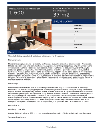 MIESZKANIE na WYNAJEM 1 600 Kraków, Kraków-Krowodrza, Piotra Stachiewicza 37 m2 1380/3814/OMW Secondary LowBlock 1970 1 4 2 Adjoining 3.5 Opis Victoria Estate prezentuje 2-pokojowe mieszkanie na Krowodrzy! Nieruchomość: Mieszkanie znajduje się na I piętrze IV piętrowego budynku przy ulicy Stachiewicza - Krowodrza. Składa się z salonu z aneksem kuchennym, sypialni, łazienki i przedpokoju. W pełni umeblowane i wyposażone: kuchnia - lodówka, zamrażarka, meble kuchenne w zabudowie, piekarnik, płyta grzewcza gazowa, zmywarka, mikrofalówka, pralka; sypialnia - podwójne łóżko, szafa, szafka kuchenna, wisząca półka, salon - sofa, stolik kawowy, regały, szafki, półki, szafka RTV, telewizor; łazienka - prysznic, WC, umywalka, lustro, szafki łazienkowe, grzejnik drabinkowy, przedpokój szafa wnękowa z lustrami. Okna PCV wychodzące w kierunku południowo-wschodnim. Ogrzewanie miejskie. Mieszkanie jest ciepłe i przestronne. Idealne dla pracującej pary, poszukującej lokum w bliskości centrum Krakowa. Lokalizacja: Mieszkanie zlokalizowane jest w zachodniej części miasta przy ul. Stachiewicza, w dzielnicy Krowodrza. W pobliżu znajdują się liczne punkty usługowo-handlowe, takie jak sklepy spożywcze, szpital, apteka, klub sportowy, fitness, basen, szkoła. Położenie w sąsiedztwie stacji PKP "Łobzów" umożliwia szybki dojazd pociągiem do stacji Kraków Business Park w Zabierzowie. W odległości 5 km znajduje się park "Młynówka Królewska", wraz z placem zabaw i stacjami treningowymi. Lokalizacja mieszkania zapewnia także dogodny dojazd samochodem do biurowców Edison, Galileo i Newton oraz do autostrady A4. Do najbliższej galerii handlowej - Galeria Krakowska ok 3 km. Odległość do Rynku Głównego 3 km. Do najbliższego przystanku MPK "Stachiewicza" - 2 min. Komunikacja: Autobusy: 144, 194 Opłaty: 1600 zł najem + 280 zł czynsz administracyjny + ok. 170 zł media (prąd, gaz, internet) Serdecznie polecam! Victoria Estate Paulina Zajdel tel. +48 789 453 049 email: [email protected] Victoria Estate Powered by TCPDF (www.tcpdf.org)