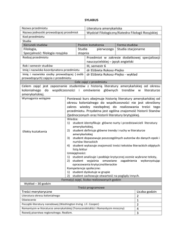 SYLABUS Literatura amerykańska Wydział Filologiczny/Katedra
