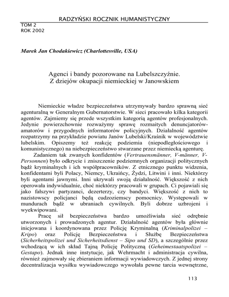 TOM 2 ROK 2002 RADZYŃSKI ROCZNIK HUMANISTYCZNY Marek Jan Chodakiewicz (Charlottesville, USA) Agenci i bandy pozorowane na Lubelszczyźnie. Z dziejów okupacji niemieckiej w Janowskiem Niemieckie władze bezpieczeństwa utrzymywały bardzo sprawną sieć agenturalną w Generalnym Gubernatorstwie. W sieci pracowało kilka kategorii agentów. Zajmiemy się przede wszystkim kategorią agentów profesjonalnych. Jedynie powierzchownie rozważymy sprawę rozmaitych denuncjatorówamatorów i przygodnych informatorów policyjnych. Działalność agentów rozpatrzymy na przykładzie powiatu Janów Lubelski/Kraśnik w województwie lubelskim. Opiszemy też reakcję podziemia (niepodległościowego i komunistycznego) na niebezpieczeństwo stwarzane przez niemiecką agenturę. Zadaniem tak zwanych konfidentów (Vertrauensmänner, V-männer, VPersonnen) było odkrycie i zniszczenie podziemnych organizacji politycznych bądź kryminalnych i ich współpracowników. Z etnicznego punktu widzenia, konfidentami byli Polacy, Niemcy, Ukraińcy, Żydzi, Litwini i inni. Niektórzy byli agentami jawnymi. Inni ukrywali swoją działalność. Większość z nich operowała indywidualnie, choć niektórzy pracowali w grupach. Ci pojawiali się jako fałszywi partyzanci, dezerterzy, czy bandyci. Większość z nich to nazistowscy policjanci będą cudzoziemscy pomocnicy. Występowali w mundurach bądź w ubraniach cywilnych. Byli dobrze uzbrojeni i wyekwipowani. Pracę sił bezpieczeństwa bardzo umożliwiała sieć odrębnie utworzonych i prowadzonych agentur. Działalność agentów była głównie inicjowana i koordynowana przez Policję Kryminalną (Kriminalpolizei – Kripo) oraz Policję Bezpieczeństwa i Służbę Bezpieczeństwa (Sicherheitspolizei und Sicherheitsdienst – Sipo und SD), a szczególnie przez wchodzącą w ich skład Tajną Policję Polityczną (Geheimestaatspolizei – Gestapo). Jednak inne instytucje, jak Wehrmacht i administracja cywilna, również zajmowały się zbieraniem informacji wywiadowczych. Z jednej strony decentralizacja wysiłku wywiadowczego wywołała pewne tarcia wewnętrzne, 113 Marek Jan Chodakiewicz bowiem przynajmniej niektórzy agenci wchodzili sobie w drogę. Z drugiej strony, działalność różnych agentów dopełniała się, bo większość z nich koncentrowała się na rozpracowywaniu tych samych środowisk: podziemia politycznego i kryminalnego. Szczególnie dotyczyło to działalności agentów Gestapo i Kripo. Paradoksalnie, wiele cywilnych instytucji niemieckich, które wystawiły własne agentury, było penetrowanych przez szpiegów niemieckiej policji bezpieczeństwa. Ponadto Sipo umieszczało swych szpiegów w szeregach żandarmerii niemieckiej, Polskiej Policji i Żydowskiej Służby Porządkowej. Każda z tych formacji miała własnych agentów inwigilujących społeczność lokalną1. W tym ciemnym półświatku tajnych służb działali też podwójni, a nawet potrójni agenci. Swą energię koncentrowali oni na rzecz rozmaitych niemieckich instytucji i jednocześnie w służbie polskiego podziemia. I odwrotnie. Z powodu śmiertelnego zagrożenia jakie stanowili, polityczne i kryminalne podziemie ścigało i zabijało prawdziwych i wyimaginowanych agentów niemieckich. Brak solidnej bazy pozwala jedynie potwierdzić istnienie sieci agentów nazistowskich w powiecie Janów. Ale nie możemy ani nakreślić zasięgu ich działania ani oszacować ich skuteczności. Wydaje się jednak, że policja niemiecka nie wysilała się na utrzymywanie sieci profesjonalnych agentów na prowincji. Wydaje się również, że ponieważ żadna z głównych grup politycznych czy kryminalnych w powiecie nie uniknęła wpadek, agenci pracowali jednak skutecznie. Raport Armii Krajowej (AK) z lipca 1943 roku, oparty najpewniej na informacjach wywiadu uzyskanych od polskich policjantów (granatowych), wymienia tylko 9 anonimowych V-männer w całym powiecie. Trzech z nich mieszkało w Janowie, dwóch w Urzędowie, i po jednym w Annopolu, Batorzu, Modliborzycach i Zaklikowie2. Raport podziemia z kwietnia 1944 roku 1 Na przykład, o agentach Gestapo w polskim Kripo zob.: A. Hempel, Pogrobowcy klęski: Rzecz o policji „granatowej” w Generalnym Gubernatorstwie 1939-1945, Państwowe Wydawnictwo Naukowe, Warszawa 1990, s. 130. 2 Nie wiadomo na pewno czy ludzie ci byli agentami policji polskiej czy nazistowskiej służby bezpieczeństwa. Wydaje się, jednak, ze chodziło o pracowników SD i Sipo czy żandarmerii. Z jednej strony, ponieważ kierownictwo polskiej policji pracowało dla podziemia niepodległościowego, dostarczyłoby ono do AK nazwiska swych agentów. Z drugiej strony, ponieważ nazwiska agentów pozostawały nieznane, jest bardzo prawdopodobne, ze informacje wywiadowcze wydobyto ze źródeł niemieckich i dotyczyło agentów policji niemieckiej. Miejscowa komórka kontrwywiadu AK dostała rozkaz: „Konfidentów tych należy rozpoznać, a nazwiska ich meldować”, Zob.: Łodzia, Bank Handlowy, Buchalteria, L. 371, Do 90, 27 lipca 114 Agenci i bandy pozorowane na Lubelszczyźnie. Z dziejów okupacji niemieckiej w Janowskiem. wymienia tylko jednego rozpoznanego rzekomego agenta Gestapo w powiecie janowskim. Był nim Tomasz Poleszczuk z Trzeszkowic3. Bezsprzecznie było ich więcej. Jeszcze w lutym 1944 roku, szef Gestapo w Kraśniku przyznał, że „różni konfidenci” (verschiedene V-Personen), prawdopodobnie Polacy i Żydzi, pracowali dla niego w obozie pracy w Budzyniu pod Kraśnikiem i w innych miejscach4. Według dokumentów żandarmerii niemieckiej, między lipcem 1943 a styczniem 1944, agent Wiedfold Dietrich operował w Zaklikowie. Dietrich był członkiem komórki tajnej policji zwanej „Volksgruppe Senon”. W maju 1944 roku, przynajmniej jeden żandarmski Vmann działał w gminie Zaklików, a inny w gminie Zakrzówek. W lipcu 1944 roku, pewna ilość agentów pojawiła się w okolicy Lasów Janowskich, na przykład w Harasiukach5. Zachowały się info