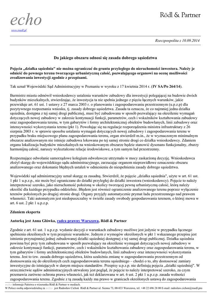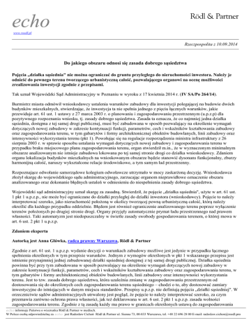 echo www.roedl.pl Rzeczpospolita z 10.09.2014 Do jakiego obszaru odnosi się zasada dobrego sąsiedztwa Pojęcia „działka sąsiednia" nie można ograniczać do gruntu przyległego do nieruchomości inwestora. Należy je odnieść do pewnego terenu tworzącego urbanistyczną całość, pozwalającego organowi na ocenę możliwości zrealizowania inwestycji zgodnie z przepisami. Tak uznał Wojewódzki Sąd Administracyjny w Poznaniu w wyroku z 17 kwietnia 2014 r. (IV SA/Po 264/14). Burmistrz miasta odmówił wnioskodawcy ustalenia warunków zabudowy dla inwestycji polegającej na budowie dwóch budynków mieszkalnych, stwierdzając, że inwestycja ta nie spełnia jednego z pięciu łącznych warunków, jakie przewiduje art. 61 ust. 1 ustawy z 27 marca 2003 r. o planowaniu i zagospodarowaniu przestrzennym (u.p.z.p) dla pozytywnego rozpoznania wniosku, tj. zasady dobrego sąsiedztwa. Zasada ta oznacza, że co najmniej jedna działka sąsiednia, dostępna z tej samej drogi publicznej, musi być zabudowana w sposób pozwalający na określenie wymagań dotyczących nowej zabudowy w zakresie kontynuacji funkcji, parametrów, cech i wskaźników kształtowania zabudowy oraz zagospodarowania terenu, w tym gabarytów i formy architektonicznej obiektów budowlanych, linii zabudowy oraz intensywności wykorzystania terenu (pkt 1). Powołując się na regulacje rozporządzenia ministra infrastruktury z 26 sierpnia 2003 r. w sprawie sposobu ustalania wymagań dotyczących nowej zabudowy i zagospodarowania terenu w przypadku braku miejscowego planu zagospodarowania terenu, organ stwierdził m.in., że w wyznaczonym minimalnym obszarze analizowanym nie istnieje zabudowa lokowana po tej samej stronie drogi co działka wnioskodawcy. Zdaniem organu lokalizacja budynków mieszkalnych na wnioskowanym obszarze będzie stanowić dysonans funkcjonalny, zburzy harmonijną całość, naruszy wykształcone relacje środowiskowe, a tym samym ład przestrzenny. Rozpoznające odwołanie samorządowe kolegium odwoławcze utrzymało w mocy zaskarżoną decyzję. Wnioskodawca złożył skargę do wojewódzkiego sądu administracyjnego, zarzucając organom nieprawidłowe oznaczenie obszaru analizowanego oraz dokonanie błędnych ustaleń w odniesieniu do niespełnienia zasady dobrego sąsiedztwa. Wojewódzki sąd administracyjny uznał skargę za zasadną. Stwierdził, że pojęcie „działka sąsiednia", użyte w art. 61 ust. 1 pkt 1 u.p.z.p., nie może być ograniczane do działki przyległej do działki inwestora (wnioskodawcy). Pojęcie to należy interpretować szeroko, jako nieruchomość położoną w okolicy tworzącej pewną urbanistyczną całość, którą należy określić dla każdego przypadku oddzielnie. Błędem jest również ograniczenie analizowanego terenu poprzez wyłączenie terenów położonych po drugiej stronie drogi. Organy przyjęły automatycznie prymat ładu przestrzennego nad prawem własności. Taki automatyzm jest niedopuszczalny w świetle zasady swobody gospodarowania terenem, o której mowa w art. 6 ust. 2 pkt 1 u.p.z.p. Zdaniem eksperta Autorką jest Anna Główka, radca prawny Warszawa, Rödl & Partner Zgodnie z art. 61 ust. 1 u.p.z.p. wydanie decyzji o warunkach zabudowy możliwe jest jedynie w przypadku łącznego spełnienia określonych w tym przepisie warunków. Jednym z wymogów określonych w pkt 1 wskazanego przepisu jest istnienie przynajmniej jednej zabudowanej działki sąsiedniej dostępnej z tej samej drogi publicznej. Działka sąsiednia powinna być przy tym zabudowana w sposób pozwalający na określenie wymagań dotyczących nowej zabudowy w zakresie kontynuacji funkcji, parametrów, cech i wskaźników kształtowania zabudowy oraz zagospodarowania terenu, w tym gabarytów i formy architektonicznej obiektów budowlanych, linii zabudowy oraz intensywności wykorzystania terenu. Jest to tzw. zasada dobrego sąsiedztwa, która uzależnia zmianę w zagospodarowaniu przestrzennym od dostosowania się do określonych cech zagospodarowania terenu sąsiedniego – chodzi o to, aby dostosować zamiary inwestycyjne do istniejących w danym miejscu standardów. Przepisy u.p.z.p. nie definiują pojęcia „działki sąsiedniej". W orzecznictwie sądów administracyjnych utrwalony jest pogląd, że pojęcie to należy interpretować szeroko, za czym przemawia zarówno ochrona prawa własności, jak też deklarowana w art. 6 ust. 2 pkt 1 u.p.z.p. zasada wolności zagospodarowania terenu. Zgodnie z tą zasadą każdy ma prawo w granicach określonych ustawą do zagospodarowania echo informuje Państwa o wizerunku Rödl & Partner w mediach. W Polsce osobą odpowiedzialną za echo jest Radosław Cichoń Rödl & Partner ul. Sienna 73, 00-833 Warszawa, tel. +48 22 696 28 00 E-mail: [email protected] terenu, do którego ma tytuł prawny, zgodnie z warunkami ustalonymi w miejscowym planie zagospodarowania przestrzennego albo decyzji o warunkach zabudowy i zagospodarowania terenu, jeżeli nie narusza to chronionego prawem interesu publicznego oraz osób trzecich. Dlatego też przez pojęcie „działki sąsiedniej" nie można rozumieć wyłącznie działki graniczącej czy też działek wybiórczo poddanych analizie planistycznej, ale należy odnieść to pojęcie do nieruchomości, terenów położonych w okolicy, stanowiącej pewną urbanistyczną całość, w tym także po drugiej stronie tej samej ulicy (wyroki NSA z 21 listopada 2012 r., II OSK 984/11; z 30 stycznia 2014 r., II OSK 2089/12; z 5 czerwca 2014 r., II OSK 31/13). Wobec tego wystarczające jest, aby na analizowanym obszarze znajdował się przynajmniej jeden obiekt pozwalający na stwierdzenie, iż zamierzenie budowlane przedstawione we wniosku inwestora jest możliwe do zaakceptowania w świetle wymogów ładu przestrzennego, któremu służyć ma zasada dobrego sąsiedztwa. Przepis art. 61 ust. 6 u.p.z.p. zawiera upoważnienie dla ministra właściwego do spraw budownictwa, gospodarki przestrzennej i mieszkaniowej