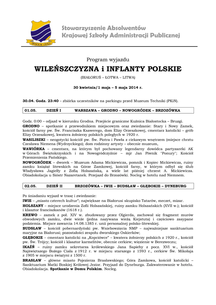 Stowarzyszenie Absolwentów Krajowej Szkoły Administracji Publicznej Program wyjazdu WILEŃSZCZYZNA i INFLANTY POLSKIE (BIAŁORUŚ – ŁOTWA – LITWA) 30 kwietnia/1 maja – 5 maja 2014 r. 30.04. Godz. 23:40 – zbiórka uczestników na parkingu przed Muzeum Techniki (PKiN). 01.05. DZIEŃ I WARSZAWA – GRODNO – NOWOGRÓDEK – BRZOZÓWKA Godz. 0:00 – odjazd w kierunku Grodna. Przejście graniczne Kuźnica Białostocka – Bruzgi. GRODNO – spotkanie z przewodnikiem miejscowym oraz zwiedzanie: Stary i Nowy Zamek, kościół farny pw. Św. Franciszka Ksawerego, dom Elizy Orzeszkowej, cmentarz katolicki – grób Elizy Orzeszkowej, kwatera żołnierzy polskich poległych w 1920 r. WASILISZKI – neogotycki kościół pw. Św. Piotra i Pawła z ciekawym wnętrzem (miejsce chrztu Czesława Niemena (Wydrzyckiego); dom rodzinny artysty – obecnie muzeum, WAWIÓRKA – cmentarz, na którym był pochowany legendarny dowódca partyzantki AK w Górach Świętokrzyskich i na Nowogródczyźnie – mjr Jan Piwnik "Ponury"; Kościół Przemienienia Pańskiego. NOWOGRÓDEK – dworek – Muzeum Adama Mickiewicza, pomnik i Kopiec Mickiewicza, ruiny zamku książąt litewskich na Górze Zamkowej, kościół farny, w którym odbył się ślub Władysława Jagiełły z Zofią Holszańską, a wiele lat później chrzest A. Mickiewicza. Obiadokolacja u Sióstr Nazaretanek. Przejazd do Brzozówki. Nocleg w hotelu nad Niemnem. 02.05. DZIEŃ II BRZOZÓWKA – IWIE – BUDSŁAW – GŁĘBOKIE – DYNEBURG Po śniadaniu wyjazd w trasę i zwiedzanie: IWIE – „miasto czterech kultur”; największe na Białorusi skupisko Tatarów, meczet, mizar. HOLSZANY – miejsce urodzenia Zofii Holszańskiej, ruiny zamku Holszańskich (XVII w.); kościół i klasztor franciszkanów (1618 r.). KREWO – zamek z poł. XIV w. zbudowany przez Olgierda, zachował się fragment murów obwodowych zamku, dwie wieże (jedna nazywana wieżą Kiejstuta) i częściowo zasypane podziemia. Miejsce zawarcia 14.08.1385 r. unii personalnej polsko-litewskiej. BUDSŁAW – kościół pobernardyński pw. Wniebowzięcia NMP – najważniejsze sanktuarium maryjne na Białorusi; pozostałości zespołu dworskiego Oskierków; GŁĘBOKIE – cmentarz katolicki na „Kopciówce” – kwatera żołnierzy polskich z 1920 r., kościół pw. Św. Trójcy; kościół i klasztor karmelitów, obecnie cerkiew; więzienie w Berezweczu; IKAŹŃ – ruiny zamku sekretarza królewskiego Jana Sapiehy z pocz. XVI w., kościół Najświętszego Bożego Ciała z 1912 r. w miejscu starszego z 1593 r., cerkiew Św. Mikołaja z 1905 w miejscu świątyni z 1500 r. BRASŁAW – główne miasto Pojezierza Brasławskiego; Góra Zamkowa, kościół katolicki – Sanktuarium Matki Boskiej Królowej Jezior. Przyjazd do Dyneburga. Zakwaterowanie w hotelu. Obiadokolacja. Spotkanie w Domu Polskim. Nocleg. 03.05. DZIEŃ III DYNEBURG – ZUŁÓW – WILNO Po śniadaniu wyjazd w trasę oraz zwiedzanie: DYNEBURG – (Łotwa, d. Inflanty Polskie): szkoła polska, cmentarz katolicki z Grobem Nieznanego Żołnierza i grobami żołnierzy polskich poległych w 1920 r. w walkach z bolszewikami, spojrzenie na twierdzę oraz pobliskie kościoły. AGŁONA – wieś, bazylika - kościół Wniebowzięcia i Sanktuarium maryjne nazywane „Łotewską Częstochową”, gdzie co roku 15 sierpnia pielgrzymują tysiące wiernych; najważniejsze dla katolików miejsce na Łotwie i najwspanialszy na Łotwie pomnik polskiej kultury. DUKSZTY - kwatera poległych legionistów w Duksztach Starych, którą kilka lat temu wskrzesił z niebytu i nad którą pieczę sprawuje Związek Polaków na Litwie. ZUŁÓW – miejsce urodzenia Józefa Piłsudskiego. POWIEWÓRKA – kościół pw. Św. Kazimierza z 1775 r., miejsce chrztu J. Piłsudskiego. Przyjazd do Wilna. Obiadokolacja. Zakwaterowanie w hotelu. Dla chętnych wieczorny spacer po wileńskiej starówce. 04.05. DZIEŃ IV WILNO WILNO – Po śniadaniu – spotkanie z przewodnikiem miejscowym oraz zwiedzanie Starego Miasta: Ostra Brama, kościół Św. Teresy, cerkiew prawosławna Św. Ducha, Klasztor Bazylianów (obok którego znajduje się mickiewiczowska cela Konrada), Plac Ratuszowy, kościół św. Kazimierza, Uniwersytet Wileński, gotycki kościół św. Anny, pomnik Adama Mickiewicza; czas wolny. Przejazd przez miasto oraz c.d. zwiedzania: założony w 1769 r. cmentarz na Rossie – jedna z czterech polskich nekropolii narodowych; złożenie kwiatów i zapalenie zniczy na grobie Matki J. Piłsudskiego i Jego Serca; Kościół Św. Piotra i Pawła na Antokolu z najbogatszym stiukowym wystrojem wnętrza spośród kościołów Rzeczypospolitej, Plac Łukiski. Obiadokolacja. Nocleg. 05.05. DZIEŃ V WILNO – KOWNO – WARSZAWA Po śniadaniu wyjazd w trasę i zwiedzanie: PONARY – miejsce masowych egzekucji ponad 100 tys. mieszkańców Wilna i Wileńszczyzny w czasie II wojny światowej, w tym 30 tys. Polaków; złożenie kwiatów i zapalenie zniczy. TROKI – zamek gotycki na wyspie, kienesa karaimska, kościół pw. Nawiedzenia NMP, ufundowany w 1409 r. przez księcia Witolda. Wyjazd do Wilna: KOWNO – spacer: Zamek Kowieński, kościół św. Jerzego i klasztor bernardynów, Stare Miasto zespół kamienic wokół rynku, Ratusz – zw. Białym Łabędziem, archikatedra św. Piotra i Pawła, Dom Perkuna, kościół Witolda. POŻAJŚCIE – kościół pw. Nawiedzenia NMP i klasztor kamedułów z 1662 r., pomnik potęgi rodu Paców, największy zespół klasztorny na Litwie, jeden z najcenniejszych zabytków późnego baroku na ziemiach Rzeczypospolitej, wpisany na listę UNESCO, położony na półwyspie Pożajście otoczonym wodami tzw. Morza Kowieńskiego. Wyjazd do Polski przez przejście graniczne Łoździeje – Ogrodniki. GIBY – miejsce upamiętnienia ofiar obławy augustowskiej w lipcu 1945r. Obiadokolacja w Augustowie. Planowany przyjazd do Warszawy ok. godz. 21.30. CENA: członkowie SAKSAP* pozostałe osoby przy wpłacie do 04.04.2