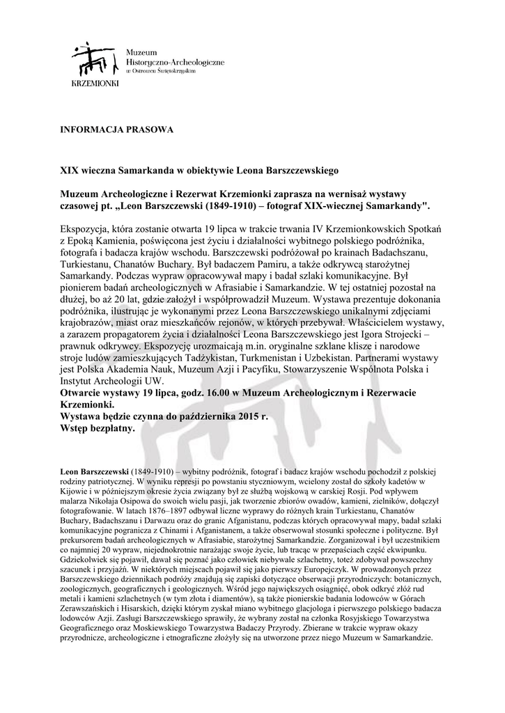 INFORMACJA PRASOWA XIX wieczna Samarkanda w obiektywie Leona Barszczewskiego Muzeum Archeologiczne i Rezerwat Krzemionki zaprasza na wernisaż wystawy czasowej pt. „Leon Barszczewski (1849-1910) – fotograf XIX-wiecznej Samarkandy". Ekspozycja, która zostanie otwarta 19 lipca w trakcie trwania IV Krzemionkowskich Spotkań z Epoką Kamienia, poświęcona jest życiu i działalności wybitnego polskiego podróżnika, fotografa i badacza krajów wschodu. Barszczewski podróżował po krainach Badachszanu, Turkiestanu, Chanatów Buchary. Był badaczem Pamiru, a także odkrywcą starożytnej Samarkandy. Podczas wypraw opracowywał mapy i badał szlaki komunikacyjne. Był pionierem badań archeologicznych w Afrasiabie i Samarkandzie. W tej ostatniej pozostał na dłużej, bo aż 20 lat, gdzie założył i współprowadził Muzeum. Wystawa prezentuje dokonania podróżnika, ilustrując je wykonanymi przez Leona Barszczewskiego unikalnymi zdjęciami krajobrazów, miast oraz mieszkańców rejonów, w których przebywał. Właścicielem wystawy, a zarazem propagatorem życia i działalności Leona Barszczewskiego jest Igora Strojecki – prawnuk odkrywcy. Ekspozycję urozmaicają m.in. oryginalne szklane klisze i narodowe stroje ludów zamieszkujących Tadżykistan, Turkmenistan i Uzbekistan. Partnerami wystawy jest Polska Akademia Nauk, Muzeum Azji i Pacyfiku, Stowarzyszenie Wspólnota Polska i Instytut Archeologii UW. Otwarcie wystawy 19 lipca, godz. 16.00 w Muzeum Archeologicznym i Rezerwacie Krzemionki. Wystawa będzie czynna do października 2015 r. Wstęp bezpłatny. Leon Barszczewski (1849-1910) – wybitny podróżnik, fotograf i badacz krajów wschodu pochodził z polskiej rodziny patriotycznej. W wyniku represji po powstaniu styczniowym, wcielony został do szkoły kadetów w Kijowie i w późniejszym okresie życia związany był ze służbą wojskową w carskiej Rosji. Pod wpływem malarza Nikołaja Osipowa do swoich wielu pasji, jak tworzenie zbiorów owadów, kamieni, zielników, dołączył fotografowanie. W latach 1876–1897 odbywał liczne wyprawy do różnych krain Turkiestanu, Chanatów Buchary, Badachszanu i Darwazu oraz do granic Afganistanu, podczas których opracowywał mapy, badał szlaki komunikacyjne pogranicza z Chinami i Afganistanem, a także obserwował stosunki społeczne i polityczne. Był prekursorem badań archeologicznych w Afrasiabie, starożytnej Samarkandzie. Zorganizował i był uczestnikiem co najmniej 20 wypraw, niejednokrotnie narażając swoje życie, lub tracąc w przepaściach część ekwipunku. Gdziekolwiek się pojawił, dawał się poznać jako człowiek niebywale szlachetny, toteż zdobywał powszechny szacunek i przyjaźń. W niektórych miejscach pojawił się jako pierwszy Europejczyk. W prowadzonych przez Barszczewskiego dziennikach podróży znajdują się zapiski dotyczące obserwacji przyrodniczych: botanicznych, zoologicznych, geograficznych i geologicznych. Wśród jego największych osiągnięć, obok odkryć złóż rud metali i kamieni szlachetnych (w tym złota i diamentów), są także pionierskie badania lodowców w Górach Zerawszańskich i Hisarskich, dzięki którym zyskał miano wybitnego glacjologa i pierwszego polskiego badacza lodowców Azji. Zasługi Barszczewskiego sprawiły, że wybrany został na członka Rosyjskiego Towarzystwa Geograficznego oraz Moskiewskiego Towarzystwa Badaczy Przyrody. Zbierane w trakcie wypraw okazy przyrodnicze, archeologiczne i etnograficzne złożyły się na utworzone przez niego Muzeum w Samarkandzie. Zafascynowany możliwościami fotografii, Barszczewski nie rozstawał się w trakcie wypraw z aparatem fotograficznym, używając go jako narzędzia do dokumentacji, jak i zapisu dostrzeżonych rzeczy. Jego starania znalazły uznanie wśród specjalistów i zostały nagrodzone na wystawach fotograficznych złotymi medalami – w 1895 roku w Paryżu za fotografie lodowców azjatyckich oraz w 1901 roku w Warszawie za widoki miejscowości i portrety mieszkańców Azji. Mieszkał w Samarkandzie i przebywał w Azji Środkowej przez 20 lat, prowadząc prace z zakresu kartografii, opisując niejednokrotnie tereny, które były przysłowiowymi „białymi plamami”, prowadził badania z zakresu etnografii, zoologii, botaniki i archeologii. Po zakończeniu służby w Azji Środkowej został przeniesiony do Siedlec, gdzie w roku 1904 ufundował Szkołę Handlową dla dziewcząt (obecne jest to II Liceum Ogólnokształcące im. Św. Królowej Jadwigi). Igor Strojecki - pasjonat genealogii, publicysta, varsavianista, wiceprezes Warszawskiego Towarzystwa Genealogicznego, członek Stowarzyszenia Dziennikarzy Polskich. Z zapałem przywraca pamięć o swoich niezwykłych przodkach, m.in. aktorce Elżbiecie Barszczewskiej, psychologu i wynalazcy Julianie Ochorowiczu oraz pradziadku Leonie Barszczewskim. Jest autorem licznych artykułów o słynnym fotografie Samarkandy, katalogów towarzyszących wystawom oraz obszernego hasła do słownika biograficznego. Jest także autorem i inicjatorem wielu wystaw poświęconych wyżej wspomnianym przodkom, prezentowanych w muzeach i instytucjach kultury w całej Polsce. Za działalność społeczną został uhonorowany m.in.: w roku 2012 w Siedlcach nagrodą Ludomira Benedyktowicza, a w 2014 „Złotym Liściem” Ogólnopolskiego Festiwalu Piosenki Retro im. M. Fogga za cykl spotkań upamiętniających 100-lecie urodzin Elżbiety Barszczewskiej.