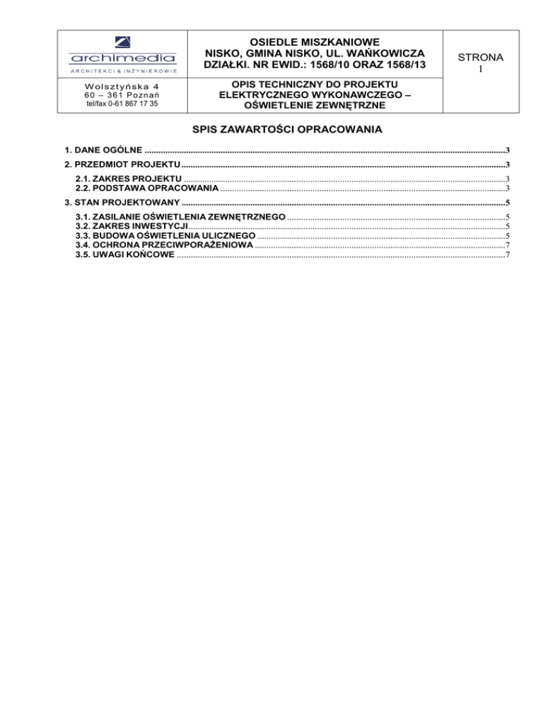 OSIEDLE MISZKANIOWE NISKO, GMINA NISKO, UL. WAŃKOWICZA DZIAŁKI. NR EWID.: 1568/10 ORAZ 1568/13 Wolsztyńska 4 6 0 – 3 6 1 P o zn a ń tel/fax 0-61 867 17 35 STRONA 1 OPIS TECHNICZNY DO PROJEKTU ELEKTRYCZNEGO WYKONAWCZEGO – OŚWIETLENIE ZEWNĘTRZNE SPIS ZAWARTOŚCI OPRACOWANIA 1. DANE OGÓLNE .............................................................................................................................................................3 2. PRZEDMIOT PROJEKTU .............................................................................................................................................3 2.1. ZAKRES PROJEKTU ............................................................................................................................................3 2.2. PODSTAWA OPRACOWANIA ............................................................................................................................3 3. STAN PROJEKTOWANY .............................................................................................................................................5 3.1. ZASILANIE OŚWIETLENIA ZEWNĘTRZNEGO ...............................................................................................5 3.2. ZAKRES INWESTYCJI ..........................................................................................................................................5 3.3. BUDOWA OŚWIETLENIA ULICZNEGO ............................................................................................................5 3.4. OCHRONA PRZECIWPORAŻENIOWA .............................................................................................................7 3.5. UWAGI KOŃCOWE ...............................................................................................................................................7 OSIEDLE MISZKANIOWE NISKO, GMINA NISKO, UL. WAŃKOWICZA DZIAŁKI. NR EWID.: 1568/10 ORAZ 1568/13 Wolsztyńska 4 6 0 – 3 6 1 P o zn a ń tel/fax 0-61 867 17 35 OPIS TECHNICZNY DO PROJEKTU ELEKTRYCZNEGO WYKONAWCZEGO – OŚWIETLENIE ZEWNĘTRZNE SPIS RYSUNKÓW: E-1 Oświetlenie zewnętrzne - PZT E-2 Schemat instalacji oświetlenia zewnętrznego STRONA 2 OSIEDLE MISZKANIOWE NISKO, GMINA NISKO, UL. WAŃKOWICZA DZIAŁKI. NR EWID.: 1568/10 ORAZ 1568/13 Wolsztyńska 4 6 0 – 3 6 1 P o zn a ń tel/fax 0-61 867 17 35 STRONA 3 OPIS TECHNICZNY DO PROJEKTU ELEKTRYCZNEGO WYKONAWCZEGO – OŚWIETLENIE ZEWNĘTRZNE 1. DANE OGÓLNE Inwestor: WOJSKOWA AGENCJA MIESZKANIOWA ODDZIAŁ REGIONALNY W KRAKOWIE UL. MONTELUPICH 3 31-155 KRAKÓW Obiekt: OSIEDLE MISZKANIOWE PRZY UL. WAŃKOWICZA W NISKU NISKO, GMINA NISKO, UL. WAŃKOWICZA DZIAŁKI. NR EWID.: 1568/10 ORAZ 1568/13 2. PRZEDMIOT PROJEKTU Przedmiotem opracowania jest projekt instalacji elektrycznych oświetlenia zewnętrzno dla budynków wielorodzinnych (budynek nr 1, 2, 3 i 4), przy ul. Wańkowicza, działki. nr ewid.: 1568/10 oraz 1568/13, Nisko. 2.1. ZAKRES PROJEKTU Projekt obejmuje: ułożenie linii kablowej nN oświetlenia zewnętrznego, montaż słupów oświetleniowych wraz oprawami oświetleniowymi. 2.2. PODSTAWA OPRACOWANIA Norma PN-HD 60364-1:2010 „Instalacje elektryczne niskiego napięcia.” Norma N SEP-E-004 „Elektroenergetyczne i sygnalizacyjne linie kablowe. Projektowanie i budowa.” PN-EN 62305 „Ochrona odgromowa.” OSIEDLE MISZKANIOWE NISKO, GMINA NISKO, UL. WAŃKOWICZA DZIAŁKI. NR EWID.: 1568/10 ORAZ 1568/13 Wolsztyńska 4 6 0 – 3 6 1 P o zn a ń tel/fax 0-61 867 17 35 STRONA 4 OPIS TECHNICZNY DO PROJEKTU ELEKTRYCZNEGO WYKONAWCZEGO – OŚWIETLENIE ZEWNĘTRZNE Rozporządzenie Ministra Infrastruktury z dnia 12 kwietnia 2002 r. w sprawie warunków technicznych, jakim powinny odpowiadać budynki i ich usytuowanie PBUE - Przepisy budowy urządzeń elektroenergetycznych Branżowe projekty budowlane Zlecenie i wytyczne Inwestora OSIEDLE MISZKANIOWE NISKO, GMINA NISKO, UL. WAŃKOWICZA DZIAŁKI. NR EWID.: 1568/10 ORAZ 1568/13 STRONA 5 OPIS TECHNICZNY DO PROJEKTU ELEKTRYCZNEGO WYKONAWCZEGO – OŚWIETLENIE ZEWNĘTRZNE Wolsztyńska 4 6 0 – 3 6 1 P o zn a ń tel/fax 0-61 867 17 35 3. STAN PROJEKTOWANY 3.1. ZASILANIE OŚWIETLENIA ZEWNĘTRZNEGO Oświetlenie zewnętrzne RE5/ZP/419/534/IX/2012 zgodnie z dnia z wydanymi 11.06.2012r) do warunkami sieci przyłączenia elektroenergetycznej (nr PGE Dystrybucja zasilane jest z tablicy licznikowej zlokalizowanej w rozdzielnicy głównej (RG) w budynku nr 4 (klatka B). Oświetlenie zewnętrzne podzielono na: parkowe zasilanie linią kablową YAKY 4x35mm2, uliczne zasilanie linią kablową YAKY 4x35mm2. Sterowanie oświetleniem zewnętrznym odbywa się poprzez zegar astronomiczny. 3.2. ZAKRES INWESTYCJI Zakres inwestycji obejmuje: budowę oświetlenia ulicznego na przedmiotowej inwestycji, budowę oświetlenia parkowego na przedmiotowej inwestycji, wykonanie zasilania projektowanego oświetlenia ulicznego i parkowego z rozdzielnicy głównej (RG) budynku 4 (klatka B). 3.3. BUDOWA OŚWIETLENIA ULICZNEGO Słupy świetlenia ulicznego i parkowego wraz z oprawami należy umiejscowić zgodnie z rys. E-01. Z rozdzielni głównej (RG) budynku 4 (klatka B) wyprowadzić dwie linie kablowe YAKY 4x35mm2 i przepleść przez nią wszystkie projektowane słupy oświetleniowe ulicznego i parkowo (rys. E-01). Kabel YAKY 4x35mm2 w ziemi układać na głębokości 0,7 m (pod chodnikiem na głębokości 0,5), a pod droga i parkingiem na głębokości 1m w rurze osłonowej DVK 75 (rury osłonowe należy uszczelnić obustronnie). Poniżej kabla w odległości 10 cm ułożyć bednarkę Fe/Zn OSIEDLE MISZKANIOWE NISKO, GMINA NISKO, UL. WAŃKOWICZA DZIAŁKI. NR EWID.: 1568/10 ORAZ 1568/13 Wolsztyńska 4 6 0 – 3 6 1 P o zn a ń tel/fax 0-61 867 17 35 STRONA 6 OPIS TECHNICZNY DO PROJEKTU ELEKTRYCZNEGO WYKONAWCZEGO – OŚWIETLENIE ZEWNĘTRZNE 25x4 uziemiającą każdy słup (w przypadku układania bednarki w wspólnym wykopie głębokość wykopu musi być większa o co najmniej 10 cm w stosunku do w