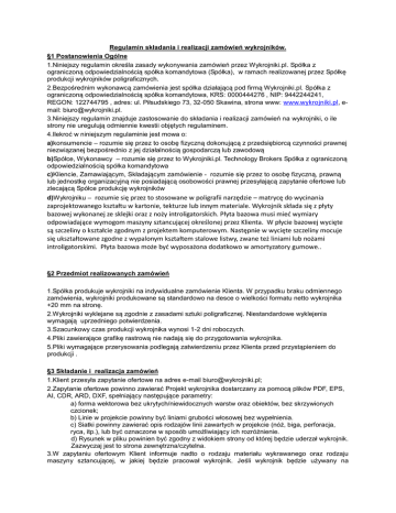 Regulamin składania i realizacji zamówień wykrojników. §1 Postanowienia Ogólne 1.Niniejszy regulamin określa zasady wykonywania zamówień przez Wykrojniki.pl. Spółka z ograniczoną odpowiedzialnością spółka komandytowa (Spółka), w ramach realizowanej przez Spółkę produkcji wykrojników poligraficznych. 2.Bezpośrednim wykonawcą zamówienia jest spółka działającą pod firmą Wykrojniki.pl. Spółka z ograniczoną odpowiedzialnością spółka komandytowa, KRS: 0000444276 , NIP: 9442244241, REGON: 122744795 , adres: ul. Piłsudskiego 73, 32-050 Skawina, strona www: www.wykrojniki.pl, email: [email protected]. 3.Niniejszy regulamin znajduje zastosowanie do składania i realizacji zamówień na wykrojniki, o ile strony nie uregulują odmiennie kwestii objętych regulaminem. 4.Ilekroć w niniejszym regulaminie jest mowa o: a)konsumencie – rozumie się przez to osobę fizyczną dokonującą z przedsiębiorcą czynności prawnej niezwiązanej bezpośrednio z jej działalnością gospodarczą lub zawodową b)Spółce, Wykonawcy – rozumie się przez to Wykrojniki.pl. Technology Brokers Spółka z ograniczoną odpowiedzialnością spółka komandytowa c)Kliencie, Zamawiającym, Składającym zamówienie - rozumie się przez to osobę fizyczną, prawną lub jednostkę organizacyjną nie posiadającą osobowości prawnej przesyłającą zapytanie ofertowe lub zlecającą Spółce produkcję wykrojników d)Wykrojniku – rozumie się przez to stosowane w poligrafii narzędzie – matrycę do wycinania zaprojektowanego kształtu w kartonie, tekturze lub innym materiale. Wykrojnik składa się z płyty bazowej wykonanej ze sklejki oraz z noży introligatorskich. Płyta bazowa musi mieć wymiary odpowiadające wymogom maszyny sztancującej określonej przez Klienta. W płycie bazowej wycięte są szczeliny o kształcie zgodnym z projektem komputerowym. Następnie w wycięte szczeliny mocuje się ukształtowane zgodne z wypalonym kształtem stalowe listwy, zwane też liniami lub nożami introligatorskimi. Płyta bazowa może być wyposażona dodatkowo w amortyzatory gumowe.. §2 Przedmiot realizowanych zamówień 1.Spółka produkuje wykrojniki na indywidualne zamówienie Klienta. W przypadku braku odmiennego zamówienia, wykrojniki produkowane są standardowo na desce o wielkości formatu netto wykrojnika +20 mm na stronę. 2.Wykrojniki wyklejane są zgodnie z zasadami sztuki poligraficznej. Niestandardowe wyklejenia wymagają uprzedniego potwierdzenia. 3.Szacunkowy czas produkcji wykrojnika wynosi 1-2 dni roboczych. 4.Pliki zawierające grafikę rastrową nie nadają się do przygotowania wykrojnika. 5.Pliki wymagające przerysowania podlegają zatwierdzeniu przez Klienta przed przystąpieniem do produkcji . §3 Składanie i realizacja zamówień 1.Klient przesyła zapytanie ofertowe na adres e-mail [email protected]; 2.Zapytanie ofertowe powinno zawierać Projekt wykrojnika dostarczany za pomocą plików PDF, EPS, AI, CDR, ARD, DXF, spełniający następujące parametry: a) forma wektorowa bez ukrytych/niewidocznych warstw oraz obiektów, bez skrzywionych czcionek; b) Linie w projekcie powinny być liniami grubości włosowej bez wypełnienia. c) Siatki powinny zawierać opis rodzajów linii zawartych w projekcie (nóż, biga, perforacja, ryca, itp.), lub być oznaczone w sposób umożliwiający ich rozróżnienie. d) Rysunek w pliku powinien być zgodny z widokiem strony od której będzie uderzał wykrojnik. Zazwyczaj jest to strona zewnętrzna/czytelna. 3.W zapytaniu ofertowym Klient informuje nadto o rodzaju materiału wykrawanego oraz rodzaju maszyny sztancującej, w jakiej będzie pracował wykrojnik. Jeśli wykrojnik będzie używany na automacie sztancującym konieczna jest informacja o preferowanej wielkości deski i odległości od pierwszego noża do krawędzi papieru od strony łapek, oraz parametrów frezowania deski (szerokość głębokość). 4.Spółka po otrzymaniu zapytania ofertowego przygotowuje kalkulację, składając ofertę realizacji zamówienia bądź informuje o brakach zamówienia uniemożliwiających przygotowanie oferty. 5.Z chwilą potwierdzenia przyjęcia oferty przez Klienta zlecenie kierowane jest do produkcji a umowa uważana za zawartą. W przypadku rozbieżności między treścią zapytania ofertowego a ofertą – wiążąca jest treść oferty. 6.Klient nie podając wszystkich informacji wymaganych w pkt 2 i 3 niniejszego § czyni to na własne ryzyko. Spółka przystępuje wówczas do produkcji wykrojnika według standardowych rozwiązań. 7.Wszelkie zmiany lub poprawki zamówienia składane przez Klienta po przyjęciu oferty wymagają potwierdzenia przez Spółkę. Jeśli Spółka poniosła już koszty produkcji wykrojnika, a Klient zamierza zmienić treść zamówienia, zobowiązany jest do zapłaty kosztów poniesionych przez Spółkę. 8.Wyprodukowane materiały dostarczane są Zamawiającemu przez Spółkę transportem własnym lub przesyłką kurierską na adres wskazany przy składaniu zamówienia. W razie niemożności dostawy na adres wskazany przez Zamawiającego towar wraca do siedziby Spółki, a Zamawiający zobowiązany jest dokonać odbioru na swój koszt i ryzyko. W takim wypadku Wykonawca zastrzega prawo naliczania opłat za składowanie w wysokości 10% od wartości zamówienia za każdy dzień składu, na co użytkownik wyraża zgodę. § 4 Cena i sposoby płatności 1.Ceny podane przy składaniu ofert są cenami netto oraz są wyrażone w polskich złotych. 2.Zamawiający zobowiązany jest uiścić wynagrodzenie zgodnie z terminem i formą płatności wskazanym w ofercie. W razie braku wskazania terminu płatności, wynosi on 7 dni od dnia odbioru przedmiotu zamówienia. 3.W przypadku opóźnienia w płatności Spółka będzie naliczać odsetki ustawowe za zwłokę. § 5 Postępowanie reklamacyjne 1.Wszelkie reklamacje Użytkownik powinien kierować na adres: Wykrojniki.pl, ul. Piłsudskiego 73, 32050 Skawina / e