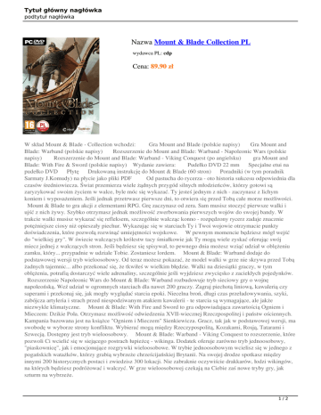 Tytuł główny nagłówka podtytuł nagłówka Nazwa Mount & Blade Collection PL wydawca PL: cdp Cena: 89.90 zł W skład Mount & Blade - Collection wchodzi: Gra Mount and Blade (polskie napisy) Gra Mount and Blade: Warband (polskie napisy) Rozszerzenie do Mount and Blade: Warband - Napoleonic Wars (polskie napisy) Rozszerzenie do Mount and Blade: Warband - Viking Conquest (po angielsku) gra Mount and Blade: With Fire & Sword (polskie napisy) Wydanie zawiera: Pudełko DVD 22 mm Specjalne etui na pudełko DVD Płytę Drukowaną instrukcję do Mount & Blade (60 stron) Poradniki (w tym poradnik Sarmaty J.Komudy) na płycie jako pliki PDF Od pastucha do rycerza - oto historia sukcesu odpowiednia dla czasów średniowiecza. Świat przemierza wiele żądnych przygód silnych młodzieńców, którzy gotowi są zaryzykować swoim życiem w walce, byle móc się wykazać. Ty jesteś jednym z nich - zaczynasz z lichym koniem i wyposażeniem. Jeśli jednak przetrwasz pierwsze dni, to otwiera się przed Tobą całe morze możliwości. Mount & Blade to gra akcji z elementami RPG. Grę zaczynasz od zera. Sam musisz stoczyć pierwsze walki i ujść z nich żywy. Szybko otrzymasz jednak możliwość zwerbowania pierwszych wojów do swojej bandy. W trakcie walki musisz wykazać się refleksem, szczególnie walcząc konno - rozpędzony rycerz zadaje znacznie potężniejsze ciosy niż opieszały piechur. Wykazując się w starciach Ty i Twoi wojowie otrzymacie punkty doświadczenia, które pozwolą rozwinąć umiejętności wojskowe. W pewnym momencie będziesz mógł wejść do "wielkiej gry". W świecie walczących królestw tacy śmiałkowie jak Ty mogą wiele zyskać oferując swój miecz jednej z walczących stron. Jeśli będziesz się spisywał, to pewnego dnia możesz wziąć udział w oblężeniu zamku, który... przypadnie w udziale Tobie. Zostaniesz lordem. Mount & Blade: Warband dodaje do podstawowej wersji tryb wieloosobowy. Od teraz możesz pokazać, że model walki w grze nie skrywa przed Tobą żadnych tajemnic... albo przekonać się, że tkwiłeś w wielkim błędzie. Walki na dziesiątki graczy, w tym oblężenia, potrafią dostarczyć wiele adrenaliny, szczególnie jeśli wyjdziesz zwycięsko z zaciekłych pojedynków. Rozszerzenie Napoleonic Wars do Mount & Blade: Warband rozbudowuje tryb sieciowy gry o wojnę napoleońską. Weź udział w ogromnych starciach dla nawet 200 graczy. Zagraj piechotą liniową, kawalerią czy saperami i przekonaj się, jak mogły wyglądać starcia epoki. Niecelna broń, długi czas przeładowywania, szyki, zabójcza artyleria i strach przed niespodziwanym atakiem kawalerii - te starcia są wymagające, ale jakże niezwykle klimatyczne. Mount & Blade: With Fire and Sword to gra odpowiadająca zawartością Ogniem i Mieczem: Dzikie Pola. Otrzymasz możliwość odwiedzenia XVII-wiecznej Rzeczpospolitej i państw ościennych. Kampania bazowana jest na książce "Ogniem i Mieczem" Sienkiewicza. Gracz, tak jak w podstawowej wersji, ma swobodę w wyborze strony konfliktu. Wybierać mogą między Rzeczypospolitą, Kozakami, Rosją, Tatarami i Szwecją. Dostępny jest tryb wieloosobowy. Mount & Blade: Warband - Viking Conquest to rozszerzenie, które pozwoli Ci wcielić się w siejącego postrach łupieżcę - wikinga. Dodatek oferuje zarówno tryb jednoosobowy, "piaskownicę", jak i emocjonujące rozgrywki wieloosobowe. W trybie jednoosobowym wcielisz się w jednego z pogańskich watażków, którzy grabią wybrzeże chrześcijańskiej Brytanii. Na swojej drodze spotkasz między innymi 200 historycznych postaci i zwiedzisz 300 lokacji. Nie zabraknie oczywiście drakkarów, łodzi wikingów, na których będziesz podróżować i walczyć. W grze wieloosobowej czekają na Ciebie zaś nowe tryby gry, jak szturm na wybrzeże. 1/2 Tytuł główny nagłówka podtytuł nagłówka Nazwa Wartość Wydawca PL cdp.pl / CDP Projekt Tryb gry Single / Multiplayer Data premiery Kategoria wiekowa Wersja językowa Format 12.03.2015 16+ PL (napisy) DVD 2/2