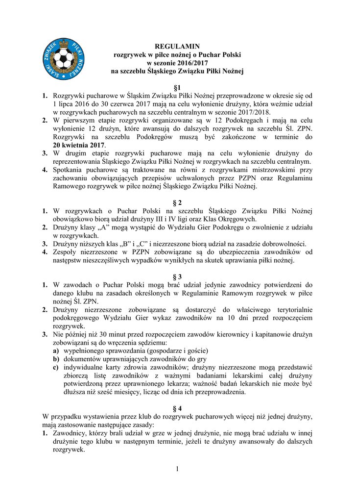 REGULAMIN rozgrywek w piłce nożnej o Puchar Polski w sezonie 2016/2017 na szczeblu Śląskiego Związku Piłki Nożnej 1. 2. 3. 4. §1 Rozgrywki pucharowe w Śląskim Związku Piłki Nożnej przeprowadzone w okresie się od 1 lipca 2016 do 30 czerwca 2017 mają na celu wyłonienie drużyny, która weźmie udział w rozgrywkach pucharowych na szczeblu centralnym w sezonie 2017/2018. W pierwszym etapie rozgrywki organizowane są w 12 Podokręgach i mają na celu wyłonienie 12 drużyn, które awansują do dalszych rozgrywek na szczeblu Śl. ZPN. Rozgrywki na szczeblu Podokręgów muszą być zakończone w terminie do 20 kwietnia 2017. W drugim etapie rozgrywki pucharowe mają na celu wyłonienie drużyny do reprezentowania Śląskiego Związku Piłki Nożnej w rozgrywkach na szczeblu centralnym. Spotkania pucharowe są traktowane na równi z rozgrywkami mistrzowskimi przy zachowaniu obowiązujących przepisów uchwalonych przez PZPN oraz Regulaminu Ramowego rozgrywek w piłce nożnej Śląskiego Związku Piłki Nożnej. §2 1. W rozgrywkach o Puchar Polski na szczeblu Śląskiego Związku Piłki Nożnej obowiązkowo biorą udział drużyny III i IV ligi oraz Klas Okręgowych. 2. Drużyny klasy „A” mogą wystąpić do Wydziału Gier Podokręgu o zwolnienie z udziału w rozgrywkach. 3. Drużyny niższych klas „B” i „C” i niezrzeszone biorą udział na zasadzie dobrowolności. 4. Zespoły niezrzeszone w PZPN zobowiązane są do ubezpieczenia zawodników od następstw nieszczęśliwych wypadków wynikłych na skutek uprawiania piłki nożnej. §3 1. W zawodach o Puchar Polski mogą brać udział jedynie zawodnicy potwierdzeni do danego klubu na zasadach określonych w Regulaminie Ramowym rozgrywek w piłce nożnej Śl. ZPN. 2. Drużyny niezrzeszone zobowiązane są dostarczyć do właściwego terytorialnie podokręgowego Wydziału Gier wykaz zawodników na 10 dni przed rozpoczęciem rozgrywek. 3. Nie później niż 30 minut przed rozpoczęciem zawodów kierownicy i kapitanowie drużyn zobowiązani są do wręczenia sędziemu: a) wypełnionego sprawozdania (gospodarze i goście) b) dokumentów uprawniających zawodników do gry c) indywidualne karty zdrowia zawodników; drużyny niezrzeszone mogą przedstawić zbiorczą listę zawodników z ważnymi badaniami lekarskimi całej drużyny potwierdzoną przez uprawnionego lekarza; ważność badań lekarskich nie może być dłuższa niż sześć miesięcy, licząc od dnia ich przeprowadzenia. §4 W przypadku wystawienia przez klub do rozgrywek pucharowych więcej niż jednej drużyny, mają zastosowanie następujące zasady: 1. Zawodnicy, którzy brali udział w grze w jednej drużynie, nie mogą brać udziału w innej drużynie tego klubu w następnym terminie, jeżeli te drużyny awansowały do dalszych rozgrywek. 1 2. Jeżeli drużyna została wyeliminowana z rozgrywek, to najwyżej trzech zawodników tego zespołu może grać w drużynie, która zakwalifikowała się do dalszych gier. 3. Oznaczenie drużyn tego samego klubu ustala się na podstawie klas rozgrywkowych, w których aktualnie występują – I drużynę reprezentuje zespół występujący w najwyższej klasie rozgrywkowej. §5 1. Rozgrywki zostaną przeprowadzone systemem pucharowym, tzn. drużyna przegrywająca odpada z dalszych rozgrywek. 2. Wydziały Gier poszczególnych Podokręgów przed rozpoczęciem każdej rundy poprzez losowanie ustalają zestawienia par, przy czym nie wyklucza się możliwości awansu zespołu do dalszych gier na podstawie wolnego losu. 3. Gospodarzami zawodów są zespoły niższych klas, a w przypadku zespołów tej samej klasy o miejscu rozgrywania meczu decyduje właściwy Wydział Gier poprzez losowanie gospodarza. 4. Kluby będące gospodarzami zawodów organizują spotkania na koszt własny łącznie z opłatami sędziowskimi, jak w meczu mistrzowskim. Każda drużyna wyjeżdża na zawody na koszt własny. 5. Rozgrywki w drugim etapie przeprowadzane są przez Wydział Gier Śl. ZPN według zasad określonych w § 5 pkt 1-4. 6. W pierwszym etapie rozgrywek sędziów na zawody delegują Kolegia Sędziów Podokręgów, a w drugim Kolegium Sędziów Śl. ZPN. 1. 2. 3. 4. 5. 6. §6 Czas trwania zawodów wynosi 2x45 minut z obowiązkową przerwą pomiędzy obiema częściami gry. Czas trwania przerwy nie może przekroczyć 15 minut. Zawodnicy mają prawo do minimum 5 minut przerwy między obiema częściami gry. Sędzia nie ma prawa do jej skrócenia w przypadku, gdy choćby jeden zawodnik nie wyrażał na to zgody. W przypadku uzyskania wyniku nierozstrzygniętego, sędzia zarządza dogrywkę 2x15 minut. Jeżeli w czasie dogrywki obie drużyny zdobędą taką samą ilość bramek, to zasada podwójnego liczenia bramek zdobytych w dogrywce przez drużynę gości nie ma zastosowania. Zawodnikom przysługuje prawo do 5-minutowej przerwy przed dogrywką, podczas której muszą pozostać na polu gry. Po zakończeniu pierwszej części dogrywki, zawodnikom nie przysługuje prawo do przerwy, a po zmianie stron niezwłocznie następuje rozpoczęcie drugiej części dogrywki. Gdy dogrywka zakończy się wynikiem nierozstrzygniętym, sędzia zawodów zarządza wykonanie rzutów karnych według obowiązujących przepisów w celu wyłonienia zwycięzcy. Wszystkie rzuty karne muszą być wykonane do tej samej bramki. O wyborze bramki decyduje sędzia główny zawodów. Uznanie bramki może nastąpić tylko z rzutu bezpośredniego, a bramki zdobyte z tzw. „dobitki” są nieważne. §7 1. W rozgrywkach pucharowych dozwolona jest wymiana czterech zawodników w ciągu całego meczu dla drużyn wszystkich klas rozgrywkowych bez prawa ponownego powrotu na boisko. 2. Po zakończeniu dogrywki, przed serią rzutów karnych, wymiana zawodników jest niedozwolona. 2 3. W rozgrywkach pucharowych nie obowiązuje przepis o obowiązku gry zawodników młodzieżowych. 1. 2. 3. 4. 5. 6. 7. 8. §8 W pierwszym etapie na szczeblu Podokręgów organami właściwymi do 