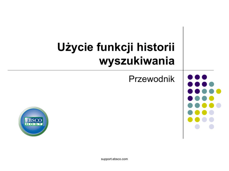 Użycie funkcji historii wyszukiwania Przewodnik support.ebsco.com Witamy w przewodniku EBSCOhost dotyczącym historii wyszukiwania. W tym przewodniku przyjrzymy się możliwościom, jakie daje opcja Alerty/Historia wyszukiwania, obejmującym edytowanie wykonanego wcześniej wyszukiwania zapisanie wyszukiwania oraz edytowanie już zapisanego wyszukiwania. Historię wyszukiwania dla bieżącej sesji można wyświetlić klikając link Historia wyszukiwania pod polem Wyszukaj. Link ten umożliwia wydrukowanie historii wyszukiwania, pobranie wcześniejszych wyszukiwań, pobranie alertów oraz zapisanie wyszukiwań i alertów. Możesz również łączyć wyszukiwania i dodawać je do pola Wyszukaj zaznaczając pola wyboru obok wyszukiwań, które chcesz uruchomić i klikając jeden z przycisków Szukaj z operatorem. W części Czynności można wyświetlić wyniki dla każdego wiersza historii wyszukiwania klikając Przeglądaj wyniki i wyświetlić szczegóły przeprowadzonych wyszukiwań, klikając link Przeglądaj szczegóły. Kliknij link Edytuj, by zmodyfikować wiersz swojej historii wyszukiwania. Wyświetlone zostanie okno Edycja wyszukiwania. Zmodyfikuj lub dodaj szukane terminy w polu Wyszukaj i zastosuj lub usuń wszelkie wybrane ograniczenia lub rozszerzenia. Jeśli Twoje wyszukiwanie zawiera inne wyszukiwania z Twojej historii wyszukiwania, możesz je wyświetlić klikając link Przeglądaj wyszukiwania zależne. Wyszukiwania zależne są wyświetlane w oknie podręcznym. Po zakończeniu edycji wyszukiwania kliknij przycisk Zapisz. Możesz zapisać wyszukiwania w swoim folderze My EBSCOhost klikając link Zapisz wyszukiwania/alerty po zakończeniu wyszukiwania. Aby zapisać wyłącznie określone wyszukiwania, zaznacz pola wyboru wyszukiwań, które chcesz zapisać, a następnie kliknij link Zapisz wyszukiwania. Jeśli nie jesteś zalogowany do foldera My EBSCOhost, system poprosi Cię o zalogowanie. Wypełnij pola i wybierz przełącznik znajdujący się przed opcją Zapisane wyszukiwanie na stałe lub tymczasowo, a następnie kliknij przycisk Zapisz. Twoje kryteria wyszukiwania będą przechowywane w Twoim spersonalizowanym folderze My EBSCOhost, dopóki ich nie usuniesz. Możesz również edytować swoje wyszukiwania po ich zapisaniu w folderze My EBSCOhost klikając link Edytuj zapisane wyszukiwanie. Kliknij link Edytuj dla wiersza wyszukiwania, który chcesz edytować i wprowadź poprawki w oknie Edycja wyszukiwania. Po zakończeniu edycji zapisanego wyszukiwania kliknij przycisk Kontynuacja, aby powrócić do foldera My EBSCOhost. W każdej chwili możesz kliknąć link Pomoc, aby wyświetlić pełny system pomocy online. Aby uzyskać więcej informacji, odwiedź stronę Działu Wsparcia EBSCO http://support.ebsco.com