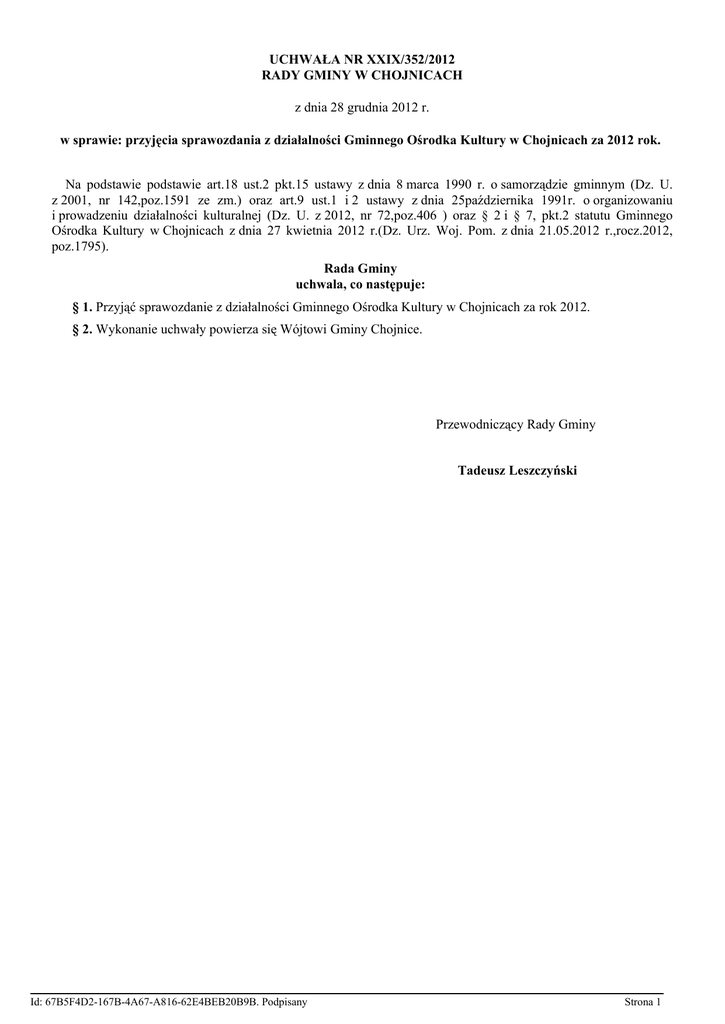UCHWAŁA NR XXIX/352/2012 RADY GMINY W CHOJNICACH z dnia 28 grudnia 2012 r. w sprawie: przyjęcia sprawozdania z działalności Gminnego Ośrodka Kultury w Chojnicach za 2012 rok. Na podstawie podstawie art.18 ust.2 pkt.15 ustawy z dnia 8 marca 1990 r. o samorządzie gminnym (Dz. U. z 2001, nr 142,poz.1591 ze zm.) oraz art.9 ust.1 i 2 ustawy z dnia 25października 1991r. o organizowaniu i prowadzeniu działalności kulturalnej (Dz. U. z 2012, nr 72,poz.406 ) oraz § 2 i § 7, pkt.2 statutu Gminnego Ośrodka Kultury w Chojnicach z dnia 27 kwietnia 2012 r.(Dz. Urz. Woj. Pom. z dnia 21.05.2012 r.,rocz.2012, poz.1795). Rada Gminy uchwala, co następuje: § 1. Przyjąć sprawozdanie z działalności Gminnego Ośrodka Kultury w Chojnicach za rok 2012. § 2. Wykonanie uchwały powierza się Wójtowi Gminy Chojnice. Przewodniczący Rady Gminy Tadeusz Leszczyński Id: 67B5F4D2-167B-4A67-A816-62E4BEB20B9B. Podpisany Strona 1 Załącznik Nr 1 do Uchwały Nr XXIX/352/2012 Rady Gminy w Chojnicach z dnia 28 grudnia 2012 r. Sprawozdania z działalności Gminnego Osrodka Kultury w Chojnicach za rok 2012 Kulturę tworzy człowiek i jest przez nią jednocześnie kształtowany, dlatego niezmiennie już od 10 lat działalności Gminnego Ośrodka Kultury w Chojnicach towarzyszy wielka troska o rozbudzenie zainteresowania sprawami kultury wśród jak największej grupy mieszkańców gminy Chojnice. Poniższe sprawozdanie dokumentuje wkład GOK w Chojnicach w środowisko naszej gminy w mijającym 2012 roku. Gminny Ośrodek Kultury w Chojnicach jest samorządową instytucja kultury. Obszarem naszego działania jest gmina wiejska Chojnice. GOK w Chojnicach prowadzi swoją działalność w oparciu zapisy zawarte w Statucie Instytucji oraz rozpoznane potrzeby kulturalne i sportowe mieszkańców gminy, przy uwzględnieniu możliwości finansowych, kadrowych oraz lokalowych. Realizujemy zadania w obszarze edukacji kulturalnej, upowszechniania kultury, promocji oraz rekreacji i sportu. Prowadzimy gospodarkę finansową oparta na zasadach obowiązujących dla instytucji kultury. Swoją codzienną pracą chcemy tworzyć jak najlepsze warunki do wszechstronnego rozwoju mieszkańców poprzez edukację kulturalną kształtującą nawyki odbiorcy wartości kulturowych. W roku 2012 działalność Gminnego Ośrodka Kultury w Chojnicach prowadzona była w oparciu o sieć placówek kulturalnych, którą tworzyły: - trzy Wiejskie Domy Kultury: WDK w Silnie wraz z Chatą Podcieniową, WDK w Ogorzelinach, WDK w Swornegaciach wraz z Kaszubskim Domem Rękodzieła Ludowego i wiatą pieca chlebowego; czternaście Świetlic Wiejskich: Chojniczki, Nowe Ostrowite, Ciechocin, Czartołomie, Angowice, Nowy Dwór, Pawłowo, Krojanty, Racławki, Lotyń, Klawkowo, Kruszka, Kłodawa, Nowa Cerkiew - dwa Amfiteatry Letnie: Amfiteatr im. Ottona Weilanda w Charzykowach, Amfiteatr Letni w Swornegaciach; - Kompleks boisk sportowych „Orlik” w Charzykowach W wymienionych obiektach prowadzona była statutowa działalność GOK, a także udostępniane były one mieszkańcom na różnego rodzaju spotkania, zebrania, narady, konferencje, szkolenia rolnicze, sesje RG oraz pokazy i kiermasze. Ponadto pomieszczenia GOK wynajmowano na uroczystości rodzinne i towarzyskie oraz udostępniano je lokalnym organizacjom pozarządowym na realizację projektów animacyjnych skierowanych do mieszkańców Gminy. Zarówno Wiejskie Domy Kultury jak i Świetlice Wiejskie swoją działalność prowadziły w oparciu o miesięczne plany pracy. Z analizy prowadzonych przez placówki dokumentacji wynika, iż średni dzienny udział podopiecznych w roku 2012 utrzymywał się na poziomie lat poprzednich tj. 350 młodych mieszkańców gminy dziennie. I. Zatrudnienie w Gminnym Ośrodku Kultury WDK Świetlice osoby etaty Administracja osoby etaty Id: 67B5F4D2-167B-4A67-A816-62E4BEB20B9B. Podpisany Promocja osoby etaty Sport osoby etaty RAZEM osoby etaty Strona 1 01/2012 02/2012 03/2012 04/2012 05/2012 06/2012 07/2012 08/2012 09/2012 10/2012 11/2012 12/2012 26 26 26 26 26 27 27 27 27 26 28 28 15,61 15,61 15,61 15,61 15,36 15,86 15,86 15,86 15,86 15,36 16,36 17,12 6 6 6 6 6 6 5 5 5 5 5 5 6 6 6 6 6 6 5 5 5 5 5 5 2 2 2 2 2 2 2 2 2 2 2 2 2 2 2 2 2 2 2 2 2 2 2 2 2 2 2 2 2 2 2 2 2 2 2 2 1,5 1,5 1,5 2 2 2 2 2 2 2 2 2 36 36 36 36 36 37 36 36 36 35 37 37 25,11 25,11 25,11 25,61 25,36 25,86 24,86 24,86 24,86 24,36 25,36 26,12 Zmiany w ilości zatrudnianych pracowników i liczby etatów w Gminnym Ośrodku Kultury w Chojnicach w roku 2012 wynikały z zatrudniania na zastępstwo instruktorów podczas zwolnień chorobowych oraz urlopów macierzyńskich i wychowawczych oraz otwarcia nowej placówki w miejscowości Nowa Cerkiew. W trakcie całego roku, w celu wsparcia osobowego naszych placówek zawartych zostało 20 umów wolontariackich. Całość działalności naszych placówek terenowych w tym projektów animacyjnych była koordynowana pracą działu administracyjno- księgowego oraz zatrudnionych specjalistów, którzy wspierają m.in. instruktażowo i merytorycznie wszystkie placówki terenowe oraz prowadzą rozliczanie dokumentacji aplikacyjnych. W celu usprawnienia pracy sieci naszych placówek oraz wymiany doświadczeń między zatrudnionymi instruktorami w roku 2012 zorganizowano 5 narad roboczych. Spotkania te, jak w latach poprzednich są platformą dyskusji nad bieżącą działalnością oraz koniecznością rozwoju nowych obszarów naszej pracy. Spotkania te służą także kompleksowej ocenie wydatkowania środków finansowania i prowadzonej dokumentacji oraz wypracowaniu wspólnych propozycji programowych. W roku 2012 nasza instytucja prowadziła bogatą działalność animacyjną. Służyła ona upowszechnianiu kultury wśród mieszkańców gminy poprzez organizację i zaproszenie do wzięcia udziału w przedsięwzięciach kulturalnych organizowanych cyklicznie, bądź też okolicznościowo. Dzięki temu mieszkańcy mogli być obserwatorami, a w wielu przypadkach współtwó