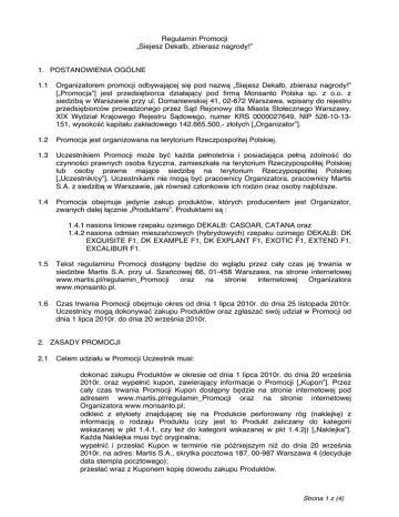 Regulamin Promocji „Siejesz Dekalb, zbierasz nagrody!” 1. POSTANOWIENIA OGÓLNE 1.1 Organizatorem promocji odbywającej się pod nazwą „Siejesz Dekalb, zbierasz nagrody!” [„Promocja”] jest przedsiębiorca działający pod firmą Monsanto Polska sp. z o.o. z siedzibą w Warszawie przy ul. Domaniewskiej 41, 02-672 Warszawa, wpisany do rejestru przedsiębiorców prowadzonego przez Sąd Rejonowy dla Miasta Stołecznego Warszawy, XIX Wydział Krajowego Rejestru Sądowego, numer KRS 0000027649, NIP 526-10-13151, wysokość kapitału zakładowego 142.665.500,- złotych [„Organizator”]. 1.2 Promocja jest organizowana na terytorium Rzeczpospolitej Polskiej. 1.3 Uczestnikiem Promocji może być każda pełnoletnia i posiadająca pełną zdolność do czynności prawnych osoba fizyczna, zamieszkała na terytorium Rzeczypospolitej Polskiej lub osoby prawne mające siedzibę na terytorium Rzeczypospolitej Polskiej [„Uczestnik/cy”]. Uczestnikami nie mogą być pracownicy Organizatora, pracownicy Martis S.A. z siedzibą w Warszawie, jak również członkowie ich rodzin oraz osoby najbliższe. 1.4 Promocja obejmuje jedynie zakup produktów, których producentem jest Organizator, zwanych dalej łącznie „Produktami”. Produktami są : 1.4.1 nasiona liniowe rzepaku ozimego DEKALB: CASOAR, CATANA oraz 1.4.2 nasiona odmian mieszańcowych (hybrydowych) rzepaku ozimego DEKALB: DK EXQUISITE F1, DK EXAMPLE F1, DK EXPLANT F1, EXOTIC F1, EXTEND F1, EXCALIBUR F1. 1.5 Tekst regulaminu Promocji dostępny będzie do wglądu przez cały czas jej trwania w siedzibie Martis S.A. przy ul. Szańcowej 66, 01-458 Warszawa, na stronie internetowej www.martis.pl/regulamin_Promocji oraz na stronie internetowej Organizatora www.monsanto.pl. 1.6 Czas trwania Promocji obejmuje okres od dnia 1 lipca 2010r. do dnia 25 listopada 2010r. Uczestnicy mogą dokonywać zakupu Produktów oraz zgłaszać swój udział w Promocji od dnia 1 lipca 2010r. do dnia 20 września 2010r. 2. ZASADY PROMOCJI 2.1 Celem udziału w Promocji Uczestnik musi: dokonać zakupu Produktów w okresie od dnia 1 lipca 2010r. do dnia 20 września 2010r. oraz wypełnić kupon, zawierający informacje o Promocji [„Kupon”]. Przez cały czas trwania Promocji Kupon dostępny będzie na stronie internetowej pod adresem www.martis.pl/regulamin_Promocji oraz na stronie internetowej Organizatora www.monsanto.pl; odkleić z etykiety znajdującej się na Produkcie perforowany róg (naklejkę) z informacją o rodzaju Produktu (czy jest to Produkt zaliczany do kategorii wskazanej w pkt 1.4.1, czy też do kategorii wskazanej w pkt 1.4.2j) [„Naklejka”]. Każda Naklejka musi być oryginalna; wypełnić i przesłać Kupon w terminie nie późniejszym niż do dnia 20 września 2010r. na adres: Martis S.A., skrytka pocztowa 187, 00-987 Warszawa 4 (decyduje data stempla pocztowego); przesłać wraz z Kuponem kopię dowodu zakupu Produktów. Strona 1 z (4) 2.2 Do udziału w Promocji zostaną zakwalifikowane wyłącznie prawidłowo wypełnione Kupony. Kupon uważany będzie za prawidłowo wypełniony, o ile będzie zawierać: a. następujące dane Uczestnika: w przypadku, gdy Uczestnikiem jest osoba fizyczna: imię i nazwisko, numer telefonu (o ile Uczestnik będzie go posiadał), adresu e-mail (o ile Uczestnik będzie go posiadał), dokładny adres (z podaniem ulicy, numeru domu, numeru mieszkania /o ile występuje/, kodu pocztowego, miejscowości); w przypadku, gdy Uczestnikiem jest osoba prawna: firmę przedsiębiorstwa, numer telefonu (o ile Uczestnik będzie go posiadał), adresu e-mail (o ile Uczestnik będzie go posiadał), dokładny adres (z podaniem ulicy, numeru domu, numeru mieszkania /o ile występuje/, kodu pocztowego, miejscowości); niezależnie od tego czy Uczestnikiem jest osoba fizyczna czy prawna: w przypadku posiadania (na jakiejkolwiek podstawie prawnej) przez Uczestnika gospodarstwa rolnego i prowadzeniu niżej wskazanych upraw, Uczestnik taki zobowiązany jest do podania danych dotyczących posiadanego gospodarstwa rolnego poprzez wskazanie wielkości (wyrażonej w hektarach) następujących upraw: rzepaku i/lub kukurydzy i/lub pszenicy i/lub zbóż ogółem oraz wskazania ogólnej powierzchni gospodarstwa rolnego; za gospodarstwo rolne uważa się grunty rolne wraz z gruntami leśnymi, budynkami lub ich częściami, urządzeniami i inwentarzem, jeżeli stanowią lub mogą stanowić zorganizowaną całość gospodarczą; za grunty rolne uważa się nieruchomości, które są lub mogą być wykorzystywane do prowadzenia działalności wytwórczej w rolnictwie w zakresie produkcji roślinnej. b. odpowiednią do uzyskania niżej wskazanych nagród ilość Naklejek naklejonych na Kupon; c. podpisane oświadczenie Uczestnika będącego osobą fizyczną, wyrażające zgodę na przetwarzanie jego danych osobowych. 2.3 Każdy Uczestnik może przesłać więcej niż jeden Kupon z naklejonymi Naklejkami, pod warunkiem spełnienia przez Uczestnika wszystkich warunków określonych mocą niniejszego regulaminu w odniesieniu do każdego Kuponu. 2.4 Organizator będzie akceptować Kupony skserowane, przepisane lub powielone jakąkolwiek inną techniką, pod warunkiem, że na każdy Kupon będą naklejone oryginalne Naklejki. 2.5 Kupony wypełnione niezgodnie z regulaminem, wypełnione niekompletnie bądź nieczytelnie, nie zawierające naklejonych Naklejek, a także przesłane przez osoby niespełniające warunków określonych w niniejszym regulaminie są nieważne i nie biorą udziału w Promocji. Za nieważne będą również uznawane Kupony podające dane więcej niż jednego Uczestnika. 2.6 W przypadku zaistnienia jakichkolwiek wątpliwości, czy Uczestnik spełnia wszystkie warunki określone w niniejszym regulaminie, organizator ma prawo wstrzymać się z wydaniem nagrody/ód, do czasu wykazania przez Uczestnika, iż spełnił on takie warunki. 2.7 Nadesłane Kupony nie podlegają zwrotowi. 3. ZASADY PRZYZNAWANIA NAGRÓD 3.1 Warunkiem wyda