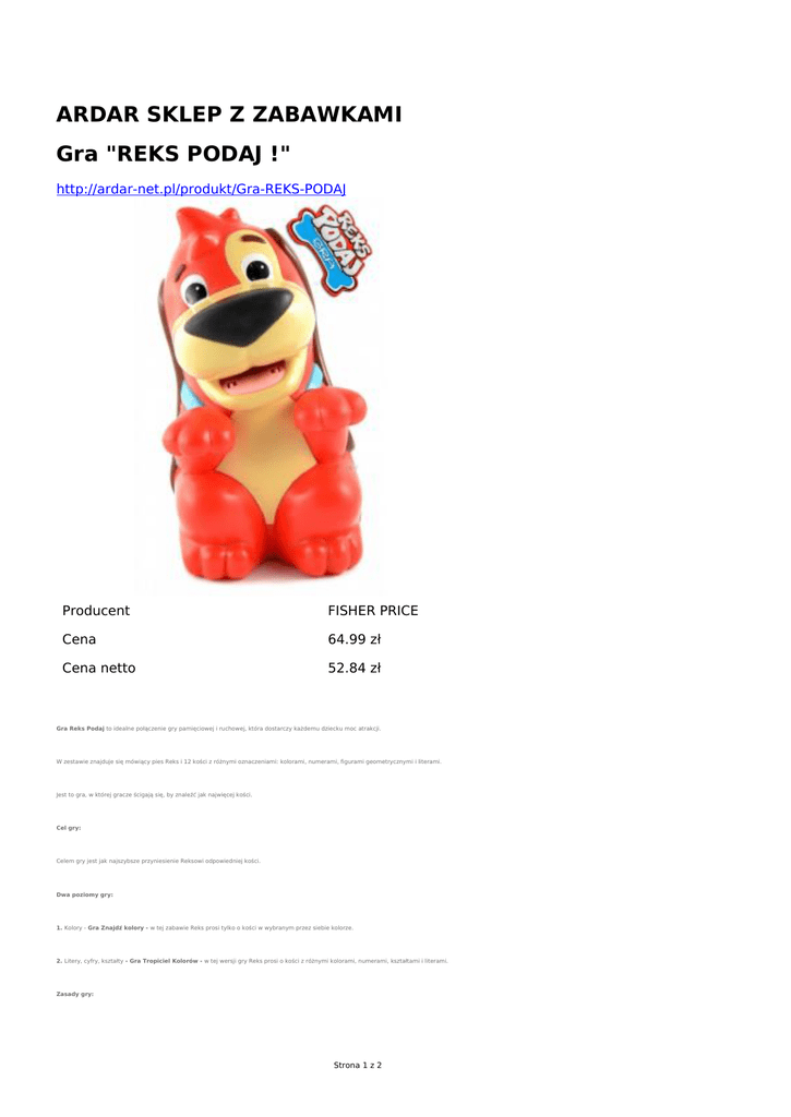 ARDAR SKLEP Z ZABAWKAMI Gra "REKS PODAJ !" http://ardar-net.pl/produkt/Gra-REKS-PODAJ Producent FISHER PRICE Cena 64.99 zł Cena netto 52.84 zł Gra Reks Podaj to idealne połączenie gry pamięciowej i ruchowej, która dostarczy każdemu dziecku moc atrakcji. W zestawie znajduje się mówiący pies Reks i 12 kości z różnymi oznaczeniami: kolorami, numerami, figurami geometrycznymi i literami. Jest to gra, w której gracze ścigają się, by znaleźć jak najwięcej kości. Cel gry: Celem gry jest jak najszybsze przyniesienie Reksowi odpowiedniej kości. Dwa poziomy gry: 1. Kolory - Gra Znajdź kolory - w tej zabawie Reks prosi tylko o kości w wybranym przez siebie kolorze. 2. Litery, cyfry, kształty - Gra Tropiciel Kolorów - w tej wersji gry Reks prosi o kości z różnymi kolorami, numerami, kształtami i literami. Zasady gry: Strona 1 z 2 Grę rozpoczyna najmłodszy z graczy, który naciska nos Reksa, a wszyscy słuchają komendy, na przykład: "Szczeka Reks hau hau byś mu kostkę niebieską dał" lub "Szczeka Reks hau hau byś mu kostkę z literką C dał". Teraz wszyscy uczestnicy gry muszą odnaleźć kość, o którą prosi Reks. Gdy znajdzie niewłaściwą kość odkłada ją z powrotem na miejsce białą stroną do góry, natomiast jeśli jest to właściwa kość biegnie do Reksa i wkłada mu ją do pyska, a piesek odczyta czy jest to kość, o którą prosił. Gdy kość jest właściwa, Reks prosi o znalezienie innej kości. Zakończenie gry: Kiedy zawodnicy łącznie znajdą 9 kości, wygrywa ten, który ma ich najwięcej. ZAWARTOŚĆ: - figurka Reksa - 12 kości - 1 instrukcja WIEK: 3+ WYMIARY: opakowania: 27 x 20 x 14 cm wysokość Reksa: ok 25 cm ZASILANIE: 3 x baterie AA 1,5 V - brak w zestawie Instrukcja użytkowania baterii w Regulaminie. UWAGI: Uwaga, zabawka nieodpowiednia dla dzieci poniżej 3 lat. Zabawka zawiera drobne elementy, które mogą wypadać, być połknięte co grozi uduszeniem a w konsekwencji śmiercią. Strona 2 z 2