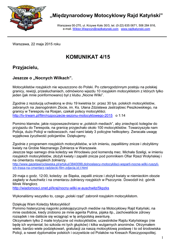 „Międzynarodowy Motocyklowy Rajd Katyński” Warszawa 00-270, ul. Krzywe Koło 30/3, tel. (0-22) 635 0671, 506 284 816, e-mail. [email protected] www.rajdkatynski.com Warszawa, 22 maja 2015 roku KOMUNIKAT 4/15 Przyjacielu, Jeszcze o „Nocnych Wilkach”. Motocyklistów rosyjskich nie wpuszczono do Polski. Po czterogodzinnym postoju na polskiej granicy, rewizji, przesłuchaniach, odmówiono wjazdu 10 rosyjskim motocyklistom z których tylko jeden (jak mnie poinformowano) był z klubu „Nocne Wilki”. Zgodnie z rezolucją uchwaloną w dniu 19 kwietnia br. przez 30 tys. polskich motocyklistów, zebranych na Jasnogórskim Zlocie, im. Ks. Ułana Zdzisława Jastrzębiec Peszkowskiego, na granicy w Terespolu na Rosjan, czekali polscy motocykliści. http://tv-trwam.pl/film/rozpoczecie-sezonu-motocyklowego-2015 o 1:14 Pomimo kłamstw, jakie rozpowszechniano w „polskich mediach”, aby zniechęcić kolegów do przyjazdu do Terespola, na granicę przyjechało około 100 motocyklistów. Towarzyszyła nam Policja, dużo Policji w radiowozach, nad nami latały 3 policyjne helikoptery. Zwracała uwagę wyjątkowa życzliwość policjantów. Dziękujemy. Zgodnie z programem rosyjskich motocyklistów, w ich imieniu, zapaliliśmy znicze i złożyliśmy kwiaty na Grobie Nieznanego Żołnierza w Warszawie. Jeszcze tego samego dnia koledzy we Wrocławiu pod komendą mec. Michała Szeligi, w imieniu rosyjskich motocyklistów, złożyli kwiaty i zapalili znicze pod pomnikiem Ofiar Rzezi Wołyńskiej i na cmentarzu rosyjskich żołnierzy. http://www.gazetawroclawska.pl/artykul/3840099,dolnoslascy-motocyklisci-wsparli-nocne-wilki-ruszyliich-trasa-na-cmentarz-radziecki-film-zdjecia,id,t.html 29 maja o godz. 12:00, koledzy ze Śląska, zapalili znicze i złożyli kwiaty w niemieckim obozie zagłady w Auschwitz i na cmentarzu żołnierzy rosyjskich w Pszczynie. Dowodził inż. górnik Mirek Wenglorz. http://wiadomosci.onet.pl/kraj/nocny-wilki-w-auschwitz/5kpzks Wykonaliśmy wszystko to, czego „polski rząd” zabronił rosyjskim motocyklistom. Dziękuję Wam Koledzy Motocykliści! Pomimo histerycznej nagonki polskojęzycznych mediów na Motocyklowy Rajd Katyński, na mnie osobiście, kiedy zrobiono ze mnie agenta Putina, pijaka itp., zachowaliście zdrowy rozsądek i nie daliście się wciągnąć w tę antypolską awanturę. Otrzymałem tylko 2 maile krytyczne od motocyklistów, uczestników Rajdu Katyńskiego (nie będę ich wymieniał, bo szkoda mi tych głupków) i kilka wulgarnych anonimów. Otrzymałem wiele, bardzo wiele podziękowań, gratulacji za naszą motocyklową postawę i to od środowiska Policji, a nawet dyplomatów polskich i oczywiście od Polaków na Kresach Rzeczypospolitej. 1 Nie jest w polskim interesie konflikt z żadnym z naszych sąsiadów. Podczas II Wojny Światowej, w okupowanej Polsce, Niemcy wydawali w języku polskim gazety. Najbardziej znane to: Nowy Kurier Warszawski, Kurier Częstochowski , Goniec Krakowski, Dziennik Radomski, Goniec Codzienny, Ilustrowany Kurier Polski, Gazeta Lwowska. Polacy nazywali je gadzinówkami. Nie wolno było tego czytać, na Polaków, którzy tam pracowali, sądy Armii Krajowej wydawały wyroki śmierci. Dziś 95% mediów w Polsce jest w obcych rękach. "(...) kąpiemy się przymusowo w mocno zanieczyszczonej wodzie informacji, która ma zmienić myślenie Polaków, bo przecież nikt nie wydaje pieniędzy bezcelowo” o. prof. Mieczysław Albert Krąpiec, Dziś 95% mediów w Polsce to gadzinówki. „Polscy dziennikarze” mają się dobrze. Biorą nas gołymi rękoma. Oznajmiam panom - ze „strefy wolnego słowa”, tym od pana Sakiewicza, Warzechy - tę nowinę, poza agenturą jest życie. Są tacy którzy nie potrzebują oficera prowadzącego, aby podjąć decyzję. Więcej o tym towarzystwie w książce „PRAWICOWE DZIECI, CZYLI BLEF IV RP” - Leszka Misiaka, wydawca http://www.oficyna-aurora.pl Zachęcam też do obejrzenia i przeczytania: http://www.gloria.tv/media/jApw4Mu6RBx http://www.michalkiewicz.pl/tekst.php?tekst=3377 http://pawelkapuscinski.pl/dlaczego-pojechalem-na-przejscie-graniczne-w-terespolu/ Kilka osób pytało mnie dlaczego popieram Grzegorza Brauna. Tu jest odpowiedź: https://www.youtube.com/watch?v=a9blxSYYRz4&index=28&list=WL i jeszcze Max Kolonko mówi jak jest: https://www.youtube.com/watch?v=NWDi66ttZyM 9 maja, na Jasnej Górze, pożegnaliśmy generała pilota Andrzeja Błasika To dla nas zaszczyt i honor - móc przyczynić się do tego, aby prochy polskiego lotnika, Dowódcy Sił Powietrznych Rzeczypospolitej Polskiej generała pilota Andrzeja Błasika spoczęły u stóp Matki Boskiej Częstochowskiej Królowej Polski i Hetmanki Żołnierza Polskiego. Wszak jedną z Jej sukni zdobi biało-czerwona szachownica - znak polskich lotników. Trudno pisać te słowa, wiedząc, że wiele miesięcy czekały, te czcigodne szczątki, na Polaków kochających Boga i Ojczyznę. Oni je odnaleźli, wydobyli ze smoleńskiego błota i przywrócili Ojczyźnie. Dopiero teraz mogą być otulone serdeczną modlitwą żony, dzieci, krewnych, przyjaciół i rzeszy, ogromnej rzeszy Polaków, którzy nigdy nie uwierzyli kłamstwu, a domaganie się prawdy uznają za swą powinność. 2 Panie Generale! Ufamy, że spełniły się słowa poety: „A jeśli komu droga otwarta do Nieba – tym, co służą Ojczyźnie”. Motocykliści Rajdu Katyńskiego 67 lat temu, 25 maja o godz. 21:30, w więzieniu przy ul. Rakowieckiej, komunistyczni zbrodniarze zamordowali najdzielniejszego z dzielnych, Rtm. Witolda Pileckiego. W poniedziałek 25 maja o godz. 21:00 – jak każdego roku, spotykamy się pod murem więziennym przy ulicy Rakowieckiej 37, w Warszawie. 21:30 - wspomnienie o Rotmistrzu, modlitwa, złożenie wieńców, zapalenie zniczy. Zapraszamy wszystkich bardzo serdecznie. Motocykliści zbierają się na Cmentarzu Wojskowym na Powązkach w Warszawie, ul. Powązkowska 43/45 (motocykle parkujemy przed bramą główną od ul. Powązkowskiej, 