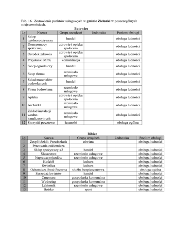 Tab. 16. Zestawienie punktów usługowych w gminie Zielonki w poszczególnych miejscowościach. Batowice Lp Nazwa Grupa urządzeń Jednostka Poziom obsługi Sklep 1 handel obsługa ludności ogólnospożywczy Dom pomocy zdrowie i opieka 2 obsługa ludności społecznej społeczna zdrowie i opieka 3 Ośrodek zdrowia obsługa ludności społeczna 4 Przystanki MPK komunikacja obsługa ludności 5 Sklep ogrodniczy 6 Skup złomu 7 Skład materiałów budowlanych 8 Firma budowlana 9 Apteka 10 Architekt Zakład instalacji 11 wodnokanalizacyjnych 12 Skrzynki pocztowe Lp. 1 2 3 4 5 6 7 8 9 10 11 12 13 handel obsługa ludności rzemiosło usługowe obsługa ludności handel obsługa ludności rzemiosło usługowe zdrowie i opieka społeczna rzemiosło usługowe obsługa ludności obsługa ludności obsługa ludności rzemiosło usługowe obsługa ludności łączność obsługa ogólna Nazwa Zespół Szkół, Przedszkole Pracownia cukiernicza Sklep spożywczy x2 Ślusarstwo Naprawa pojazdów Kościół Świetlica Ochotnicza Straż Pożarna Sprzedaż kwiatów Cmentarz Wodociąg Lakiernik Boisko Bibice Grupa urządzeń oświata handel rzemiosło usługowe rzemiosło usługowe kultura kultura służba bezpieczeństwa handel gospodarka komunalna gospodarka komunalna rzemiosło usługowe sport Jednostka Poziom obsługi obsługa ludności obsługa ludności obsługa ludności obsługa ludności obsługa ludności obsługa ludności obsługa ogólna obsługa ludności obsługa ludności obsługa ludności obsługa ludności obsługa ludności Lp. 1 Lp. 1 2 3 4 5 6 7 8 9 10 11 12 13 14 15 16 17 18 20 21 22 Nazwa Przystanek autobusowy x2 Bosutów Grupa urządzeń Jednostka Poziom obsługi komunikacja obsługa ogólna rzemiosło usługowe obsługa ludności 2 Naprawa pojazdów 3 Skład budowlany handel obsługa ludności 4 Oczyszczalnia ścieków gosp. komunalna obsługa ludności 5 sklep handel obsługa ludności 6 Plac zabaw kultura obsługa ludności 7 OSP Służba bezpieczeństwa obsługa ogólna 8 Magazyn handel obsługa ludności 9 Pętla autobusowa komunikacja obsługa ogólna 10 Ujęcie wody gosp. komunalna obsługa ludności Nazwa Niepubliczny Zakład Opieki Zdrowotnej Świetlica środowiskowa Koło Przyjaciół Brzozówki Dom Przyjęć Przystanek autobusowy x 4 Sklep z urządzeniami Sklep spożywczy x2 Punkt apteczny Punkt skupu owoców Sklep meblowy Restauracja Ogrodzenia betonowe Sprzedaż choinek Naprawa pojazdów Warsztat stolarski Wytwórnia barszczu Usługi minikoparką Warsztat blacharsko lakierniczy Boisko sportowe Parking Kapliczka Brzozówka Grupa urządzeń Jednostka zdrowie i opieka społ. kultura kultura gastronomia komunikacja handel handel zdrowie i opieka społ. skup i zaopatrzenie handel gastronomia handel handel rzemiosło usługowe rzemiosło usługowe Poziom obsługi obsługa ludności obsługa ludności obsługa ludności obsługa ludności obsługa ludności obsługa ludności obsługa ludności obsługa ludności obsługa rolnictwa obsługa ludności obsługa ludności obsługa ludności obsługa ludności obsługa ludności obsługa ludności rzemiosło usługowe rzemiosło usługowe sport Komunikacja kultura obsługa ludności obsługa ludności obsługa ludności obsługa ogólna obsługa ludności Dziekanowice Lp Grupa urządzeń Nazwa 1 Sklep ogólnospożywczy handel 2 Punkt wymiany butli z gazem handel 3 Zakład nasienny POLAN Sp. z.o.o. skup i zaopatrzenie 4 Skrzynki pocztowe łączność Lp Nazwa 1 Szkółka krzewów ozdobnych Garlica Duchowna Grupa urządzeń skup i zaopatrzenie 2 skrzynki pocztowe x2 łączność 3 Hodowla i sprzedaż psów rasowych . 4 Ślusarstwo rzemiosło usługowe 5 Przystanek x4 komunikacja 6 Ogrodnictwo rzemiosło usługowe 7 Wymiana butli gazowych handel 8 SOŁTYS 9 Usługi budowlane administracja publiczna rzemiosło usługowe Jednostka Jednostka Poziom obsługi obsługa ludności obsługa ludności obsługa rolnictwa obsługa ogólna Poziom obsługi obsługa rolnictwa obsługa ogólna obsługa ludności obsługa ludności obsługa ludności obsługa ludności obsługa ogólna obsługa ludności Garlica Murowana Lp. Nazwa Grupa urządzeń 1 Przystanek x3 komunikacja 2 Wylewki maszynowe i bramy elektryczne rzemiosło usługowe 3 Dom przyjęć gastronomia Jednostka Poziom obsługi obsługa ludności obsługa ludności obsługa ludności rzemiosło usługowe 4 Biuro rachunkowe 5 Usługi transportowe 6 Skrzynki pocztowe x4 7 Ochotnicza Straż Pożarna 8 9 inne łączność Zakład doświadczalny Wydziału Ogrodniczego UR Teren ochrony bezpośredniej ujęcia wody podziemnej służba bezpieczeństwa oświata i wychowanie usługi komunalne oświata i wychowanie 10 Plac zabaw 11 Sklep ogólnoprzemysłowy handel 12 Pracownia krawiecka rzemiosło usługowe 13 Świetlica środowiskowa kultura Lp 1 Nazwa Hurtownia warzyw i owoców obsługa ludności Garliczka Grupa urządzeń Jednostka rzemiosło usługowe rzemiosło usługowe 2 Instalacje elektryczne 3 Warsztat samochodowy Lp Nazwa Grębynice Grupa urządzeń 1 Sklep handel 2 OSP 3 Okna 4 Wymiana butli gazowych handel Lp Nazwa Januszowice Grupa urządzeń 1 Sklep motoryzacyjny handel obsługa ogólna obsługa ogólna obsługa ludności obsługa ogólna obsługa ludności obsługa ludności obsługa ludności obsługa ludności Poziom obsługi obsługa ludności obsługa ludności Jednostka służba bezpieczeństwa rzemiosło usługowe Poziom obsługi obsługa ludności obsługa ogólna obsługa ludności obsługa ludności Jednostka Poziom obsługi obsługa ludności rzemiosło usługowe rzemiosło usługowe 2 Serwis powypadkowo naprawczy 3 Wulkanizacja 4 Sklep ogólnospożywczy handel 5 Restauracja gastronomia Lp Nazwa Korzkiew Grupa urządzeń 1 Zamek kultura 2 Szkoła, boisko oświata i wychowanie 3 Ośrodek ZHP turystyka 4 Stadnina koni sport 5 Pensjonat turystyka 6 Kościół kultura 7 Restauracja x2 gastronomia Lp 1 2 3 4 5 6 Nazwa Szkoła podstawowa im. E.Kwiatkowskiego obsługa ludności obs