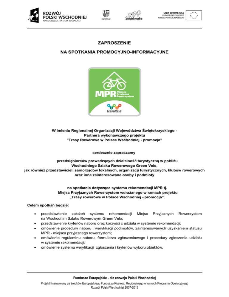 ZAPROSZENIE NA SPOTKANIA PROMOCYJNO-INFORMACYJNE W imieniu Regionalnej Organizacji Województwa Świętokrzyskiego Partnera wykonawczego projektu "Trasy Rowerowe w Polsce Wschodniej - promocja" serdecznie zapraszamy przedsiębiorców prowadzących działalność turystyczną w pobliżu Wschodniego Szlaku Rowerowego Green Velo, jak również przedstawicieli samorządów lokalnych, organizacji turystycznych, klubów rowerowych oraz inne zainteresowane osoby i podmioty na spotkania dotyczące systemu rekomendacji MPR tj. Miejsc Przyjaznych Rowerzystom wdrażanego w ramach projektu „Trasy rowerowe w Polsce Wschodniej - promocja”. Celem spotkań będzie: przedstawienie założeń systemu rekomendacji Miejsc Przyjaznych Rowerzystom na Wschodnim Szlaku Rowerowym Green Velo; przedstawienie kryteriów naboru oraz korzyści z udziału w systemie rekomendacji; omówienie procedury naboru i weryfikacji podmiotów, zainteresowanych uzyskaniem statusu MPR - miejsca przyjaznego rowerzystom; omówienie regulaminu naboru, formularza zgłoszeniowego i procedury zgłoszenia udziału w systemie rekomendacji; omówienie systemu weryfikacji zgłoszenia i kryteriów wyboru obiektów. Fundusze Europejskie - dla rozwoju Polski Wschodniej Projekt finansowany ze środków Europejskiego Funduszu Rozwoju Regionalnego w ramach Programu Operacyjnego Rozwój Polski Wschodniej 2007-2013 Spotkania odbędą się w następujących terminach i miejscach: 18 czerwca 2015 r. godz. 11.00-13.00 SUWAŁKI, Hotel Szyszko, ul. Innowacyjna 3, 16-400 Suwałki 19 czerwca 2015 r. godz. 11.00-13.00 AUGUSTÓW, Hotel Warszawa, ul. Zdrojowa 1, 16-300 Augustów 22 czerwca 2015 r. godz. 11.00-13.00 BIAŁYSTOK, Hotel Esperanto, ul. Legionowa 10, 15-099 Białystok 23 czerwca 2015 r. godz. 11.00-13.00 BIAŁOWIEŻA, Hotel Białowieski, ul. Waszkiewicza 218 B, 17-230 Białowieża Z przyczyn organizacyjnych prosimy o potwierdzenie drogą mailową przybycia na wybrane spotkanie najpóźniej na 1 dzień przed datą wybranego spotkania na adres: [email protected]. Osoba do kontaktu: Magdalena Szalla tel. 665 340006, Kamila Górecka tel. 665 340 005. Fundusze Europejskie - dla rozwoju Polski Wschodniej Projekt finansowany ze środków Europejskiego Funduszu Rozwoju Regionalnego w ramach Programu Operacyjnego Rozwój Polski Wschodniej 2007-2013