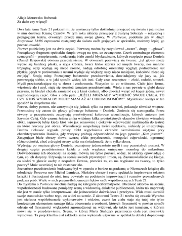 Alicja Morawska-Rubczak Za dużo czy więcej? Dwa lata temu Teatr 21 pokazał mi, że wystarczy tylko dokładniej przyjrzeć się światu i już można w nim dostrzec Krainę Czarów. W tym roku aktorzy pracujący z Justyną Sobczyk – reżyserką i pedagogiem teatru, otworzyli przede mną swoje głowy. W Portrecie, podobnie jak w Alicji. Rozprawie 14/06 zaproszeni zostajemy do świata osób grających w spektaklu, możemy lepiej go poznać, oswoić. Portret podzielony jest na dwie części. Pierwszą można by zatytułować „twarz”, drugą – „głowa”. Początkowy fragment spektaklu skupia uwagę na tym, co zewnętrzne. Czerń centralnego elementu scenografii – przepierzenia, rozdzierają białe zamki błyskawiczne, których rozpięcie przez Daniela (Daniel Krajewski) otwiera przedstawienie. W otworach pojawiają się twarze: „tył głowy może wydać się bardziej płaski, a szyja krótsza, twarz lekko szersza od innych twarzy, nos malutki trójkątny, oczy wydają się nieco skośne, nadają odrobinę orientalny wygląd, podniebienie ust płytkie, język w porównaniu z ustami wydaje się większy, uszy nieco mniejsze, końcówki nieco się zwijają”. Stroją miny. Poznajemy bohaterów przedstawienia, dowiadujemy się jacy są, jak postrzegają siebie, a w jaki sposób widzą ich inni. Cały czas zewnętrze – złość, radość, smutek. Myśli przekształcające się w słowa i zachowania. Wszystko to, co widoczne. Ciało jako forma, więzienie ale i azyl, staje się również tematem przedstawienia. Wielu z nas pewnie w głębi duszy przyzna, że kiedyś chciała zamienić się z kimś ciałami, albo chociaż wziąć od kogoś jedną, nawet najdrobniejszą część. Głos z offu pyta: „JEŻELI MOŻNABY WYMIENIĆ SWOJE CIAŁA, TO CZY KTOŚ WYBRAŁBY MOJE? MAM AŻ 47 CHROMOSOMÓW!”. Myśleliście kiedyś w ten sposób? Ja dotychczas nie. Portret, dobry portret, nie zatrzymuje się jednak tylko na powierzchni, pokazuje również wnętrze. Przenosimy się zatem do głowy głównego bohatera – Daniela. Zmienia się scenografia. Przez otwory w przepierzeniu zaczynają prześwitywać kolorowe wizualizacje, których autorem jest Szymon Celej. Gdy czarna ściana znika widzimy kilka prostokątnych ekranów (świetny wizualnie efekt, naprawdę lubię kiedy ktoś wie jak sensownie i ciekawie wprowadzić multimedia do teatru) na które rzucony jest obraz. Wizualizacje uzupełniają treści spektaklu, niekiedy je interpretują. Bardzo ciekawie wypada prosty efekt wypełnienia ekranów określeniami użytymi przy charakteryzowaniu Daniela, gdy wszyscy próbują odpowiedzieć na jego pytanie: „Kim jestem?”. Zasypujące białe obrazy słowa tworzą efekt przytłoczenia, mnogości odpowiedzi, ogromnej różnorodności, choć z drugiej strony widz ma świadomość, że to tylko słowa. Wędrując po wnętrzu głowy Daniela, poznajemy jednocześnie myśli i sny pozostałych postaci. W drugiej części przedstawienia każda z nich wygłasza oniryczny monolog do mikrofonu. Doświadczamy ich obecności na scenie, mówią nie tylko postaci, widać, że aktorzy opowiadają o tym, co ich dotyczy. Używają na scenie swoich prywatnych imion, są. Zastanawialiście się kiedyś, co siedzi w głowie osoby z zespołem Downa, przecież to, co ma wypisane na twarzy, to tylko pozory? Mnie wcześniej to nie zastanawiało. Scenariusz przedstawienia budowany był w oparciu o bardzo nagradzaną w Niemczech książkę dla młodzieży Burzowa noc Michel Lemieux. Niektóre obrazy i sceny spektaklu inspirowane tekstem książki i ilustracjami do niej, inne powstały na podstawie improwizacji i rozmów prowadzonych podczas prób. Wiele w nich przemyśleń, emocji i lęków osób współtworzących Teatr 21. Do myślenia o Portrecie świetnie nadają się kategorie performatywne. Obecność aktorów na scenie, współzależności budowane pomiędzy sceną a widownią, działanie publiczności, która tak naprawdę nie jest w stanie tylko interpretować, ale jednocześnie doświadcza i przeżywa. Widz musi określić swoje stanowisko wobec tego, co widzi na scenie. Z aktorami Teatru 21 trzeba się oswoić.Wyraźna jest cielesna współobecność wykonawców i widzów, zwrot ku ciału staje się tutaj nie tylko koniecznym elementem samego faktu obcowania z osobami, których fizyczność w pewien sposób odstaje od fizyczności większości zgromadzonej na widowni, ale także jest tematem, o którym mówi się w przedstawieniu. Scena, w której Marta Stańczyk przymierza ciała jest niezwykle wymowna. Ta projektantka ciał (aktorka sama wykonała używane w spektaklu detale) dopasowuje kolejne elementy do głowy głównego bohatera. Następuje gra z fizycznością, tożsamością, ale i chorobą aktorów. Możemy myśleć tutaj o specyficznie pojmowanej kategorii queer, zagarniającej początkowo to wszystko co dziwaczne i inne, zarezerwowanej współcześnie raczej dla myślenia o seksualności. Ciekawie funkcjonuje na tym obszarze również pojęcie subwersji, którą możemy użyć do myślenia także o płciowości osób niepełnosprawnych, co skłania do ciągłego przemyślania, rekonstruowania i rekontekstualizowania pozycji ich fizyczności wyznaczanej przez normy społeczne. Na obszarze spektaklu funkcjonują również elementy estetyki antybinarnej. Nie możemy rozstrzygnąć, czy aktorzy są ładni czy brzydcy, czy grają czy są sobą, czy my mamy prawo do katharsis czy terapia zarezerwowana jest dla tych, którzy są na scenie? W jednej ze scen, w której Marta Stańczyk nie chciała grać stworzona została dla niej specjalna „strefa niegrania”. Nierozstrzygalność staje się tutaj motorem i siłą spektaklu. Nikt nie próbuje nam wmówić jak powinniśmy się czuć kiedy oglądamy Portret, niezabroniona jest litość, złość, radość, próba zrozumienia, niemożność akceptacji. Wyeksploatowana zostaje kategoria „między”, wszystko to, co na granicy pomiędzy chorobą/zdrow
