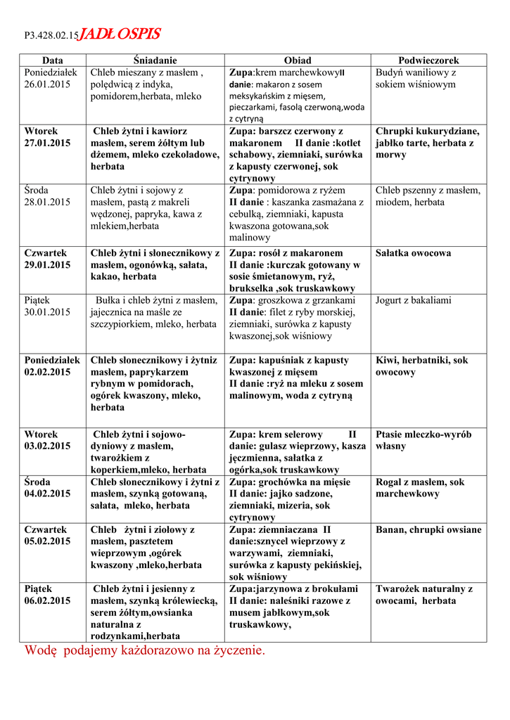 P3.428.02.15JADŁOSPIS Data Poniedziałek 26.01.2015 Śniadanie Chleb mieszany z masłem , polędwicą z indyka, pomidorem,herbata, mleko Wtorek 27.01.2015 Chleb żytni i kawiorz masłem, serem żółtym lub dżemem, mleko czekoladowe, herbata Obiad Zupa:krem marchewkowyII danie: makaron z sosem meksykaoskim z mięsem, pieczarkami, fasolą czerwoną,woda z cytryną Podwieczorek Budyń waniliowy z sokiem wiśniowym Zupa: barszcz czerwony z makaronem II danie :kotlet schabowy, ziemniaki, surówka z kapusty czerwonej, sok cytrynowy Chleb żytni i sojowy z Zupa: pomidorowa z ryżem masłem, pastą z makreli II danie : kaszanka zasmażana z wędzonej, papryka, kawa z cebulką, ziemniaki, kapusta mlekiem,herbata kwaszona gotowana,sok malinowy Chleb żytni i słonecznikowy z Zupa: rosół z makaronem masłem, ogonówką, sałata, II danie :kurczak gotowany w kakao, herbata sosie śmietanowym, ryż, brukselka ,sok truskawkowy Bułka i chleb żytni z masłem, Zupa: groszkowa z grzankami jajecznica na maśle ze II danie: filet z ryby morskiej, szczypiorkiem, mleko, herbata ziemniaki, surówka z kapusty kwaszonej,sok wiśniowy Chrupki kukurydziane, jabłko tarte, herbata z morwy Poniedziałek 02.02.2015 Chleb słonecznikowy i żytniz masłem, paprykarzem rybnym w pomidorach, ogórek kwaszony, mleko, herbata Zupa: kapuśniak z kapusty kwaszonej z mięsem II danie :ryż na mleku z sosem malinowym, woda z cytryną Kiwi, herbatniki, sok owocowy Wtorek 03.02.2015 Chleb żytni i sojowodyniowy z masłem, twarożkiem z koperkiem,mleko, herbata Chleb słonecznikowy i żytni z masłem, szynką gotowaną, sałata, mleko, herbata Zupa: krem selerowy II danie: gulasz wieprzowy, kasza jęczmienna, sałatka z ogórka,sok truskawkowy Zupa: grochówka na mięsie II danie: jajko sadzone, ziemniaki, mizeria, sok cytrynowy Zupa: ziemniaczana II danie:sznycel wieprzowy z warzywami, ziemniaki, surówka z kapusty pekińskiej, sok wiśniowy Zupa:jarzynowa z brokułami II danie: naleśniki razowe z musem jabłkowym,sok truskawkowy, Ptasie mleczko-wyrób własny Środa 28.01.2015 Czwartek 29.01.2015 Piątek 30.01.2015 Środa 04.02.2015 Czwartek 05.02.2015 Chleb żytni i ziołowy z masłem, pasztetem wieprzowym ,ogórek kwaszony ,mleko,herbata Piątek 06.02.2015 Chleb żytni i jesienny z masłem, szynką królewiecką, serem żółtym,owsianka naturalna z rodzynkami,herbata Wodę podajemy każdorazowo na życzenie. Chleb pszenny z masłem, miodem, herbata Sałatka owocowa Jogurt z bakaliami Rogal z masłem, sok marchewkowy Banan, chrupki owsiane Twarożek naturalny z owocami, herbata