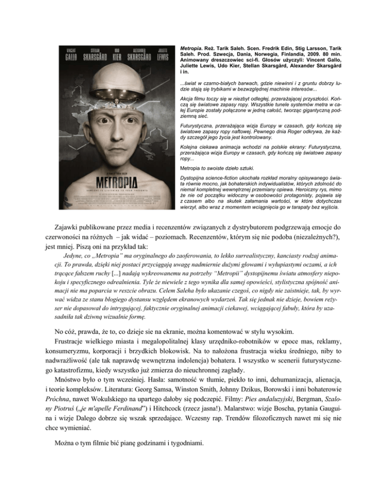 Metropia. Reż. Tarik Saleh. Scen. Fredrik Edin, Stig Larsson, Tarik Saleh. Prod. Szwecja, Dania, Norwegia, Finlandia, 2009. 80 min. Animowany dreszczowiec sci-fi. Głosów użyczyli: Vincent Gallo, Juliette Lewis, Udo Kier, Stellan Skarsgård, Alexander Skarsgård i in. ...świat w czarno-białych barwach, gdzie niewinni i z gruntu dobrzy ludzie stają się trybikami w bezwzględnej machinie interesów... Akcja filmu toczy się w niezbyt odległej, przerażającej przyszłości. Kończą się światowe zapasy ropy. Wszystkie tunele systemów metra w całej Europie zostały połączone w jedną całość, tworząc gigantyczną podziemną sieć. Futurystyczna, przerażająca wizja Europy w czasach, gdy kończą się światowe zapasy ropy naftowej. Pewnego dnia Roger odkrywa, że każdy szczegół jego życia jest kontrolowany. Kolejna ciekawa animacja wchodzi na polskie ekrany: Futurystyczna, przerażająca wizja Europy w czasach, gdy kończą się światowe zapasy ropy... Metropia to swoiste dzieło sztuki. Dystopijna science-fiction ukochała rozkład moralny opisywanego świata równie mocno, jak bohaterskich indywidualistów, których zdolność do niemal kompletnej wewnętrznej przemiany opiewa. Heroiczny rys, mimo że nie od początku widoczny w osobowości protagonisty, pojawia się z czasem albo na skutek załamania wartości, w które dotychczas wierzył, albo wraz z momentem wciągnięcia go w tarapaty bez wyjścia. Zajawki publikowane przez media i recenzentów związanych z dystrybutorem podgrzewają emocje do czerwoności na różnych – jak widać – poziomach. Recenzentów, którym się nie podoba (niezależnych?), jest mniej. Piszą oni na przykład tak: Jedyne, co „Metropia” ma oryginalnego do zaoferowania, to lekko surrealistyczny, kanciasty rodzaj animacji. To prawda, dzięki niej postaci przyciągają uwagę nadmiernie dużymi głowami i wyłupiastymi oczami, a ich trącące fałszem ruchy [...] nadają wykreowanemu na potrzeby “Metropii” dystopijnemu światu atmosfery niepokoju i specyficznego odrealnienia. Tyle że niewiele z tego wynika dla samej opowieści, stylistyczna spójność animacji nie ma poparcia w reszcie obrazu. Celem Saleha było ukazanie czegoś, co nigdy nie zaistnieje, tak, by wyrwać widza ze stanu błogiego dystansu względem ekranowych wydarzeń. Tak się jednak nie dzieje, bowiem reżyser nie dopasował do intrygującej, faktycznie oryginalnej animacji ciekawej, wciągającej fabuły, która by uzasadniła tak dziwną wizualnie formę. No cóż, prawda, że to, co dzieje sie na ekranie, można komentować w stylu wysokim. Frustracje wielkiego miasta i megalopolitalnej klasy urzędniko-robotników w epoce mas, reklamy, konsumeryzmu, korporacji i brzydkich blokowisk. Na to nałożona frustracja wieku średniego, niby to nadwrażliwość (ale tak naprawdę wewnętrzna indolencja) bohatera. I wszystko w scenerii futurystycznego katastrofizmu, kiedy wszystko już zmierza do nieuchronnej zagłady. Mnóstwo było o tym wcześniej. Hasła: samotność w tłumie, piekło to inni, dehumanizacja, alienacja, i teorie kompleksów. Literatura: Georg Samsa, Winston Smith, Johnny Dzikus, Borowski i inni bohaterowie Próchna, nawet Wokulskiego na upartego dałoby się podczepić. Filmy: Pies andaluzyjski, Bergman, Szalony Piotruś („je m'apelle Ferdinand”) i Hitchcock (rzecz jasna!). Malarstwo: wizje Boscha, pytania Gauguina i wizje Dalego dobrze się wszak sprzedające. Wczesny rap. Trendów filozoficznych nawet mi się nie chce wymieniać. Można o tym filmie bić pianę godzinami i tygodniami. Można też nie zaprzątać sobie tym głowy i robić swoje, zwłaszcza gdy się ma świadomość, iż nic w tym nowego poza formą i nazwą, czyli etykietką i opakowaniem. Zawsze powoduje nami jakaś siła, coś jest większe od nas. Kiedyś to była burza z piorunami, potem siła faraonów i moc Amona-Ra, później egzystencja. Teraz śledzi nas Wielki Brat i wciska szampon. Gdybym mieszkał w skandynawskim klimacie, pewnie bym myślał podobnie, może nawet bym miał manię samobójczą, której taka dyskusja sprzyjałaby jak najbardziej. Ale na szczęście tam nie mieszkam. I jakoś nie mogę się powstrzymać od zejścia do poziomu najniższego, dużo bardziej wg mnie przydatnego do rozszyfrowania – gdyby tu było co do rozszyfrowywania – całości. Film bowiem, bez żadnych zahamowań, wali widza po oczach stereotypami, jakby wyjętymi z podręcznika „Freudyzm dla początkujących”. Stereotypem jest bowiem informacja, że facet, który śpi na stałe z kobiecą Mulatką o dużych piersiach, podświadomie – a później jak najbardziej świadomie – będzie tęsknił do apodyktycznej deskowatej blondynki. Gdyby zaś miał co noc w łóżku Zimny Blond Płomień Szwecji, jego id po jakimś czasie zacznie się ślinić na widok Czekoladek. A później, po zaspokojeniu chuci, która wszak była na początku, wróci skruszony na przypisane mu łono. Reżyser nie stara się nawet tego ukryć. Blond bimbo z szamponu już w czwartej minucie odbiera głównemu bohaterowi ochotę na czekoladową Wenus. W związku z tym bohater zaczyna świrować. Wreszcie w 54 minucie ląduje z negatywem swojej kobiety w hotelu celem kopulacji. Przez 50 minut wiadomo, że chodzi o libido i coitus, ale reżyser i scenarzyści muszą sobie pogadać. Żeby było inteligentniej i nie tak, że od razu stosunek; jak w dowcipie o milicjantach: najpierw o literaturze. Do tego, by dowartościować płacącą za bilety klasę średnią, reżyser ze scenarzystą wydumali bohatera niby to inteligentnego, ale który, tak naprawdę, jest jednym z masy, bez zainteresowań, reagującym jak reszta pogańskiej dziczy strasznych mieszczan i podlega przede wszystkim biologii. Któremu do głowy nawet nie wpadnie, że można po prostu wyłączyć telewizor i – po prostu – coś sobie poczytać. Cały ten filmowy intelektualizm robi wrażenie sosu béarnaise, którym polano kaszankę 