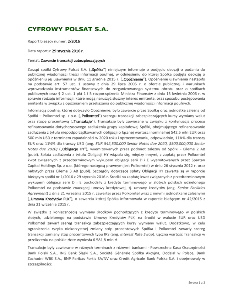 CYFROWY POLSAT S.A. Raport bieżący numer: 2/2016 Data raportu: 29 stycznia 2016 r. Temat: Zawarcie transakcji zabezpieczających Zarząd spółki Cyfrowy Polsat S.A. („Spółka”) niniejszym informuje o podjęciu decyzji o podaniu do publicznej wiadomości treści informacji poufnej, w odniesieniu do której Spółka podjęła decyzję o opóźnieniu jej ujawnienia w dniu 11 grudnia 2015 r. („Opóźnienie”). Opóźnienie ujawnienia nastąpiło na podstawie art. 57 ust. 1 ustawy z dnia 29 lipca 2005 r. o ofercie publicznej i warunkach wprowadzania instrumentów finansowych do zorganizowanego systemu obrotu oraz o spółkach publicznych oraz § 2 ust. 1 pkt 1 i 5 rozporządzenia Ministra Finansów z dnia 13 kwietnia 2006 r. w sprawie rodzaju informacji, które mogą naruszyć słuszny interes emitenta, oraz sposobu postępowania emitenta w związku z opóźnianiem przekazania do publicznej wiadomości informacji poufnych. Informacją poufną, której dotyczyło Opóźnienie, było zawarcie przez Spółkę oraz jednostkę zależną od Spółki – Polkomtel sp. z o.o. („Polkomtel”) szeregu transakcji zabezpieczających kursy wymiany walut oraz stopę procentową („Transakcje”). Transakcje były zawierane w związku z kontynuacją procesu refinansowania dotychczasowego zadłużenia grupy kapitałowej Spółki, obejmującego refinansowanie zadłużenia z tytułu niepodporządkowanych obligacji o łącznej wartości nominalnej 542,5 mln EUR oraz 500 mln USD z terminem zapadalności w 2020 roku i oprocentowaniu, odpowiednio, 11¾% dla transzy EUR oraz 11⅝% dla transzy USD (ang. EUR 542,500,000 Senior Notes due 2020, $500,000,000 Senior Notes due 2020) („Obligacje HY”), wyemitowanych przez podmiot zależny od Spółki - Eileme 2 AB (publ). Spłata zadłużenia z tytułu Obligacji HY wiązała się, między innymi, z zapłatą przez Polkomtel kwot związanych z przedterminowym wykupem obligacji serii D i E wyemitowanych przez Spartan Capital Holdings Sp. z o.o. (którego następcą prawnym jest Polkomtel) w dniu 26 stycznia 2012 r. oraz nabytych przez Eileme 3 AB (publ). Szczegóły dotyczące spłaty Obligacji HY zawarte są w raporcie bieżącym spółki nr 1/2016 z 29 stycznia 2016 r. Środki na zapłatę kwot związanych z przedterminowym wykupem obligacji serii D i E pochodziły z kredytu terminowego w złotych polskich udzielonego Polkomtel na podstawie znaczącej umowy kredytowej, tj. umowy kredytów (ang. Senior Facilities Agreement) z dnia 21 września 2015 r. zawartej przez Polkomtel wraz z innymi jednostkami zależnymi („Umowa Kredytów PLK”), o zawarciu której Spółka informowała w raporcie bieżącym nr 42/2015 z dnia 21 września 2015 r. W związku z koniecznością wymiany środków pochodzących z kredytu terminowego w polskich złotych, udzielonego na podstawie Umowy Kredytów PLK, na środki w walucie EUR oraz USD Polkomtel zawarł szereg transakcji zabezpieczających kursy wymiany walut. Dodatkowo, w celu ograniczenia ryzyka niekorzystnej zmiany stóp procentowych Spółka i Polkomtel zawarły szereg transakcji zamiany stóp procentowych typu IRS (ang. Interest Rate Swap). Łączna wartość Transakcji w przeliczeniu na polskie złote wyniosła 6.581,8 mln zł. Transakcje były zawierane w różnych terminach z różnymi bankami - Powszechna Kasa Oszczędności Bank Polski S.A., ING Bank Śląski S.A., Société Générale Spółka Akcyjna, Oddział w Polsce, Bank Zachodni WBK S.A., BNP Paribas Fortis SA/NV oraz Credit Agricole Bank Polska S.A. i obejmowały w szczególności: Strona 1 z 2 (i) transakcje walutowe typu forward na USD o łącznej wartości 529,0 mln USD (2.109,2 mln zł), z terminem rozliczenia ustalonym na dzień 27 stycznia 2016 r. i średnim kursem wymiany na poziomie 3,9872 PLN/USD, (ii) transakcje walutowe typu forward na EUR o łącznej wartości 570,0 mln EUR (2.472,6 mln zł), z terminem rozliczenia ustalonym na dzień 27 stycznia 2016 r. i średnim kursem wymiany na poziomie 4,3378 PLN/EUR oraz (iii) transakcje zamiany stóp procentowych typu IRS (ang. Interest Rate Swap) o łącznej wartości 2.000,0 mln zł, polegających na zamianie płatności odsetek opartych o zmienną stopę procentową WIBOR 3M na płatność odsetek opartych o stałą stopę procentową w średniej wysokości 1,553%.Transakcje zostały zawarte na okres od 30 czerwca 2016 r. do 30 września 2017 r. Wszystkie wyżej opisane Transakcje są oparte na bieżących warunkach rynkowych, nieodbiegających od ogólnie przyjętych dla tego typu transakcji. Transakcje zostały uznane za znaczące ze względu na fakt, że ich łączna wartość oraz wartość Transakcji z każdym z następujących podmiotów: Powszechna Kasa Oszczędności Bank Polski S.A., ING Bank Śląski S.A., Société Générale Spółka Akcyjna, Oddział w Polsce i Bank Zachodni WBK S.A. przekroczyła 10% przychodów grupy kapitałowej Spółki za ostatnie cztery kwartały obrotowe. Podstawa prawna: Art. 56 ust. 1 pkt 1 oraz pkt 2 ustawy o ofercie publicznej i warunkach wprowadzania instrumentów finansowych do zorganizowanego systemu obrotu oraz o spółkach publicznych w związku z§ 5 ust. 1 pkt 3 rozporządzenia Ministra Finansów z dnia 19 lutego 2009 r. w sprawie informacji bieżących i okresowych przekazywanych przez emitentów papierów wartościowych oraz warunków uznawania za równoważne informacji wymaganych przepisami prawa państwa niebędącego państwem członkowskim. Podpisano przez: /p/ Tobias Solorz Tobias Solorz Prezes Zarządu Strona 2 z 2