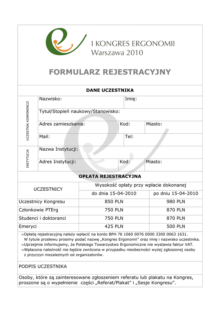 FORMULARZ REJESTRACYJNY DANE UCZESTNIKA UCZESTNIK KONFERENCJI Nazwisko: Imię: Tytuł/Stopień naukowy/Stanowisko: Adres zamieszkania: Kod: Mail: Miasto: Tel: INSTYTUCJA Nazwa Instytucji: Adres Instytucji: Kod: Miasto: OPŁATA REJESTRACYJNA UCZESTNICY Wysokość opłaty przy wpłacie dokonanej do dnia 15-04-2010 po dniu 15-04-2010 Uczestnicy Kongresu 850 PLN 980 PLN Członkowie PTErg 750 PLN 870 PLN Studenci i doktoranci 750 PLN 870 PLN Emeryci 425 PLN 500 PLN • Opłatę rejestracyjną naleŜy wpłacić na konto BPH 76 1060 0076 0000 3300 0063 1631. W tytule przelewu prosimy podać nazwę „Kongres Ergonomii” oraz imię i nazwisko uczestnika. • Uprzejmie informujemy, Ŝe Polskiego Towarzystwo Ergonomiczne nie wystawia faktur VAT. • Wpłacona naleŜność nie będzie zwrócona w przypadku nieobecności wyŜej zgłoszonej osoby z przyczyn niezaleŜnych od organizatorów. PODPIS UCZESTNIKA Osoby, które są zainteresowane zgłoszeniem referatu lub plakatu na Kongres, proszone są o wypełnienie części „Referat/Plakat” i „Sesje Kongresu”. REFERAT/PLAKAT Tytuł: Autor/Autorzy: SESJE KONGRESU Proponowana sesja umieszczenia referatu* □ ERGONOMIA ŚRODOWISKA PRACY □ ERGONOMIA WYROBU □ ERGONOMIA POZNAWCZA □ INśYNIERIA ERGONOMICZNA □ ERGONOMIA W PROJEKTOWANIU DLA OSÓB Z NIEPEŁNOSPRAWNOŚCIAMI I REHABILITACJI □ ERGONOMIA ŚRODOWISKA DZIECI I MŁODZIEśY □ EDUKACJA W ZAKRESIE ERGONOMII □ ERGONOMIA W DZIAŁALNOŚCI ARCHITEKTONICZNO-BUDOWLANEJ □ ERGONOMIA W MEDYCYNIE I STOMATOLOGII □ ERGONOMIA W ROLNICTWIE I LEŚNICTWIE □ ERGONOMIA W INFORMATYCE □ ERGONOMIA W ZARZĄDZANIU PRZEDSIĘBIORSTWEM □ EKONOMICZNO-SPOŁECZNE I EKOLOGICZNE ASPEKTY ERGONOMII □ DOLEGLIWOŚCI MIĘŚNIOWO-SZKIELETOWE UWARUNKOWANE PRACĄ □ SESJA PLAKATOWA * właściwe zaznaczyć WARSZTATY NIE TAK* Deklarowany udział w warsztacie* □ Dolegliwości mięśniowo-szkieletowe, ocena ryzyka i metody profilaktyki □ Mikroklimat środowiska pracy - ocena ryzyka i metody profilaktyki □ Metody oceny zagroŜeń mięśniowo-szkieletowych spowodowanych sposobem wykonywania pracy □ Antropometryczne kształtowanie stanowiska pracy □ Wykorzystanie metod poprawy produktywności w BHP □ Medyczne skutki zagroŜeń cyberprzestrzeni □ Prawne aspekty patologii społecznych w sieci □ ZagroŜenia cyberprzestrzeni w świadomości społecznej □ ZagroŜenia wychowawcze świata wirtualnego Opłata za warsztaty jest niezaleŜna od opłaty rejestracyjnej i wynosi 250zł. Warsztaty zostaną zorganizowane w dniu poprzedzającym Kongres, tj. 19 września 2010r. BliŜsze informacje o warsztatach znajdują się na stronie internetowej www.kongres2010ergonomia.pl. * właściwe zaznaczyć